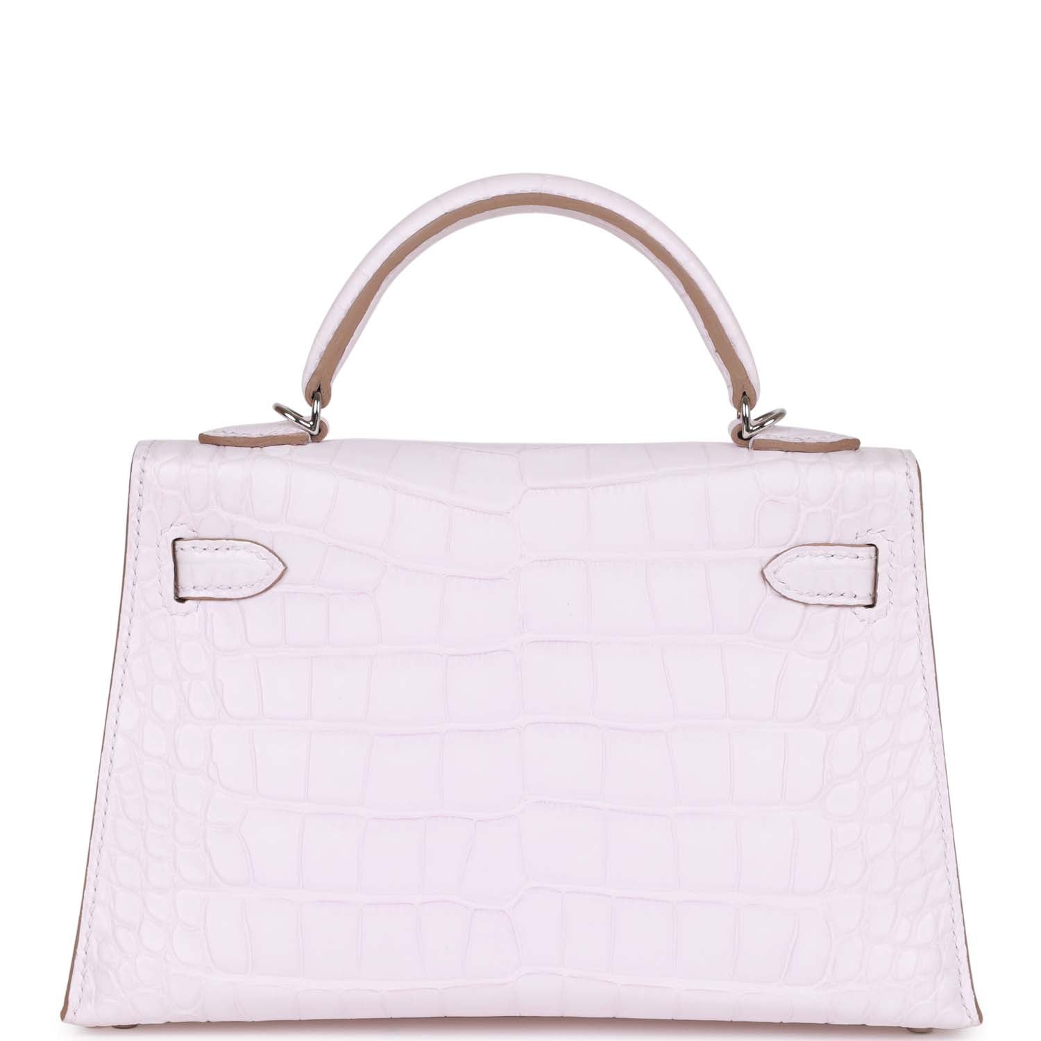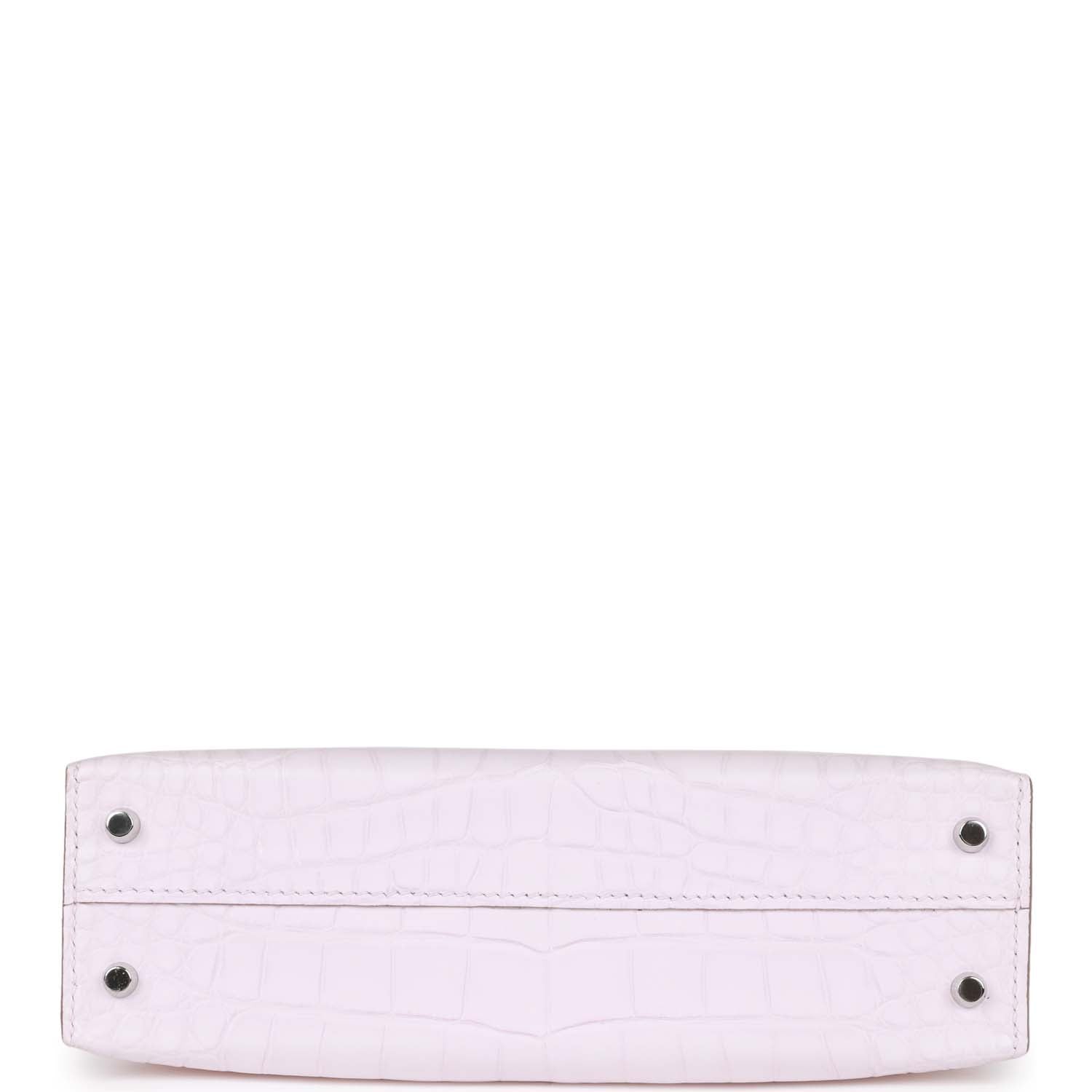 This Kelly, in the Sellier style, is in Mauve Pale satin boreal alligator leather with palladium hardware and has tonal stitching, two straps with front toggle closure, single rolled handle and removable shoulder strap.