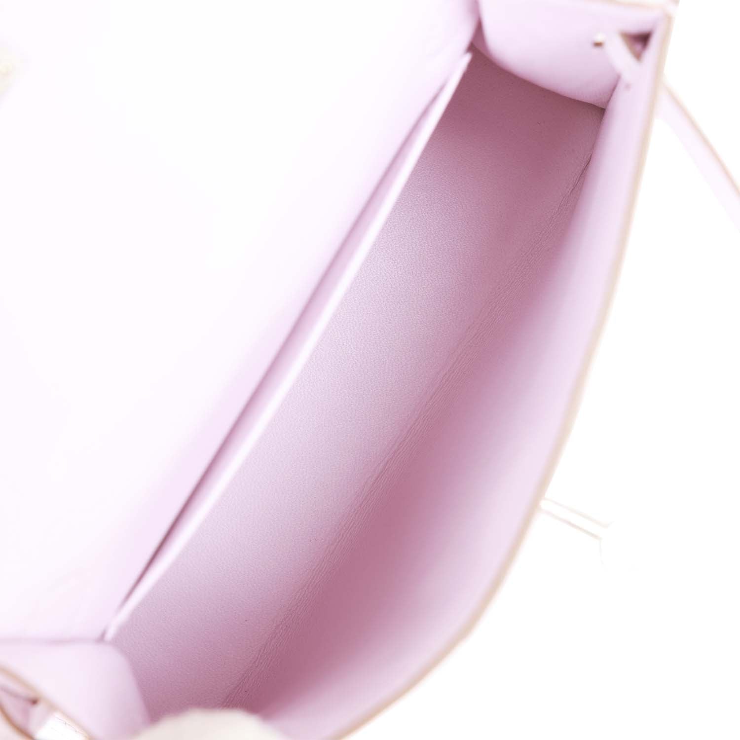 The interior is lined with Mauve Pale lambskin leather and has one open pocket on the back wall.