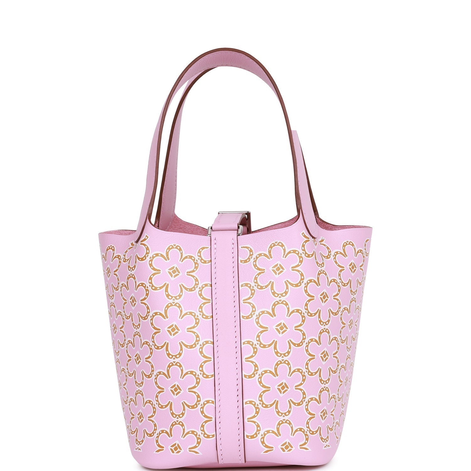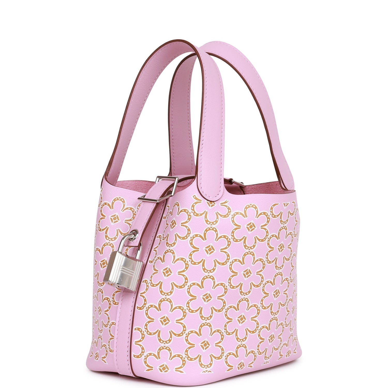 This limited edition "Lucky Daisy" Picotin Lock is in Mauve Sylvestre swift leather with palladium hardware and has tonal stitching with two top handles.