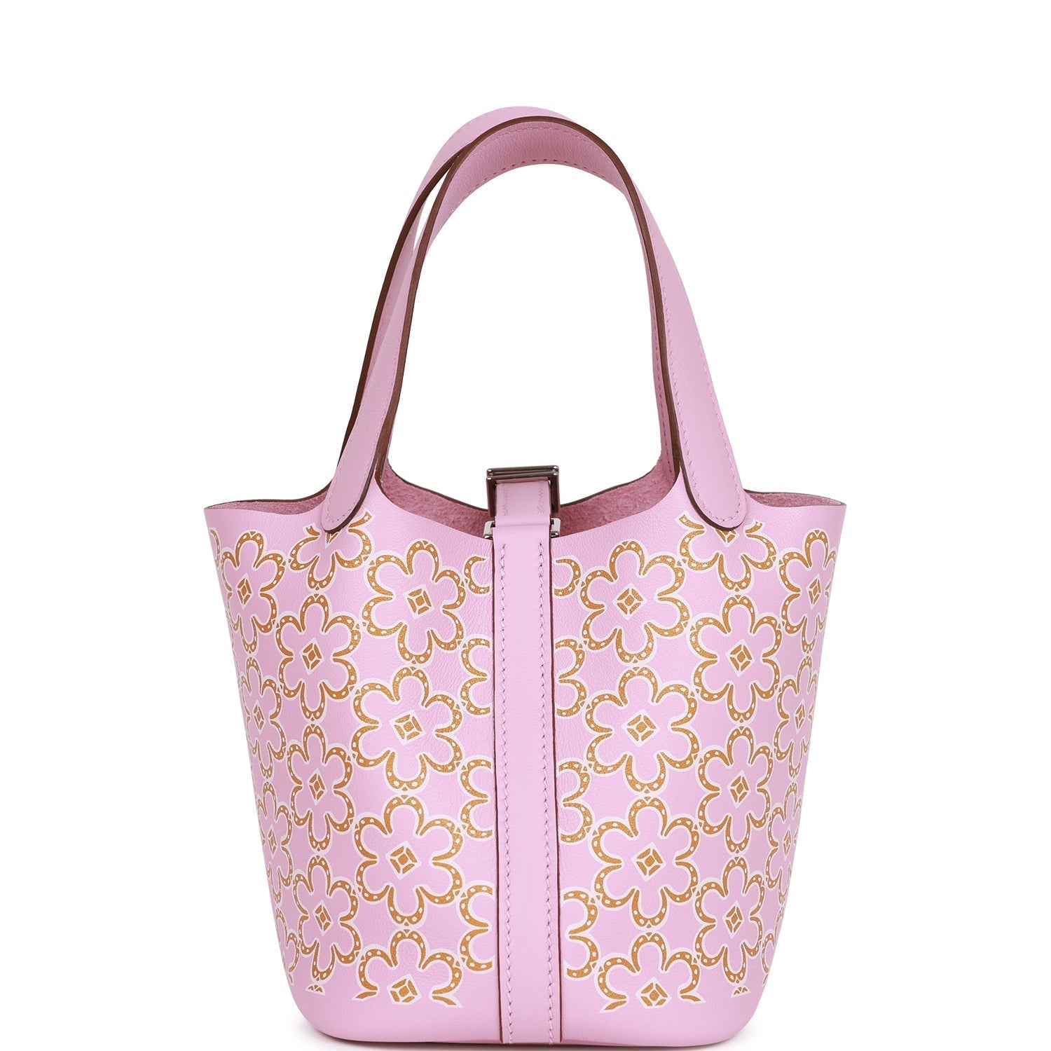 This limited edition "Lucky Daisy" Picotin Lock is in Mauve Sylvestre swift leather with palladium hardware and has tonal stitching with two top handles.