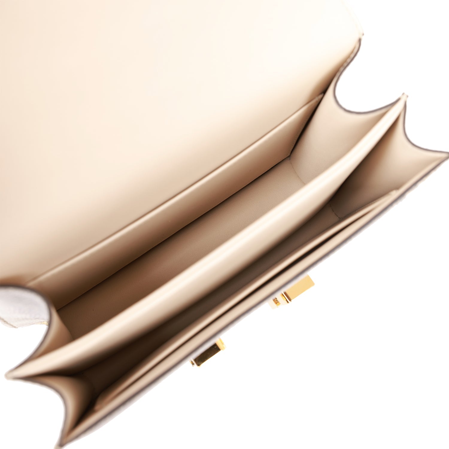 The interior is lined with Parchemin chevre and has an open pocket on the front wall, a center divide, and an open pocket on the back wall.