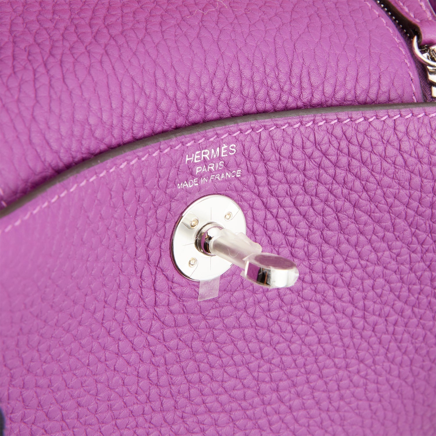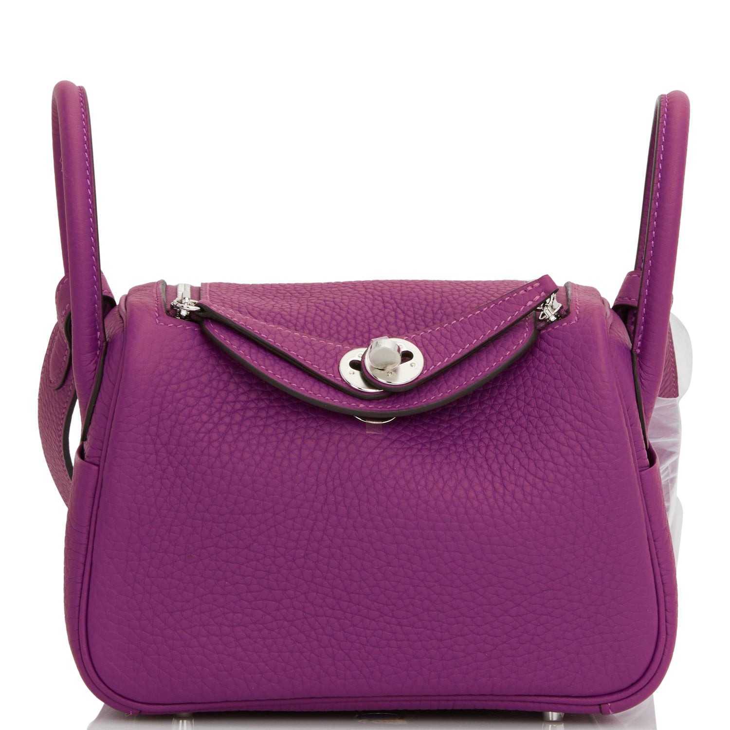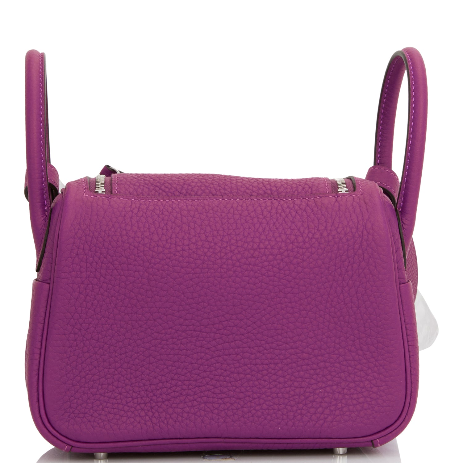 This Mini Lindy is in Anemone clemence leather with palladium hardware and has tonal stitching, double zipper pulls, front Hermès twist lock, single pocket on each side, two rolled top handles linked by a flat shoulder strap.