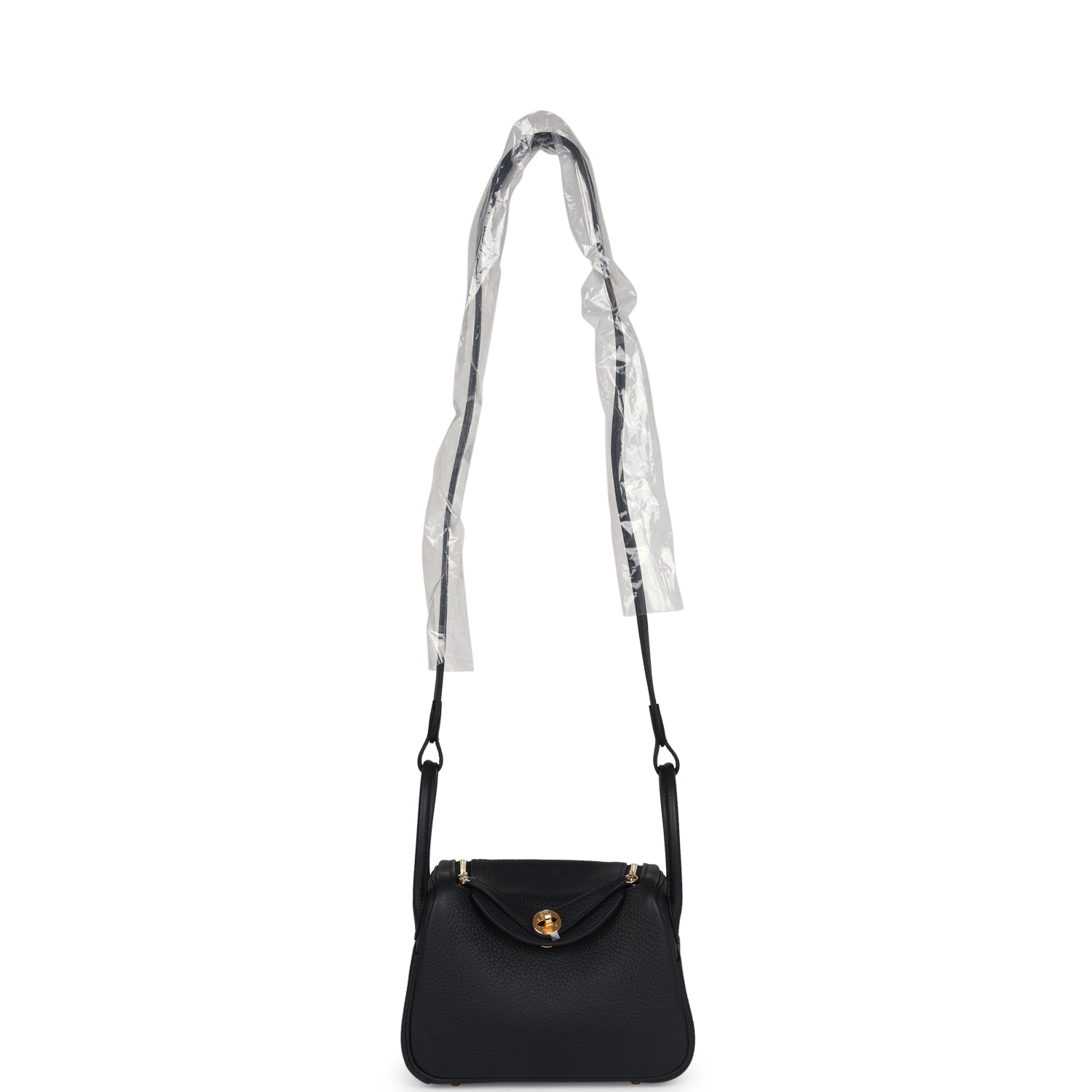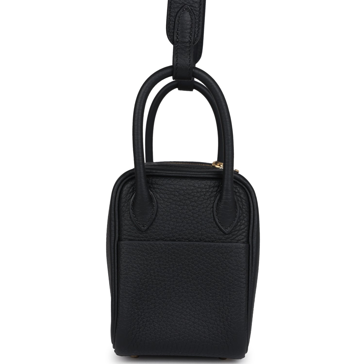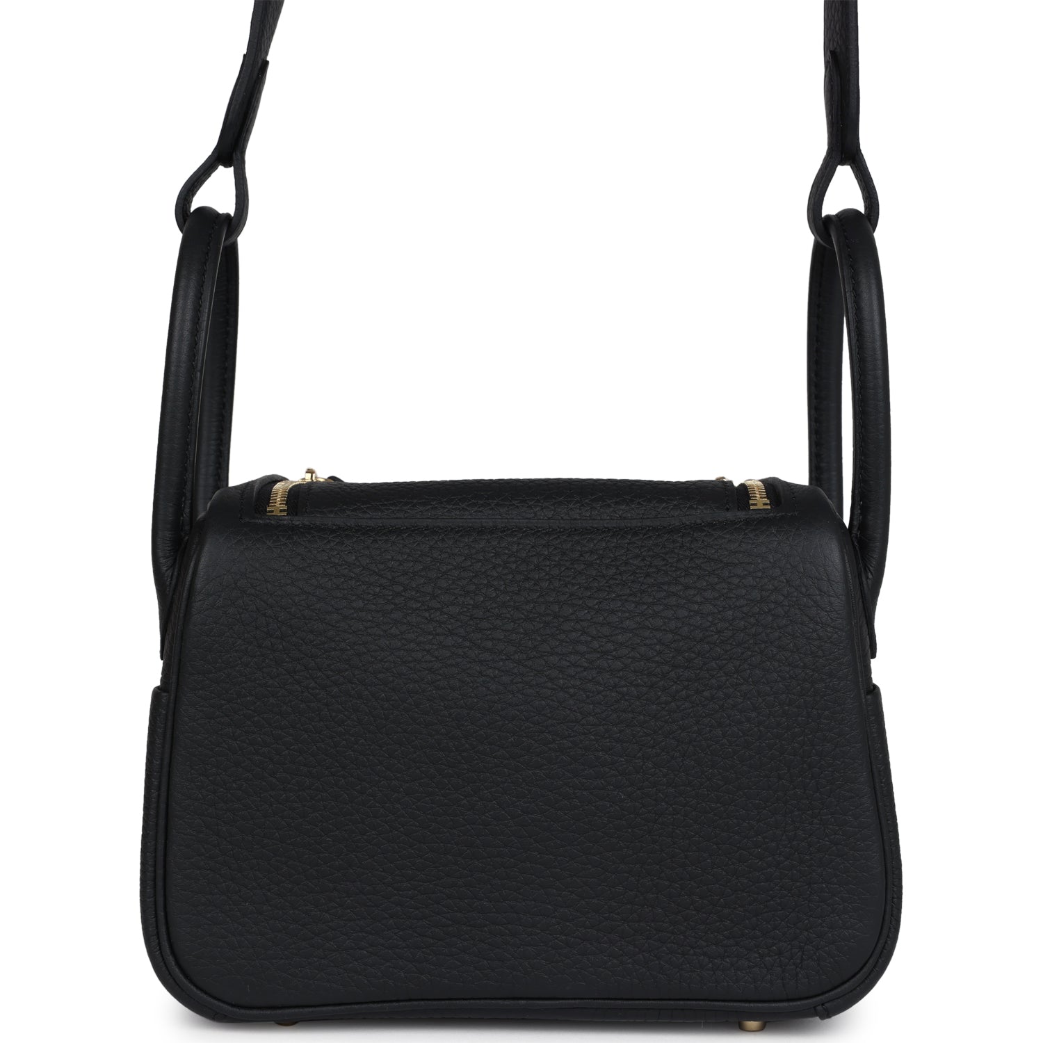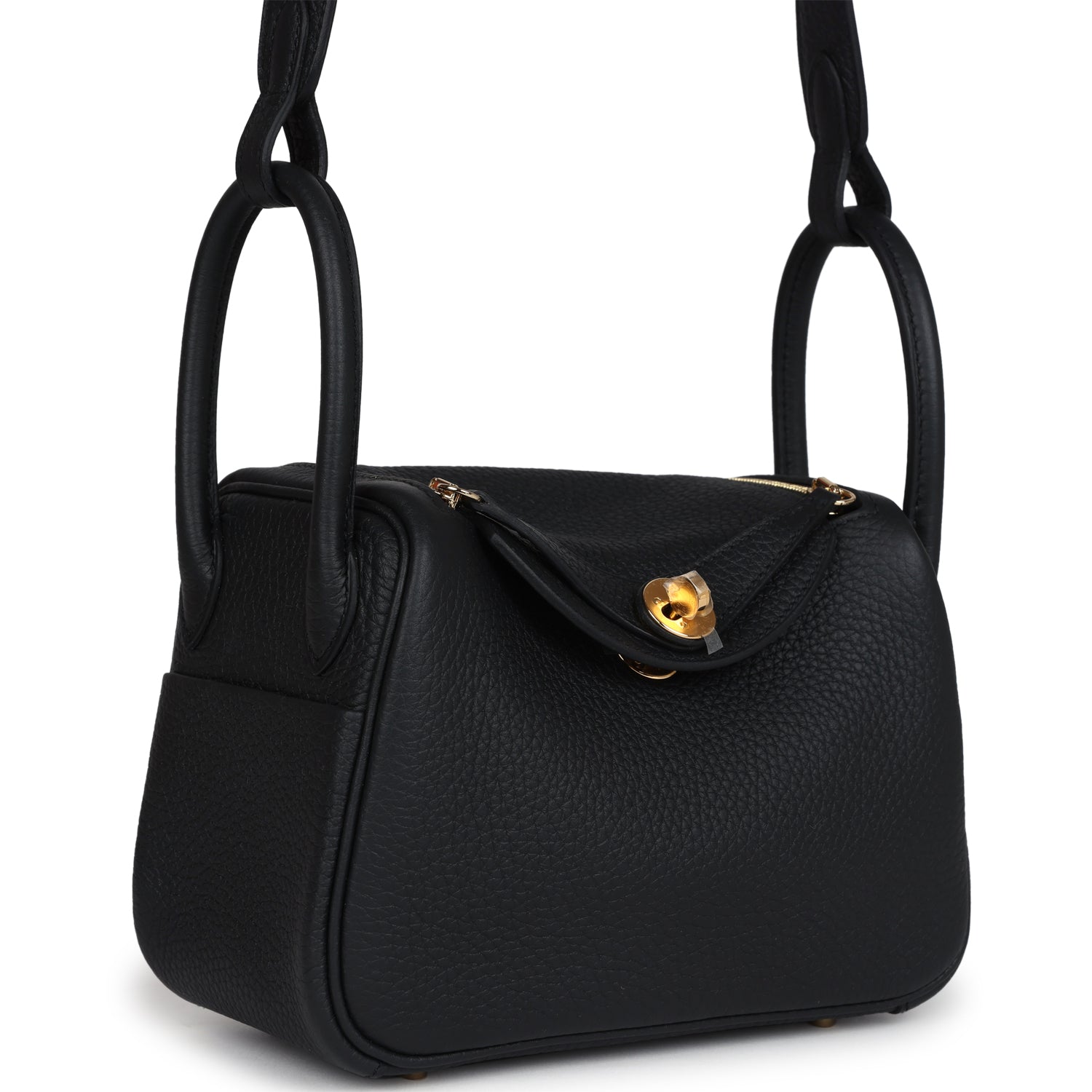 This Mini Lindy is in Black clemence leather with gold hardware and has tonal stitching, double zipper pulls, front Hermès twist lock, single pocket on each side, two rolled top handles linked by a flat shoulder strap.