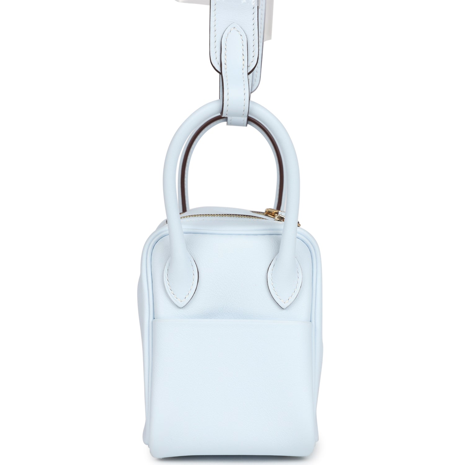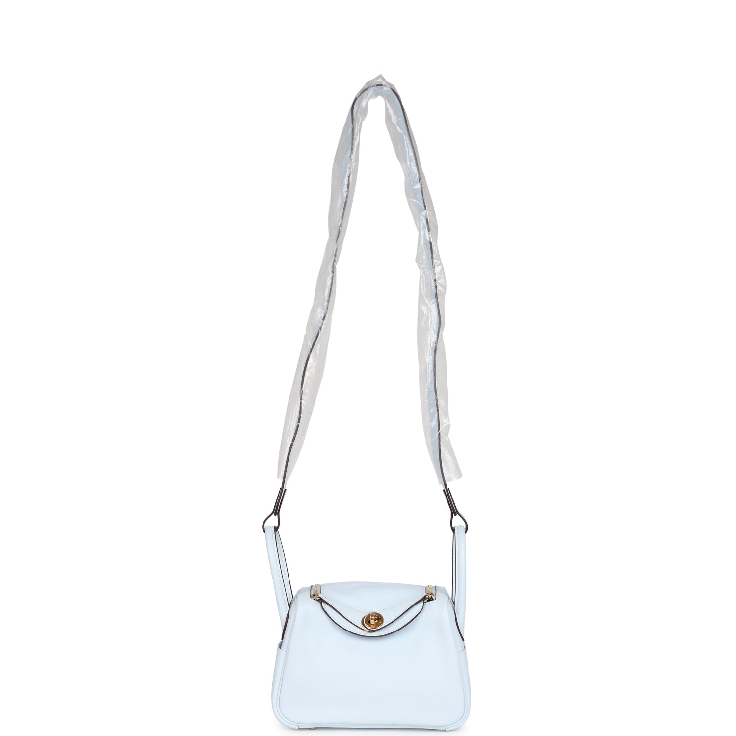 This Mini Lindy is in Bleu Brume swift leather with gold hardware and has tonal stitching, double zipper pulls, front Hermès twist lock, single pocket on each side, two rolled top handles linked by a flat shoulder strap.