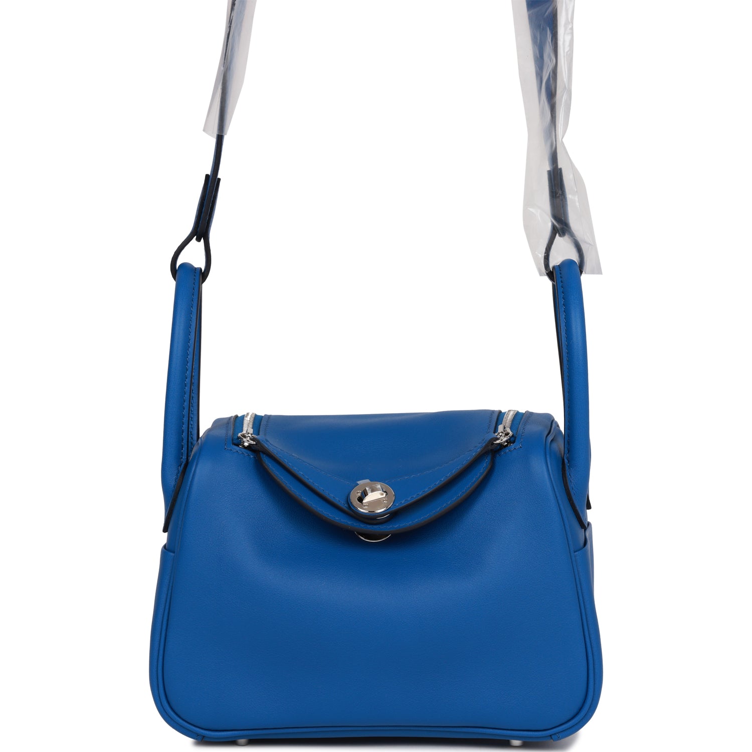 This Mini Lindy is in Bleu France swift leather with palladium hardware and has tonal stitching, double zipper pulls, front Hermès twist lock, single pocket on each side, two rolled top handles linked by a flat shoulder strap.