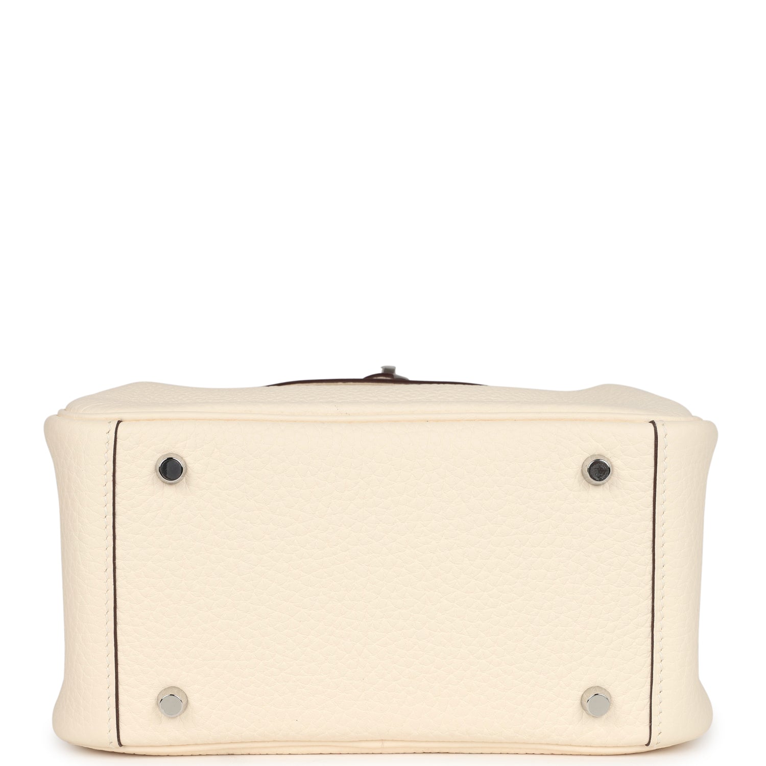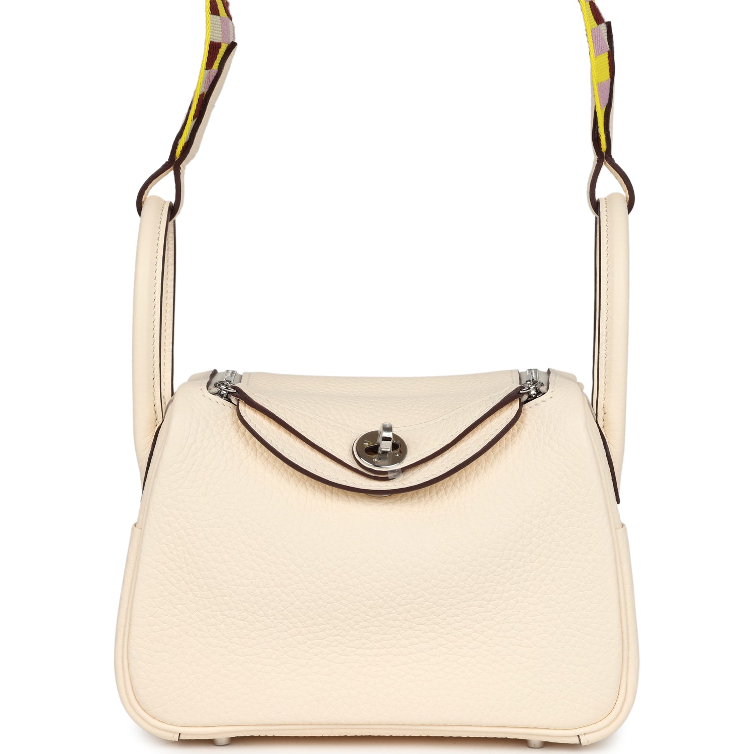 This Mini Lindy is in Nata clemence leather with palladium hardware and has tonal stitching, double zipper pulls, front Hermès twist lock, single pocket on each side, two rolled top handles linked by a flat Quadrille shoulder strap.