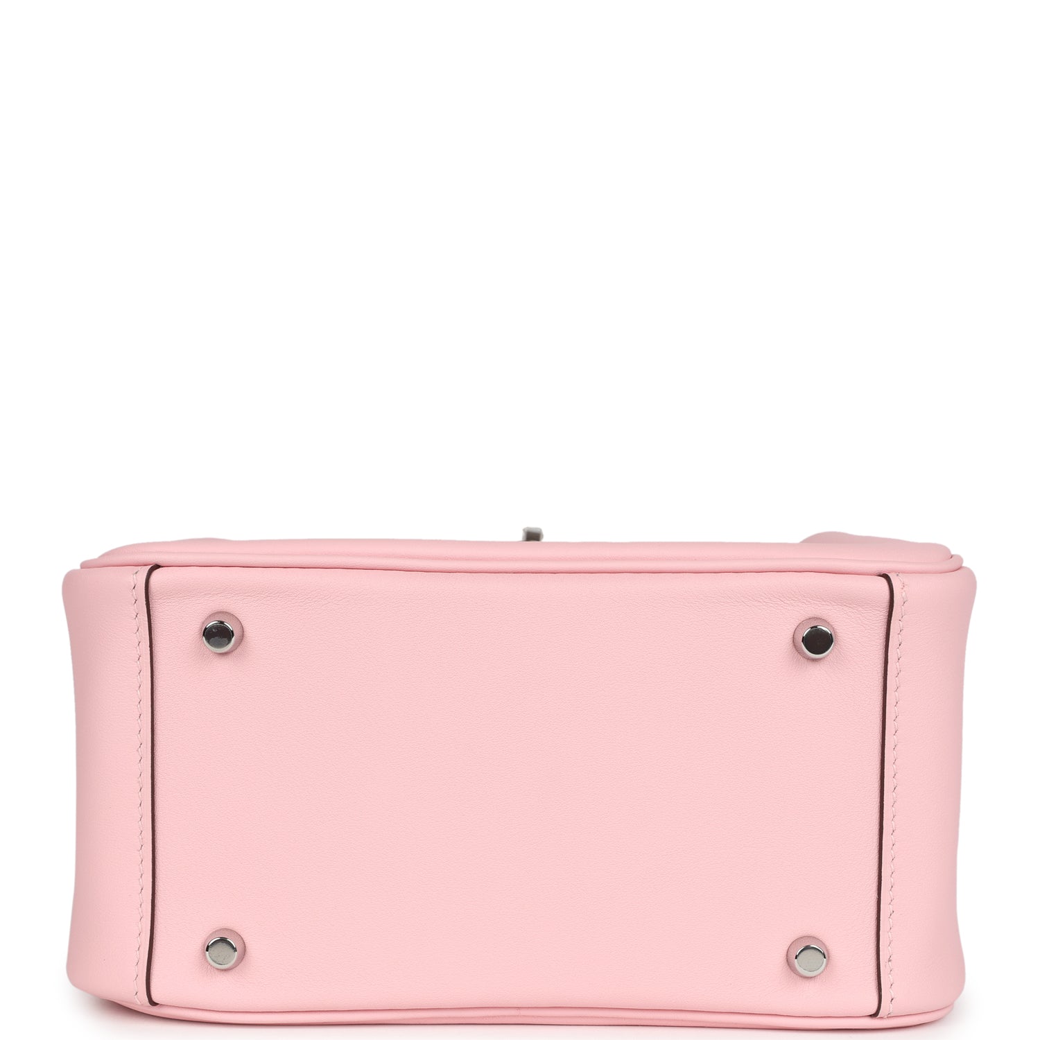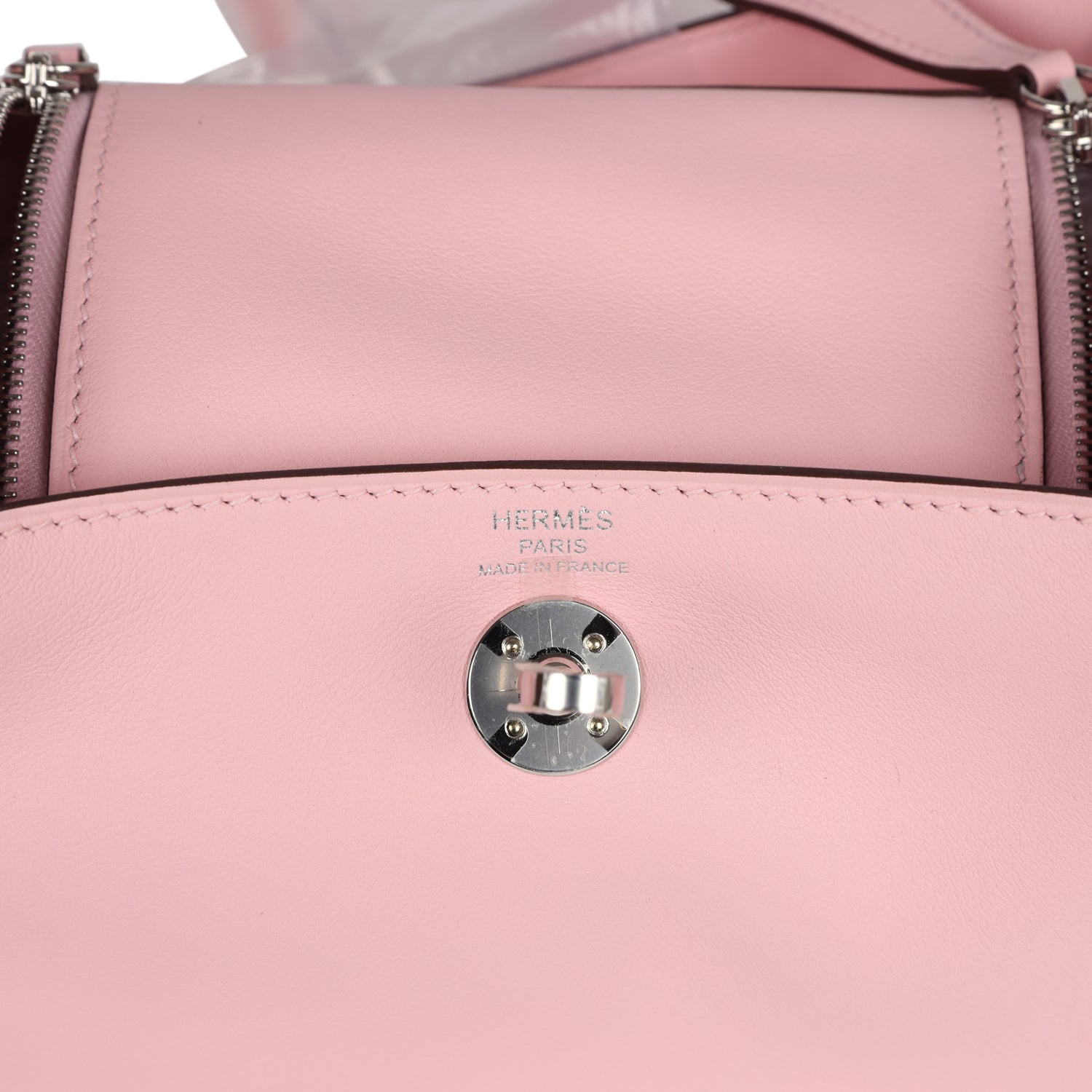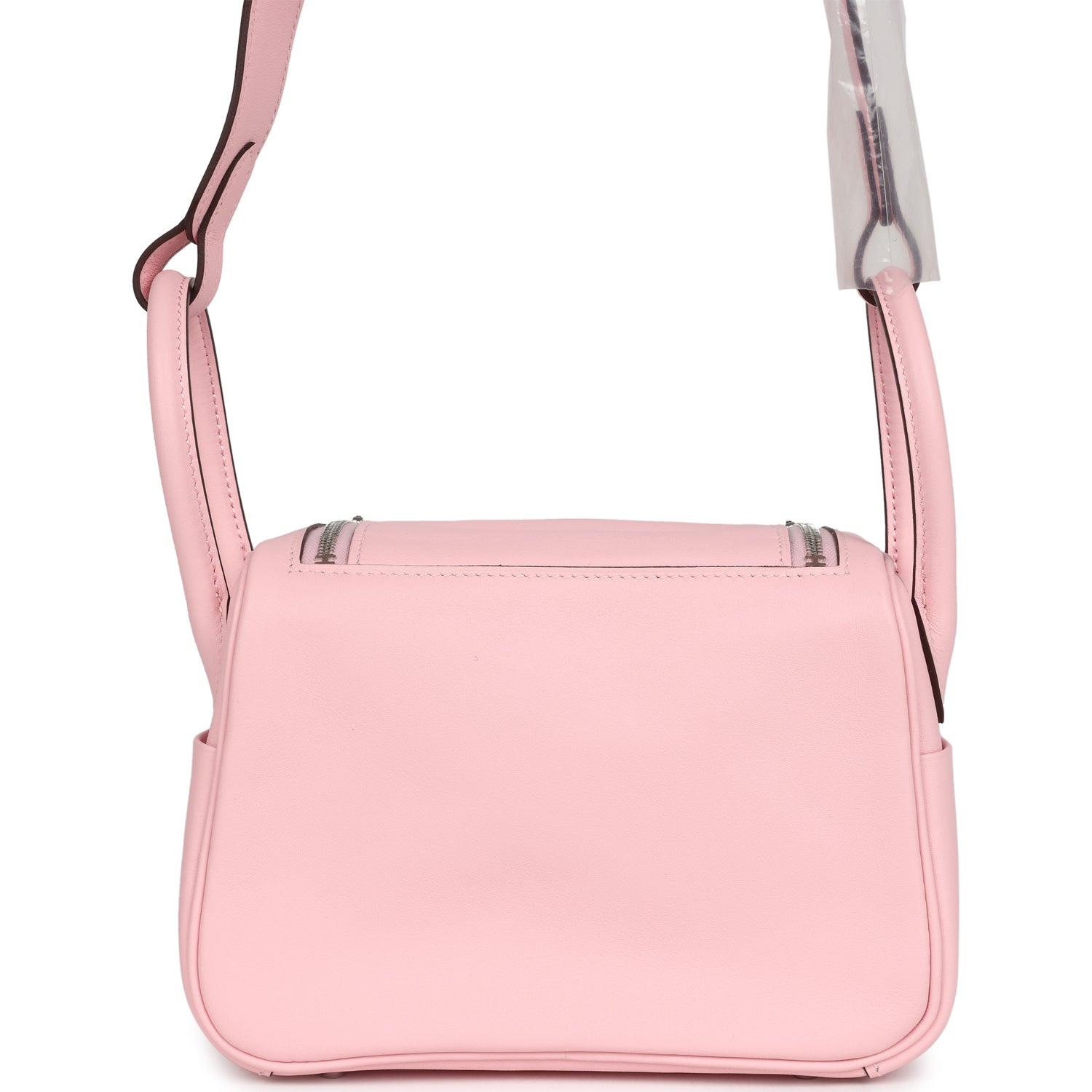 This Mini Lindy is in Rose Sakura swift leather with palladium hardware and has tonal stitching, double zipper pulls, front Hermès twist lock, single pocket on each side, two rolled top handles linked by a flat shoulder strap.
