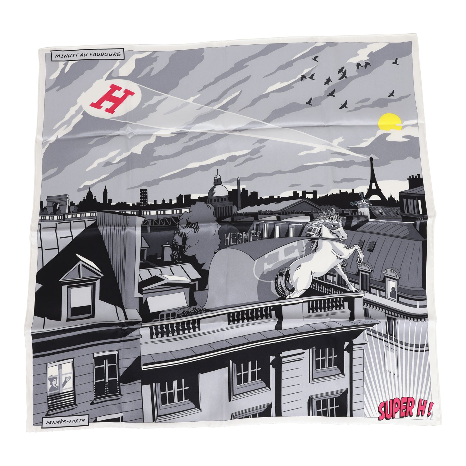 This rare graphic scarf is designed in a comic book style and features a large horse as the hero on top of the Hermes flagship store in Paris, and famous Parisian landmarks along the night sky in the background.