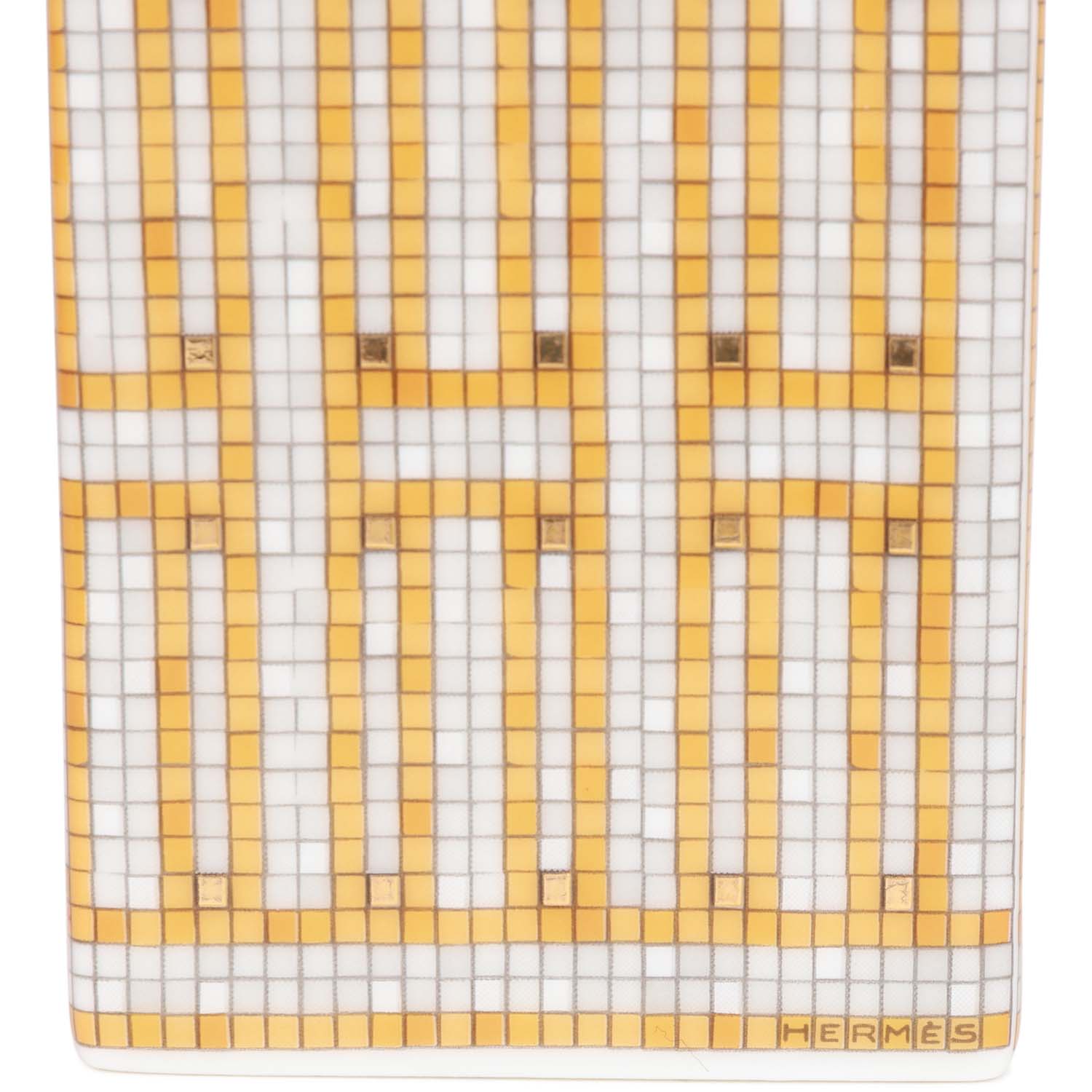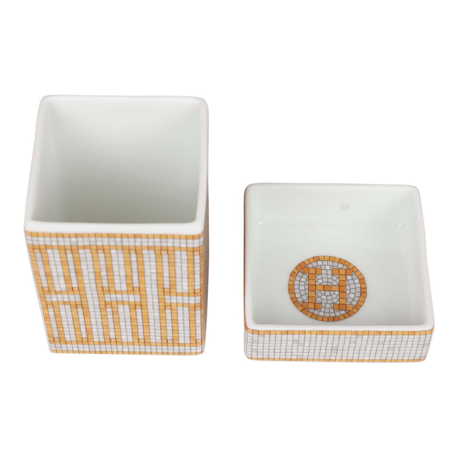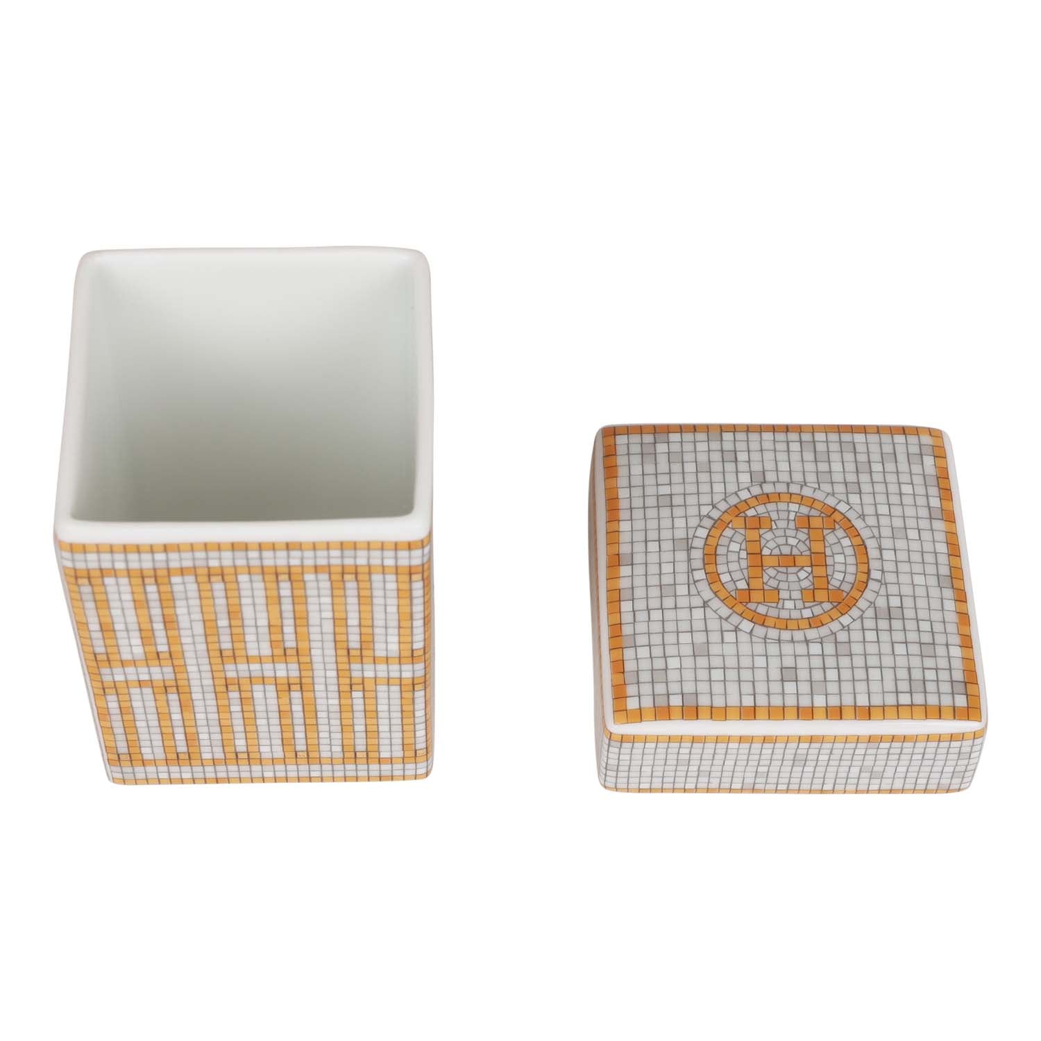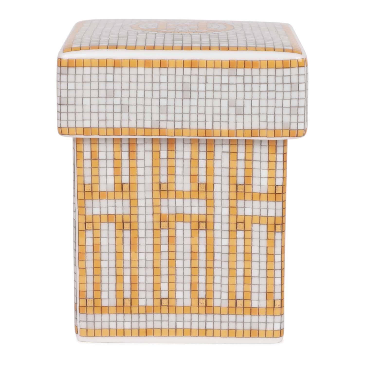 This "Mosaique Au 24" Tea Sugar Box is in gold and grey porcelain in the small model.
