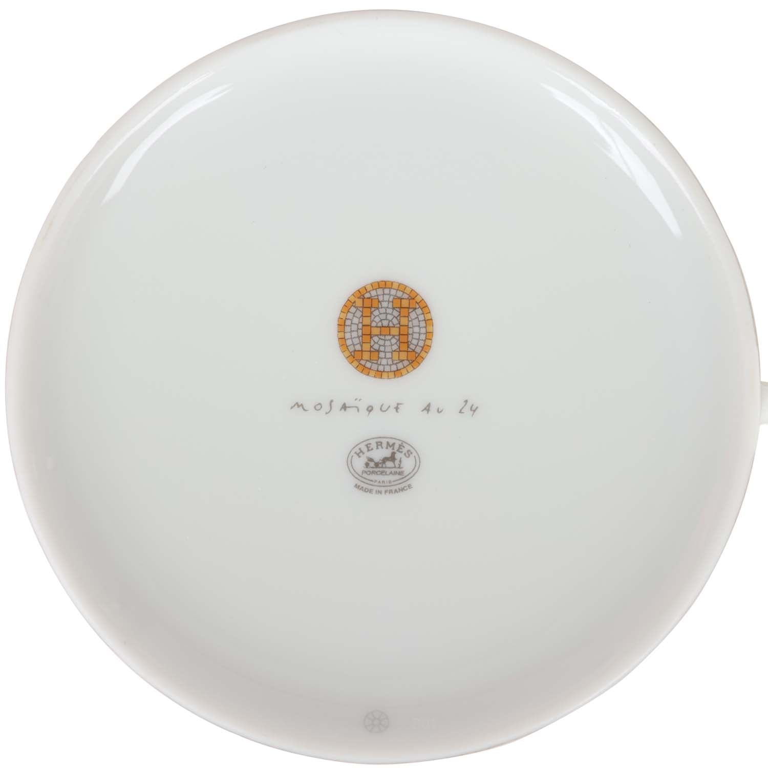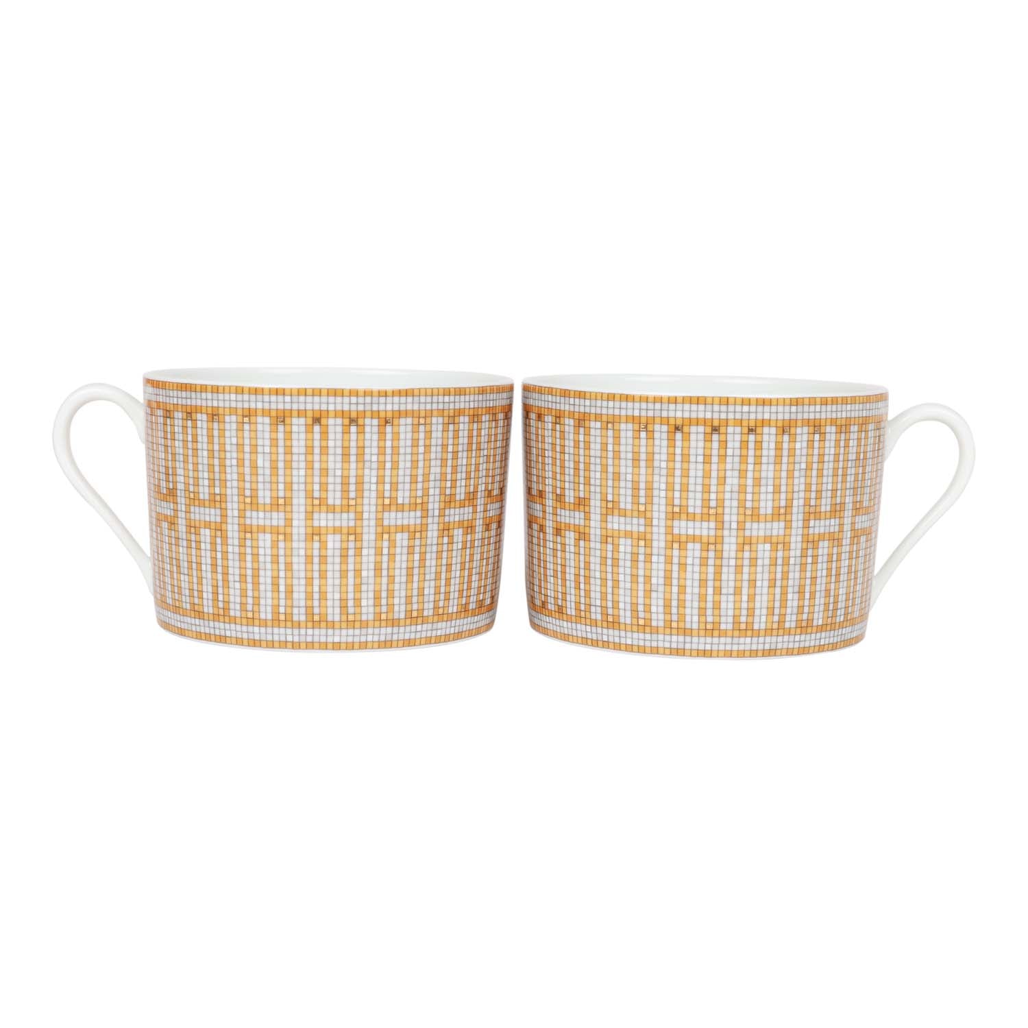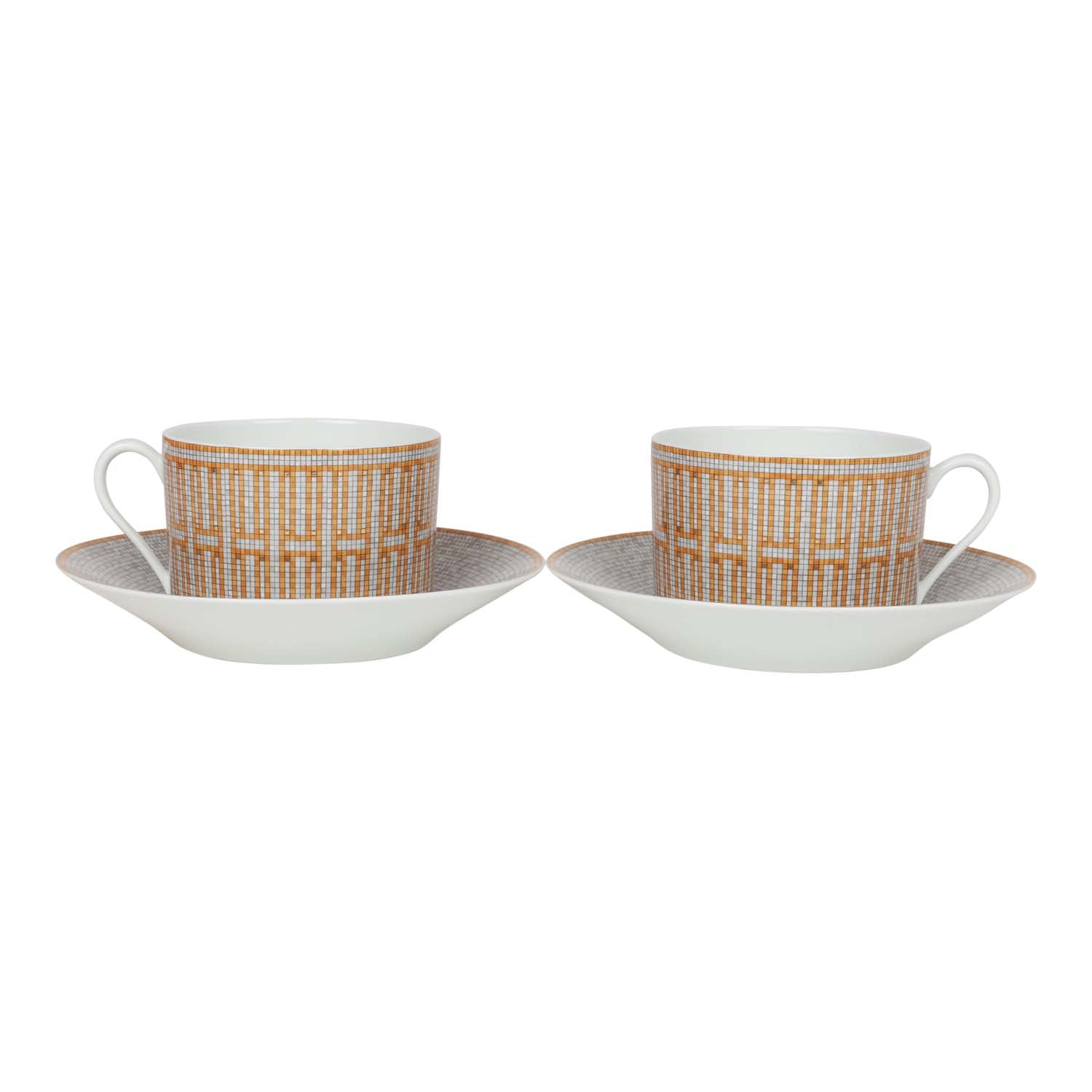 This "Mosaique Au 24" tea cup and saucer set is in gold and grey porcelain.