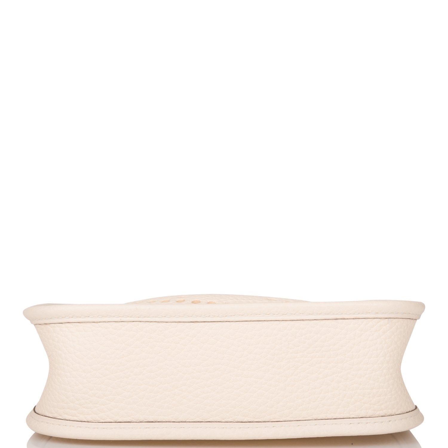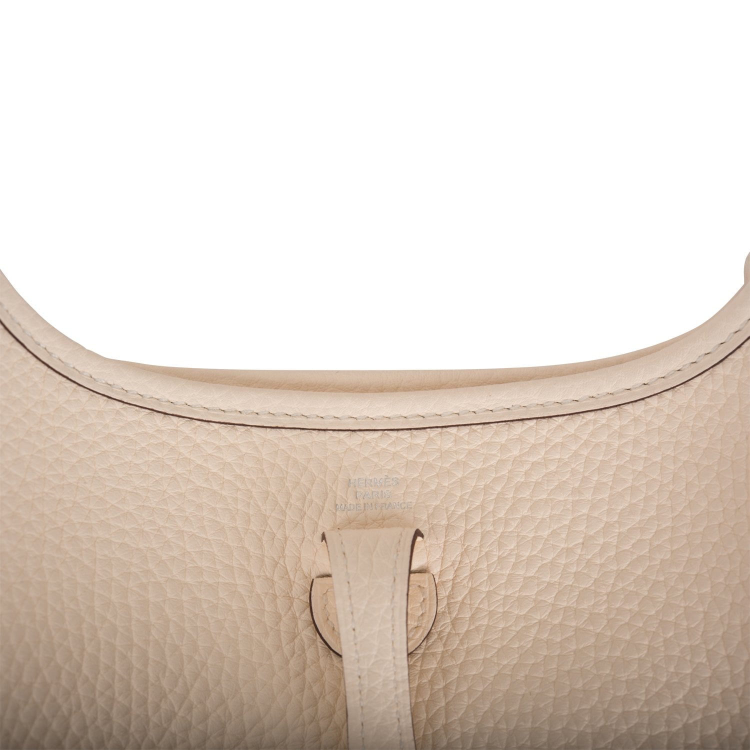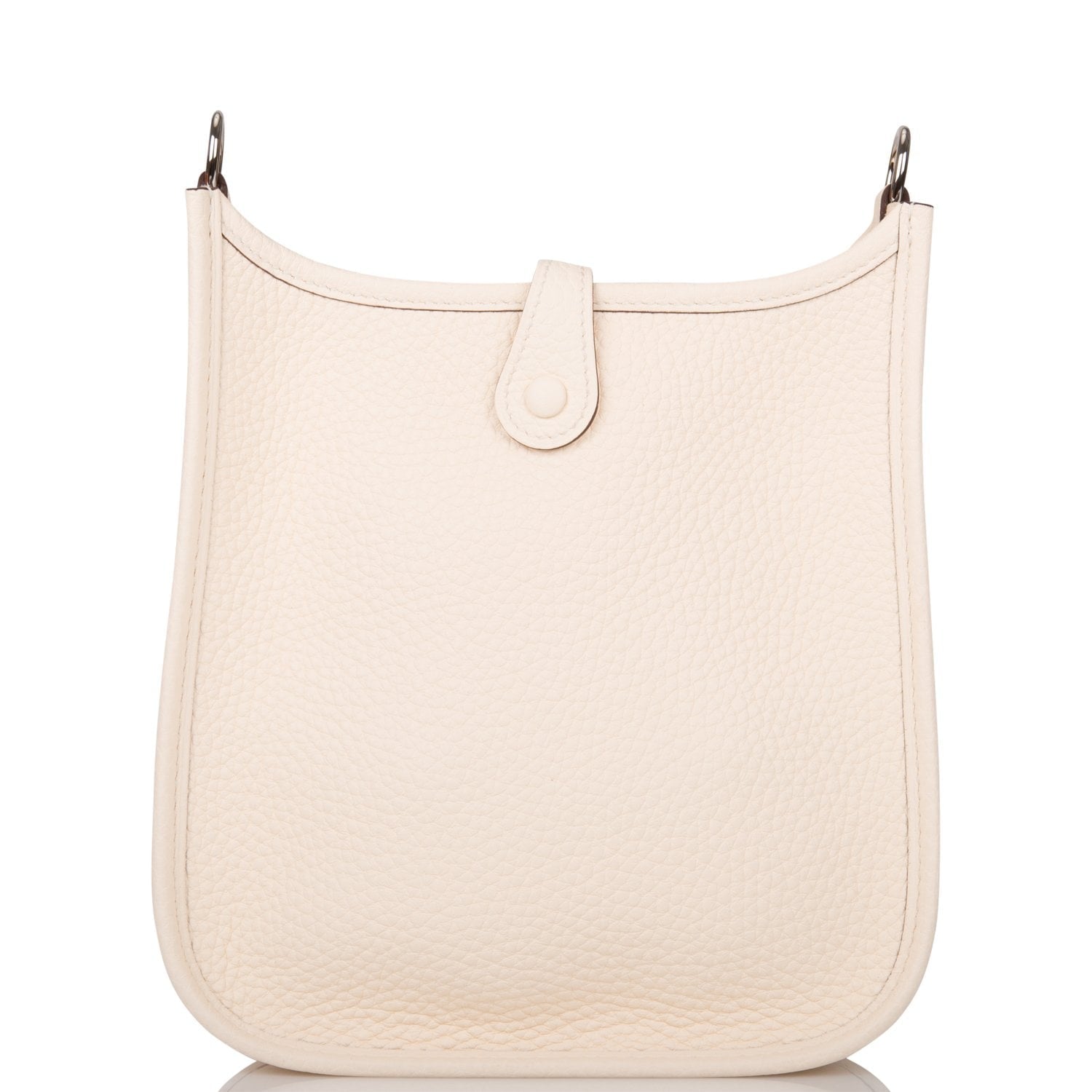This Evelyne TPM is in Nata clemence leather with palladium hardware and features tonal stitching stitching, pull tab top closure and a white removable canvas and leather shoulder/crossbody strap.