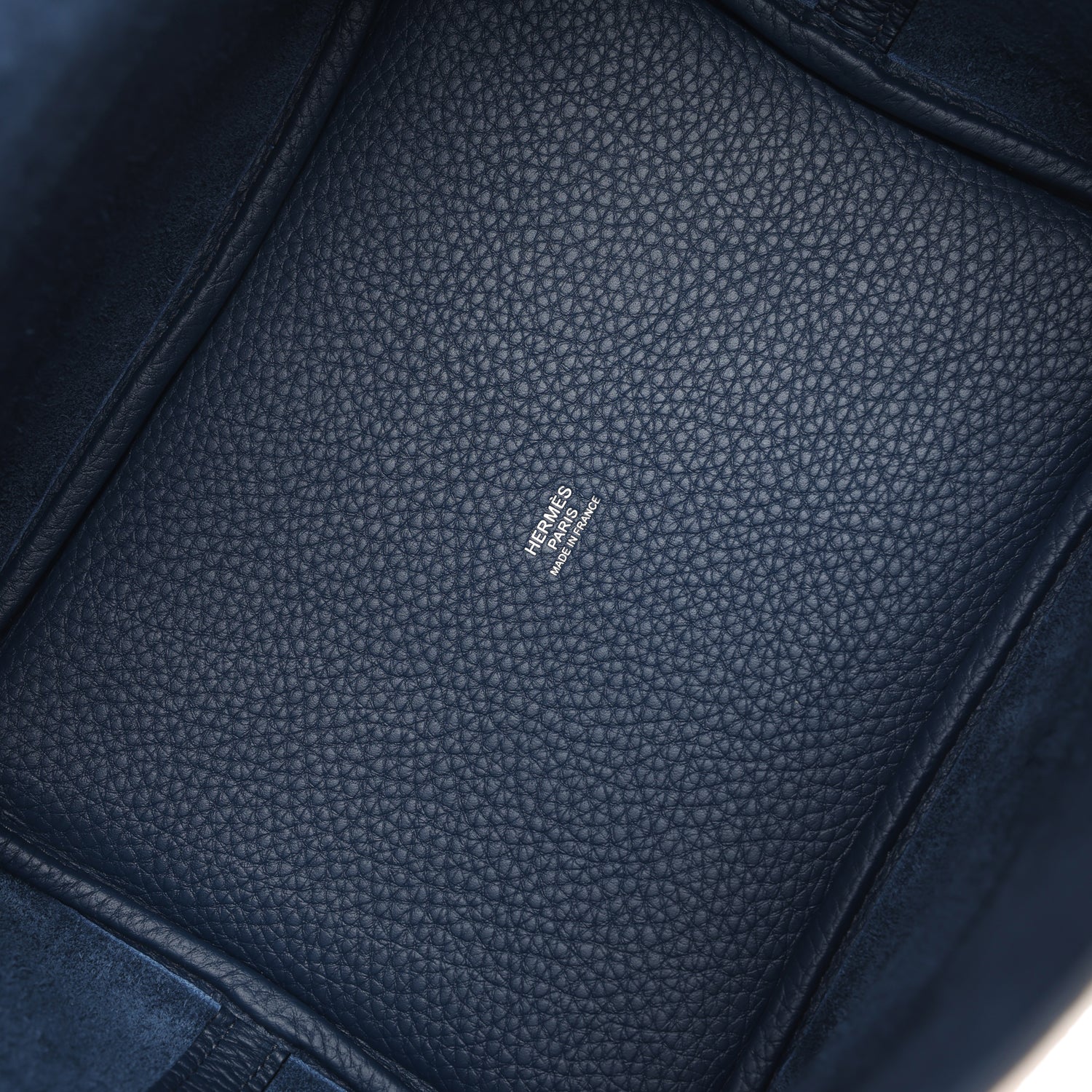 This Picotin Lock 22 is in Bleu De Prusse clemence leather with palladium hardware and has tonal stitching with two top handles.