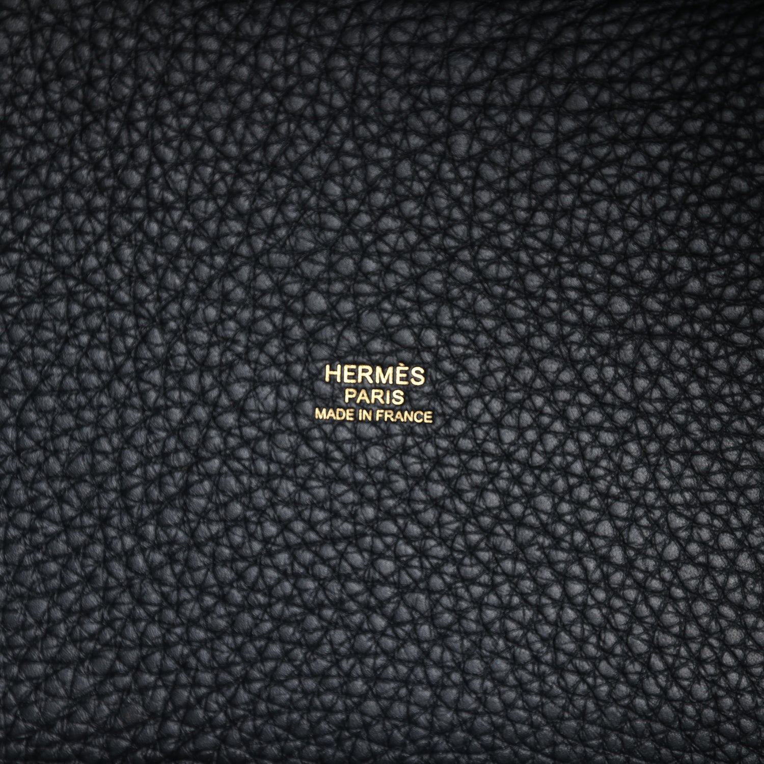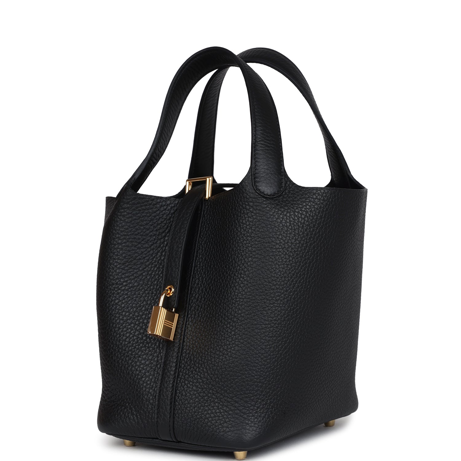 This Picotin Lock is in Black clemence leather with gold hardware and has tonal stitching with two top handles.