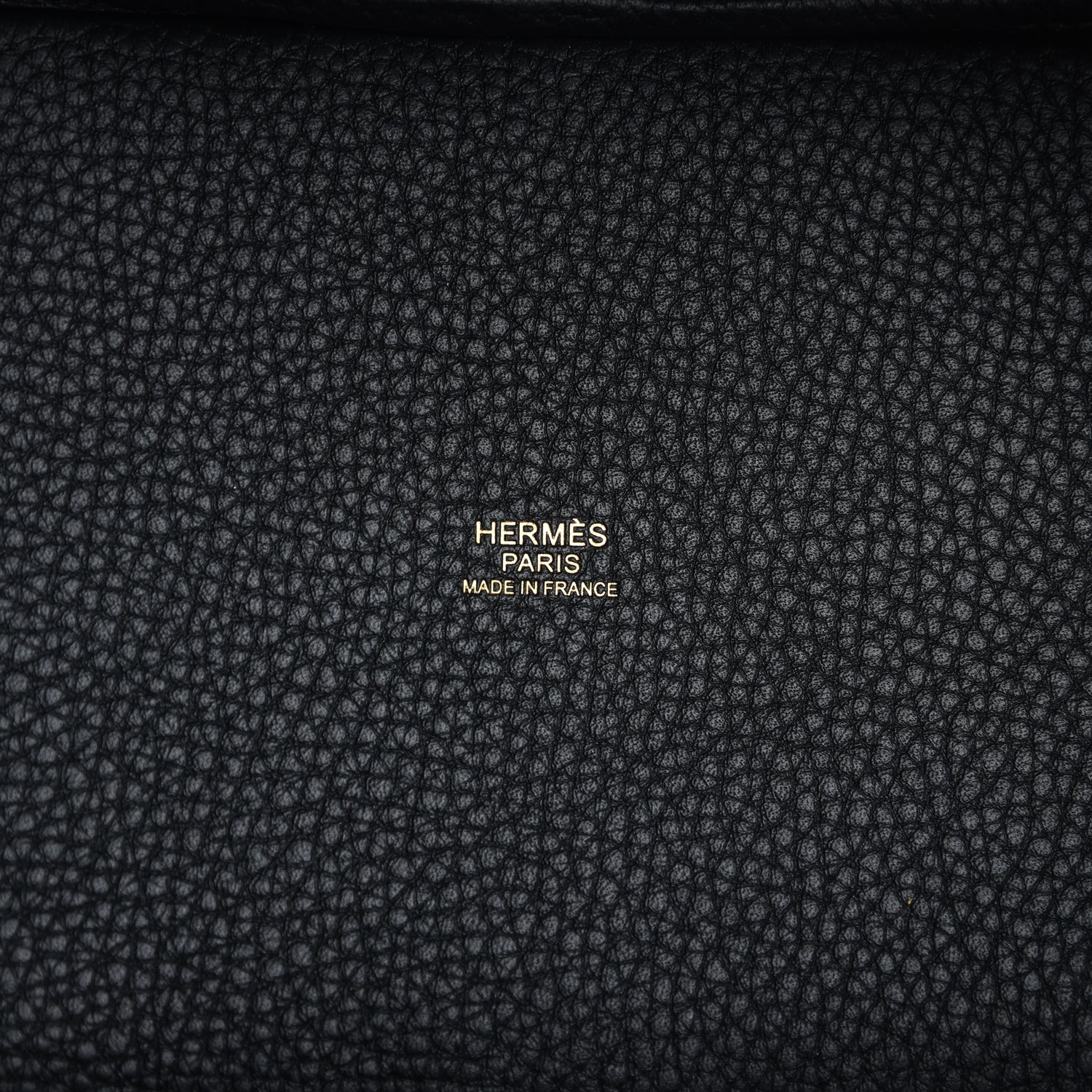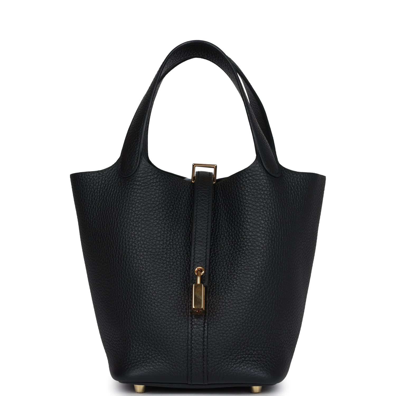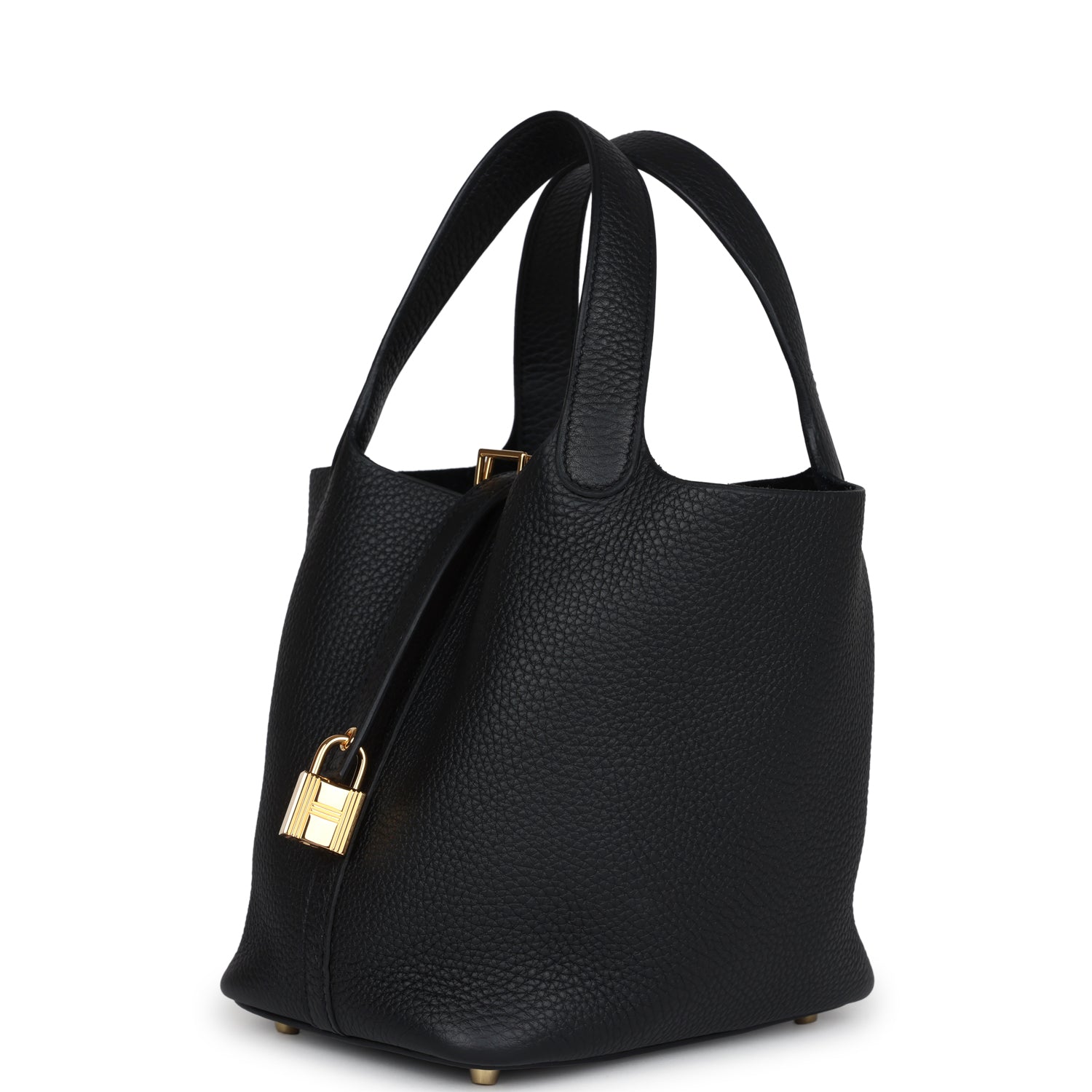 This Picotin Lock is in Black clemence leather with gold hardware and has tonal stitching with two top handles.