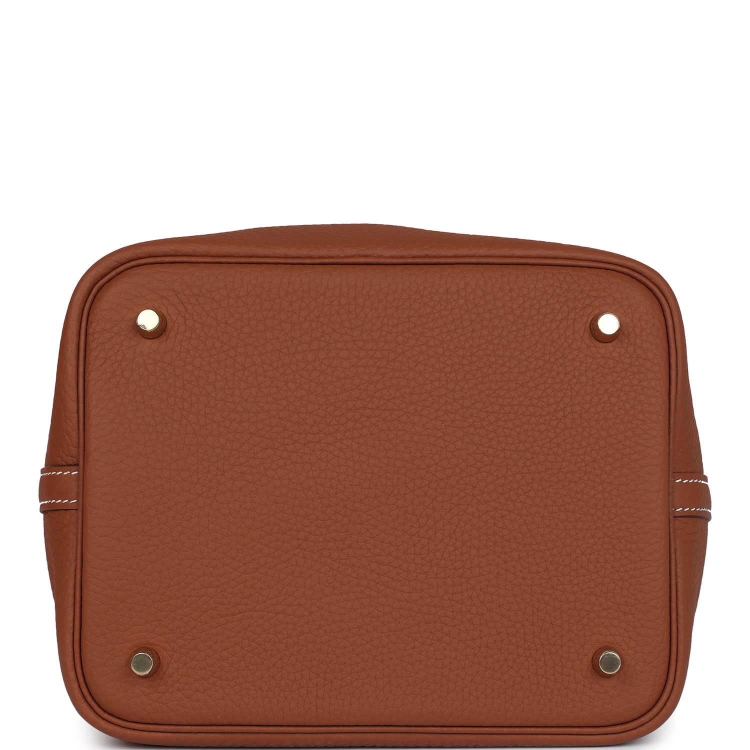 This Picotin is in Gold clemence leather with gold hardware and contrast stitching with two top handles.
