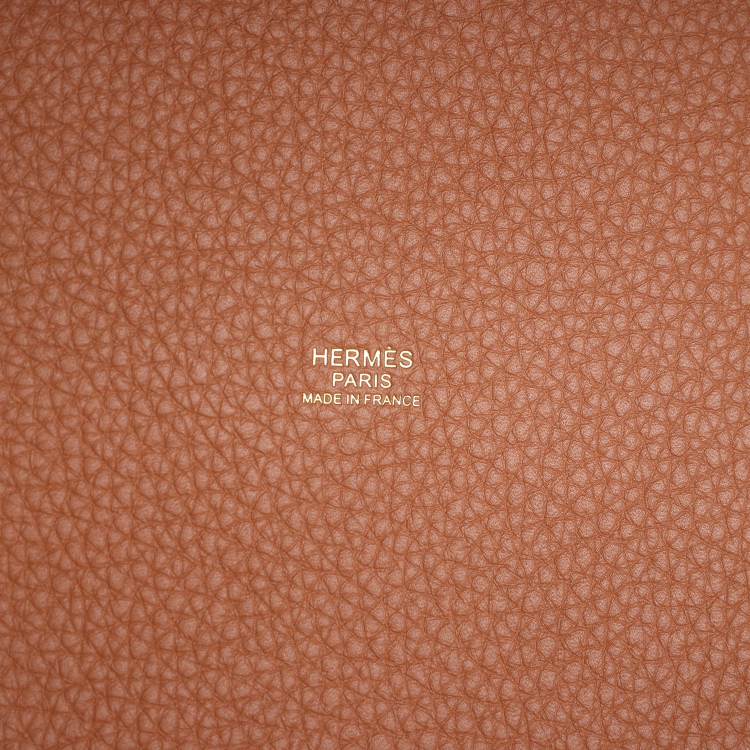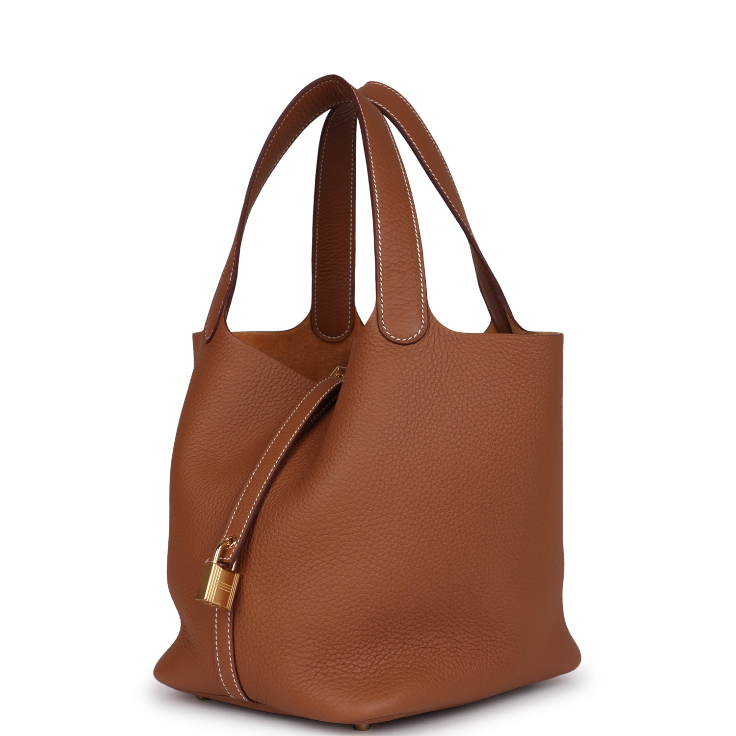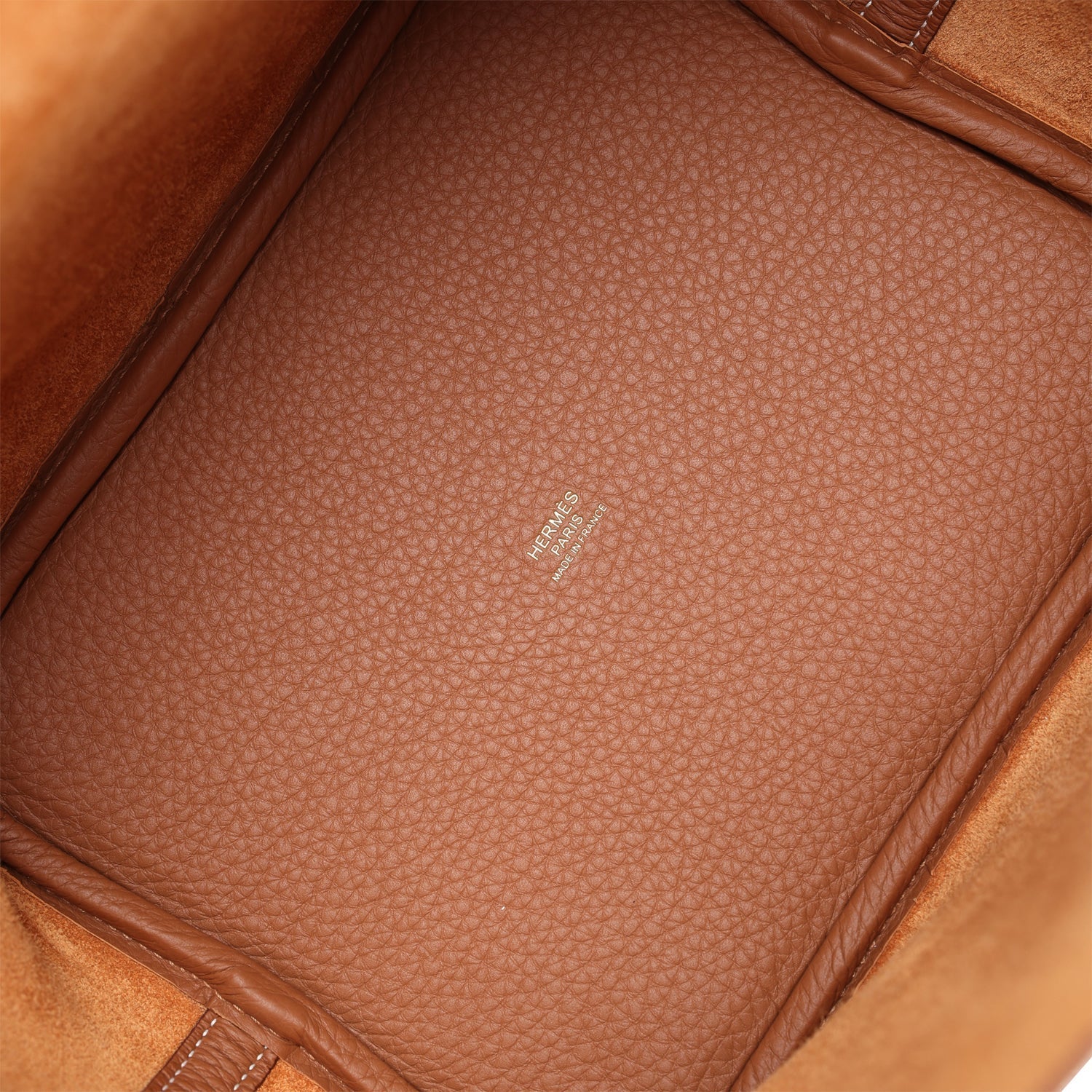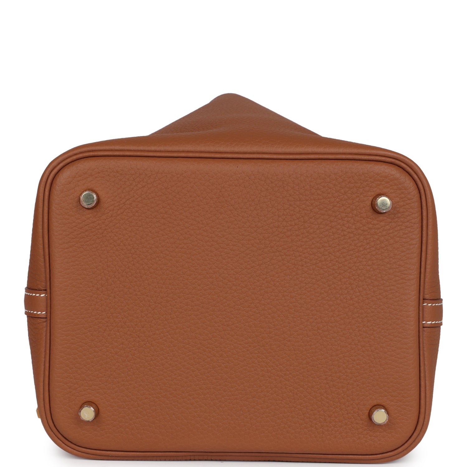 This Picotin is in Gold clemence leather with gold hardware and has contrast stitching with two top handles.
