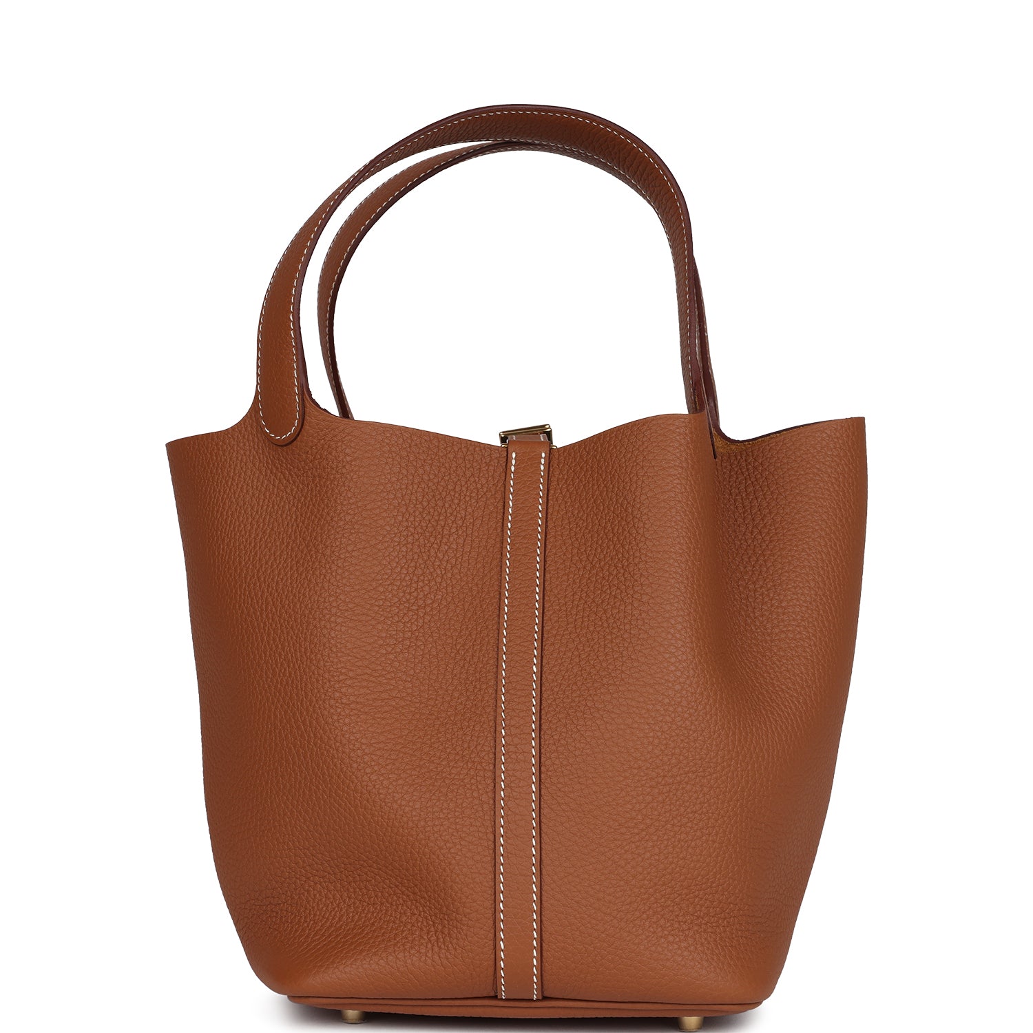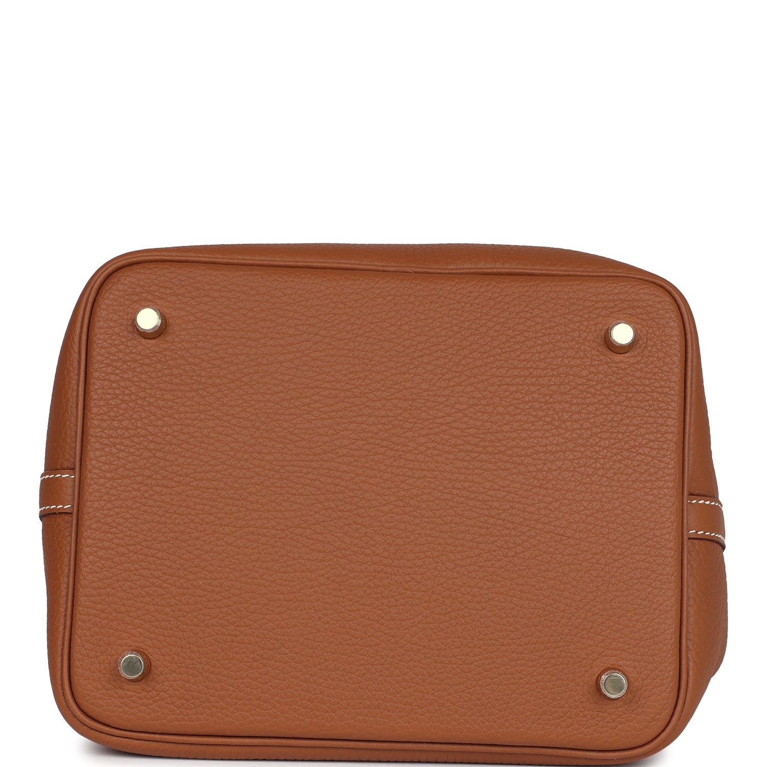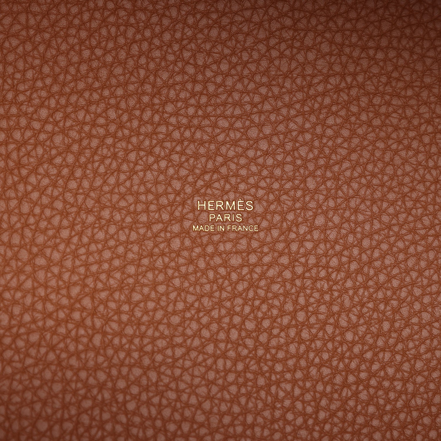 This Picotin is in Gold clemence leather with gold hardware and contrast stitching with two top handles.