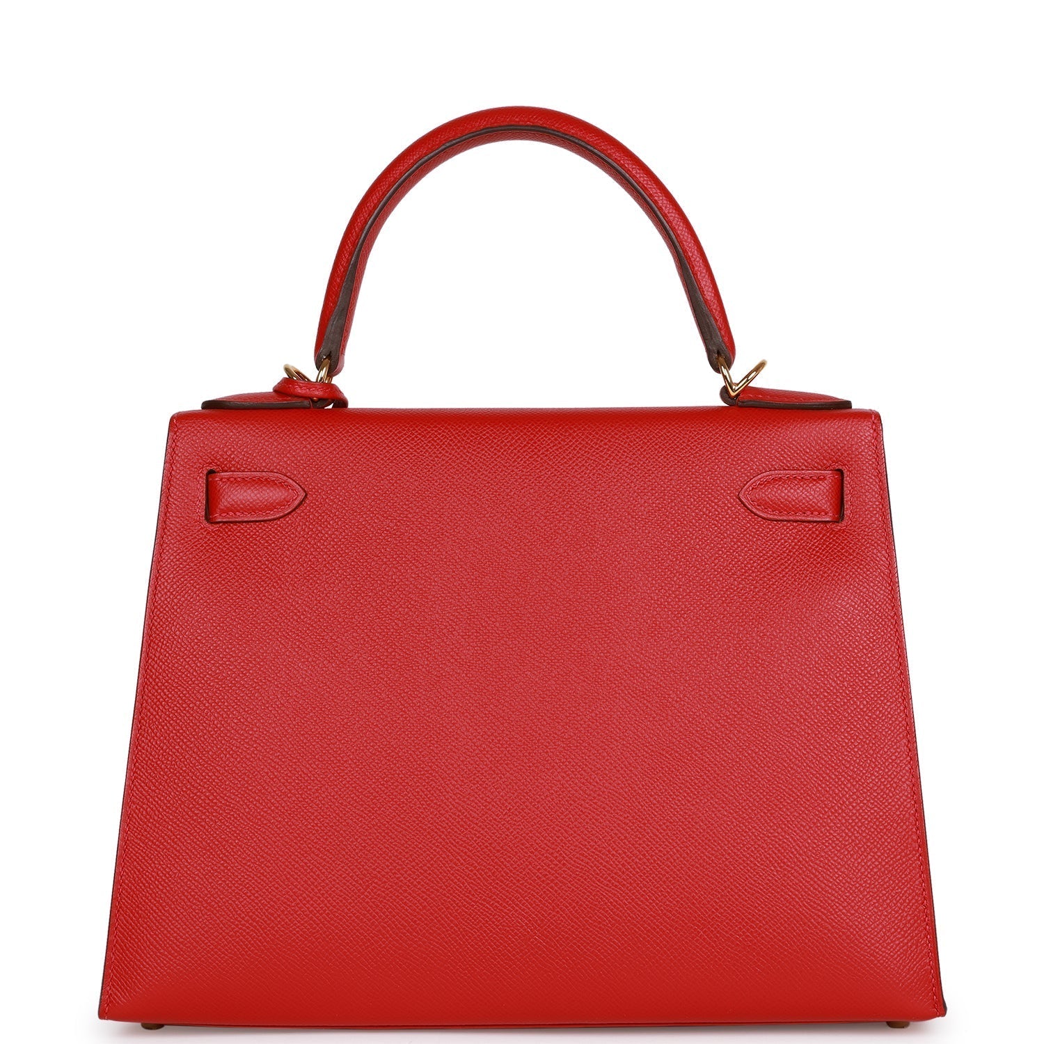 This Kelly Sellier is in Rouge Casaque epsom leather with gold hardware, has tonal stitching, a front toggle closure, a clochette with lock and two keys, a single rolled handle and an optional shoulder strap.
