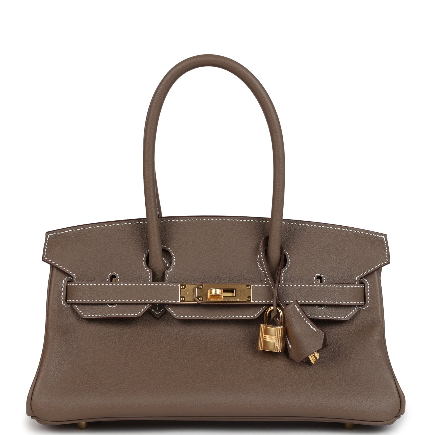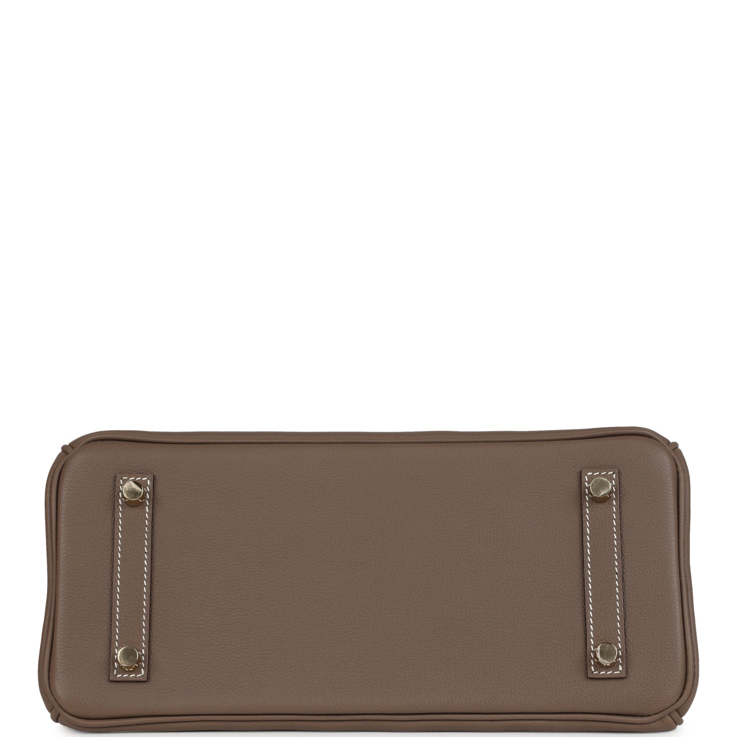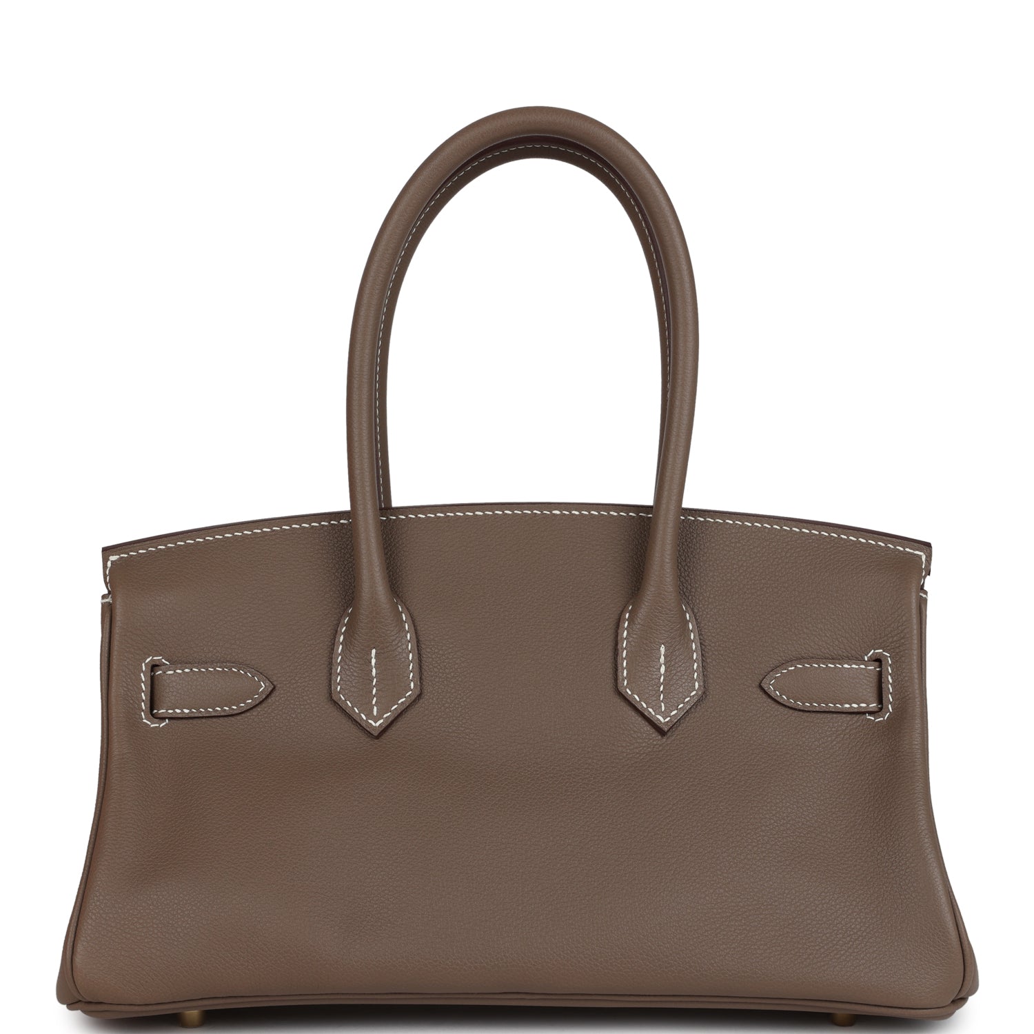 This Shoulder Birkin Light 29 is in Etoupe evercolor leather with gold hardware and has white contrast stitching, two straps with front toggle closure, clochette with lock and two keys and double rolled handles.