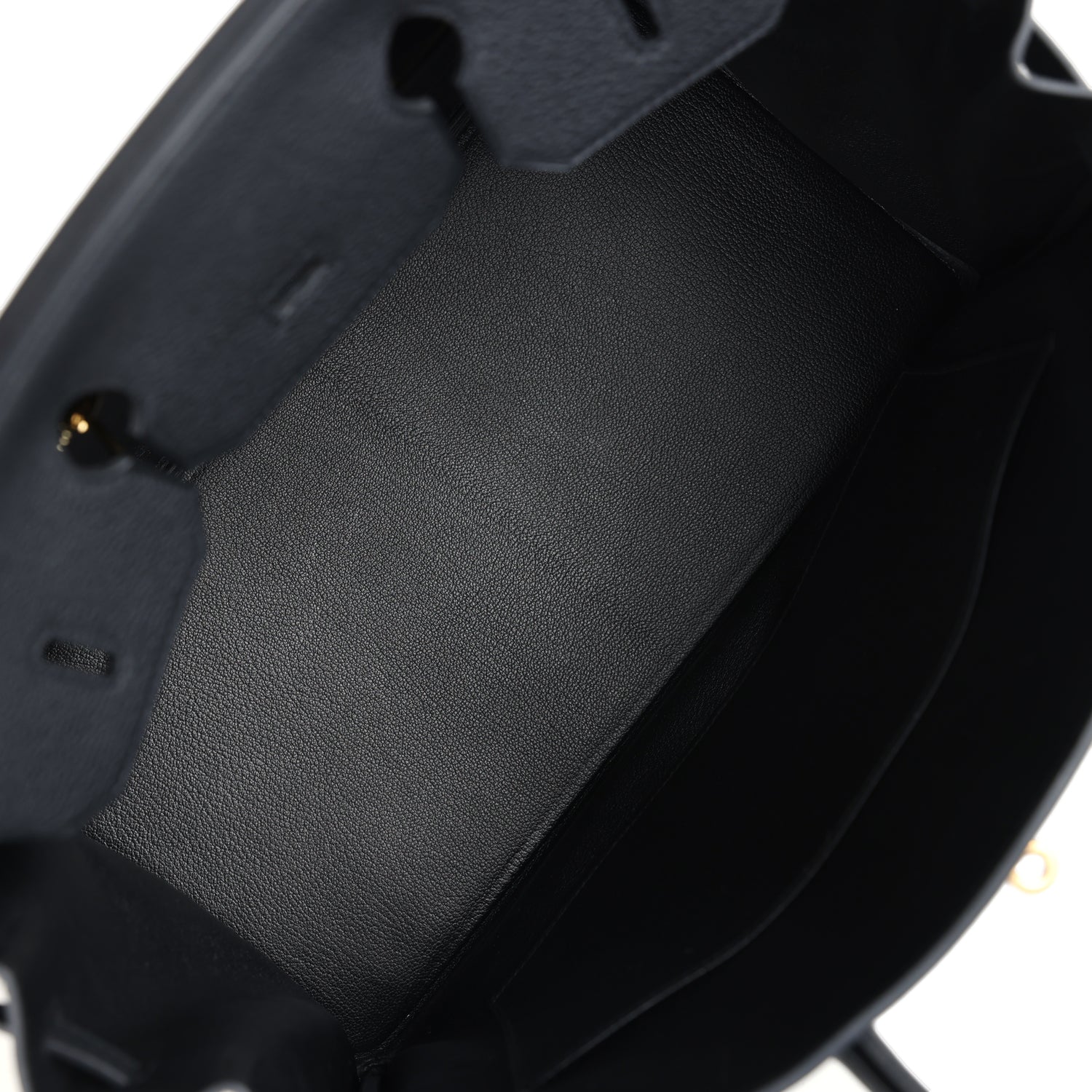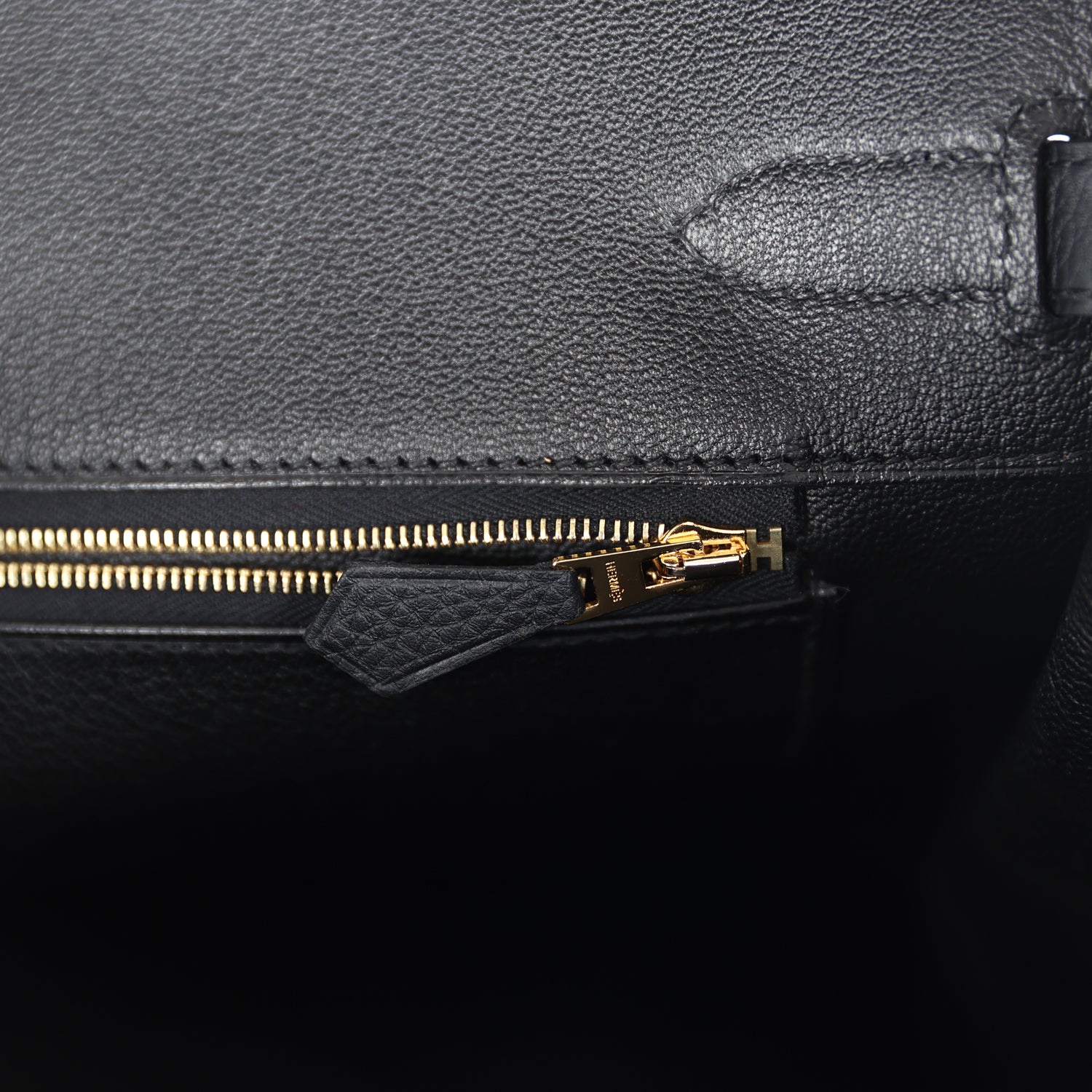 The interior is lined with Black chevre and has one zip pocket with an Hermes engraved zipper pull and an open pocket on the opposite side.