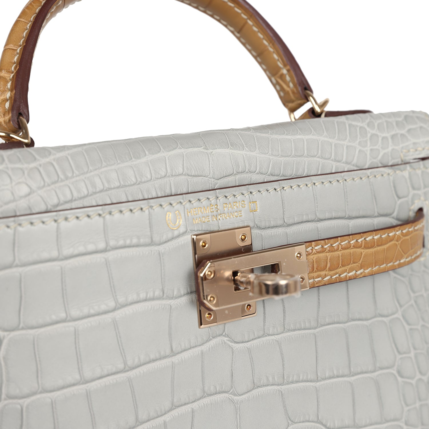 This Special Order Kelly, in the Sellier style, is in Gris Perle and Kraft Matte Alligator Mississippiensis leather with permabrass hardware, a mixture of tonal and contrast stitching, front flap with two straps, front toggle closure, removable shoulder strap and single rolled handle.