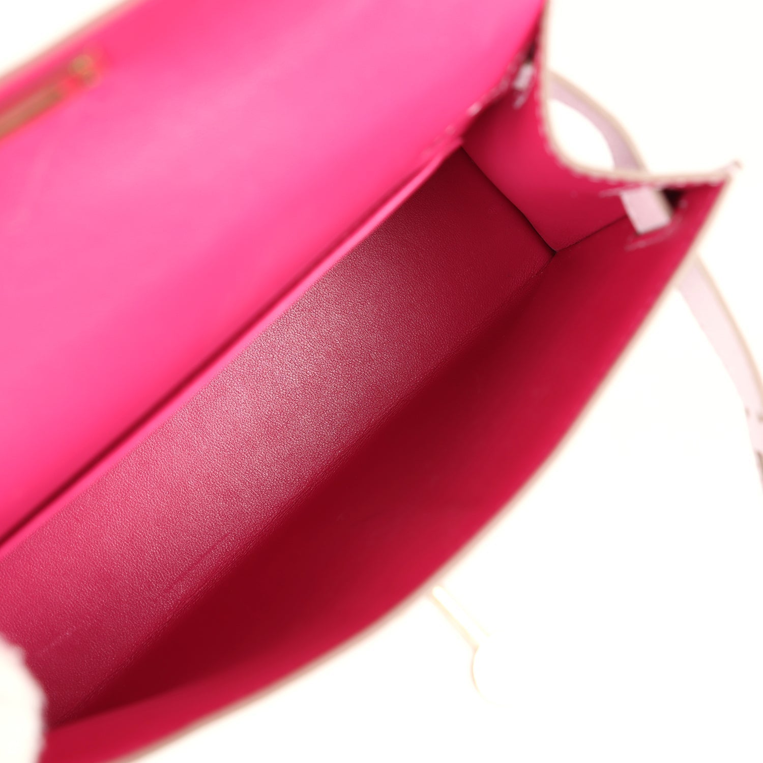 This Special Order Verso Kelly, in the Sellier style, is in Mauve Pale chevre mysore leather with permabrass hardware and has tonal stitching, two straps with front toggle closure, single rolled handle and removable shoulder strap.