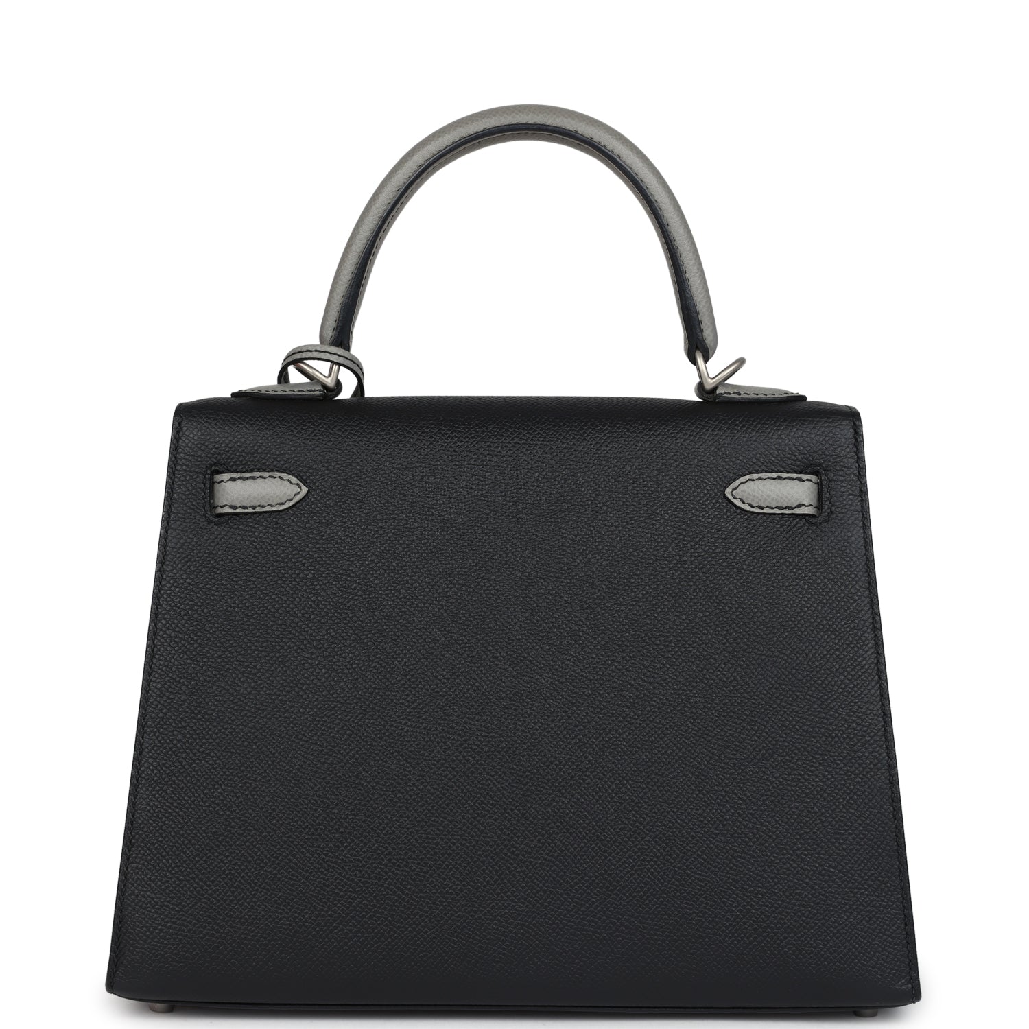 This Special Order Bi-Color Kelly, in the Sellier style, is in Black and Gris Mouette epsom leather with brushed palladium hardware, has a mixture of tonal and contrast stitching, front flap, two straps with center toggle closure, clochette with lock and two keys a single rolled handle and removable shoulder strap.