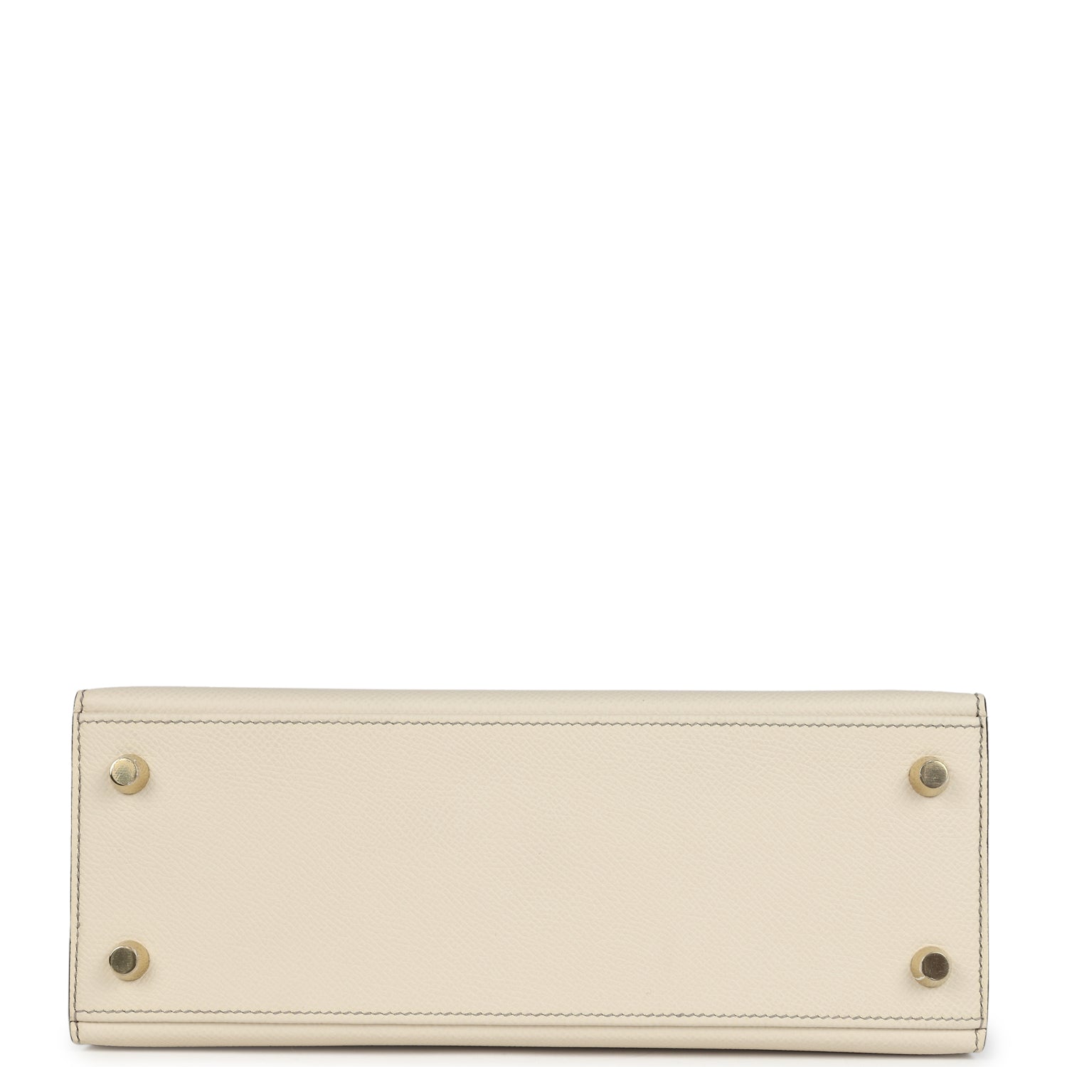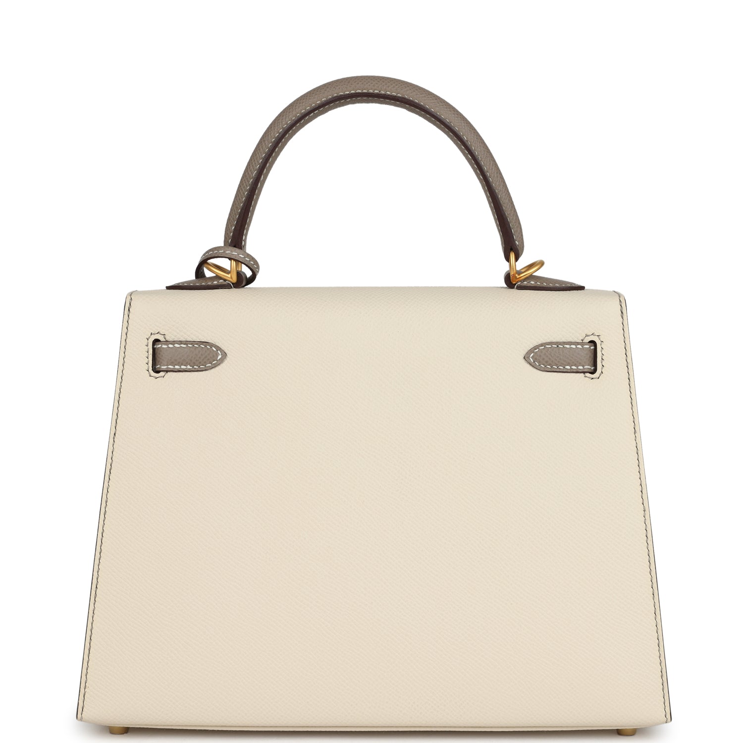 This Special Order Bi-Color Kelly, in the Sellier style, is in Craie and Gris Asphalte epsom leather with brushed gold hardware, has a mixture of tonal and contrast stitching, front flap, two straps with center toggle closure, clochette with lock and two keys a single rolled handle and removable shoulder strap.