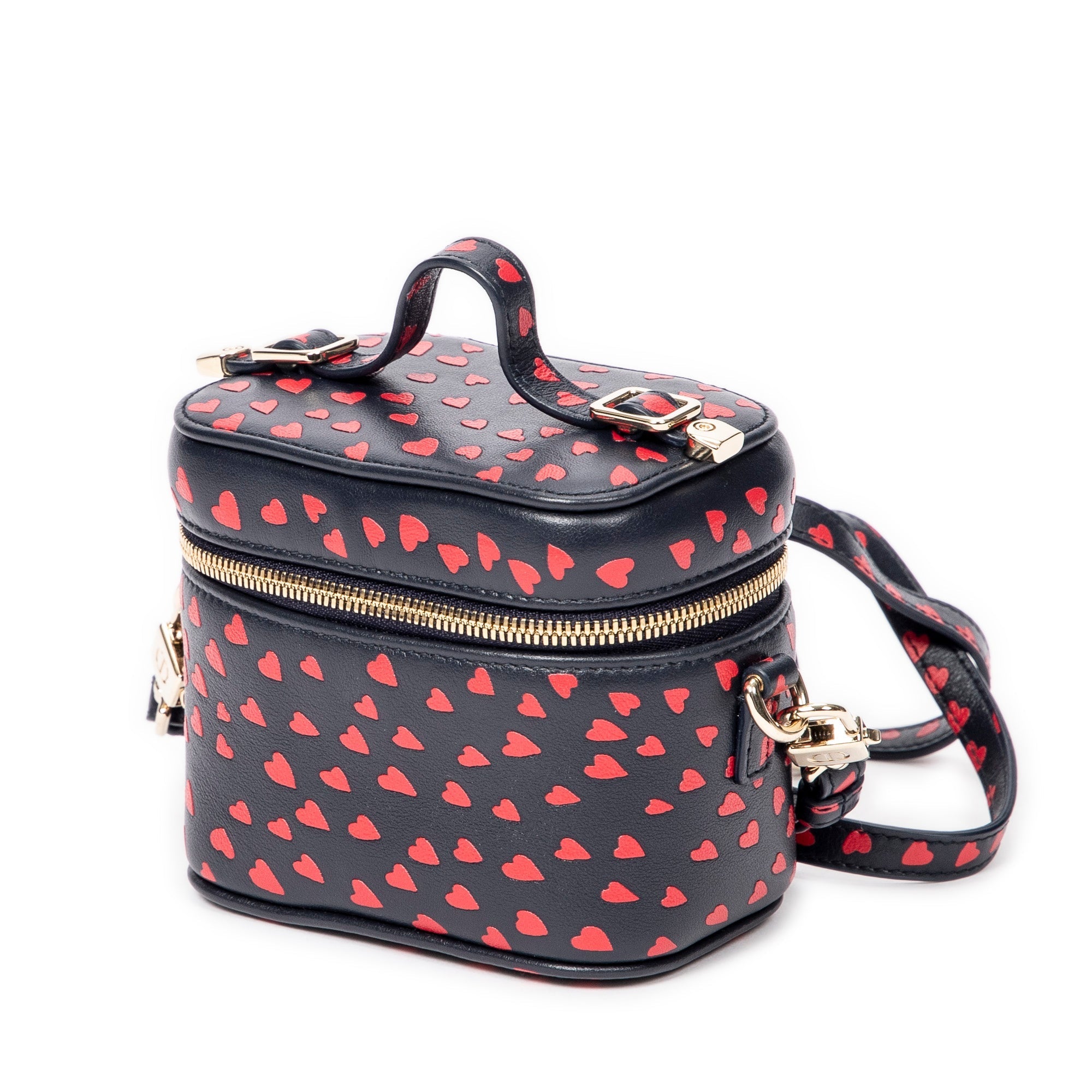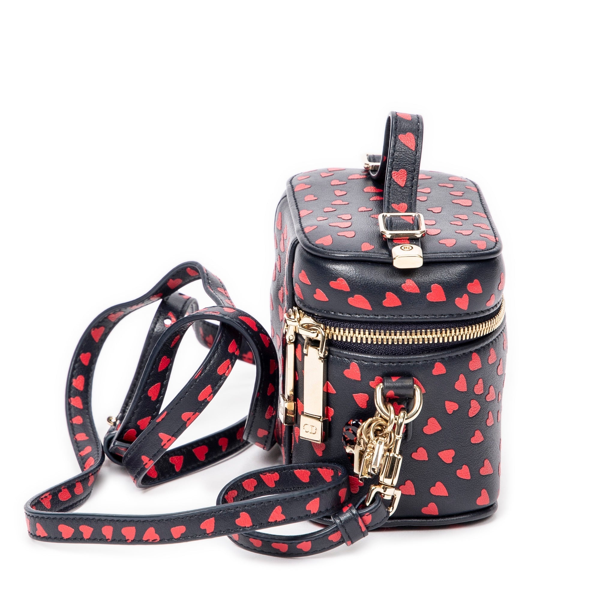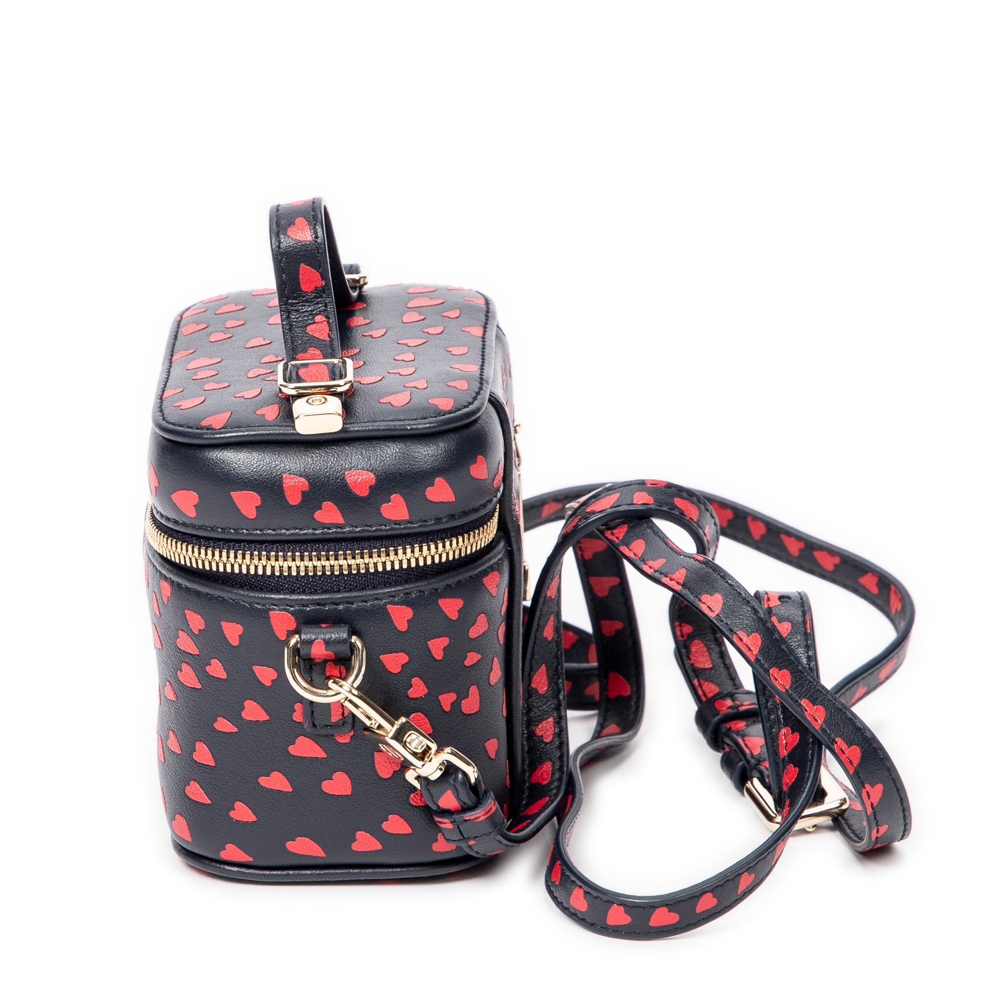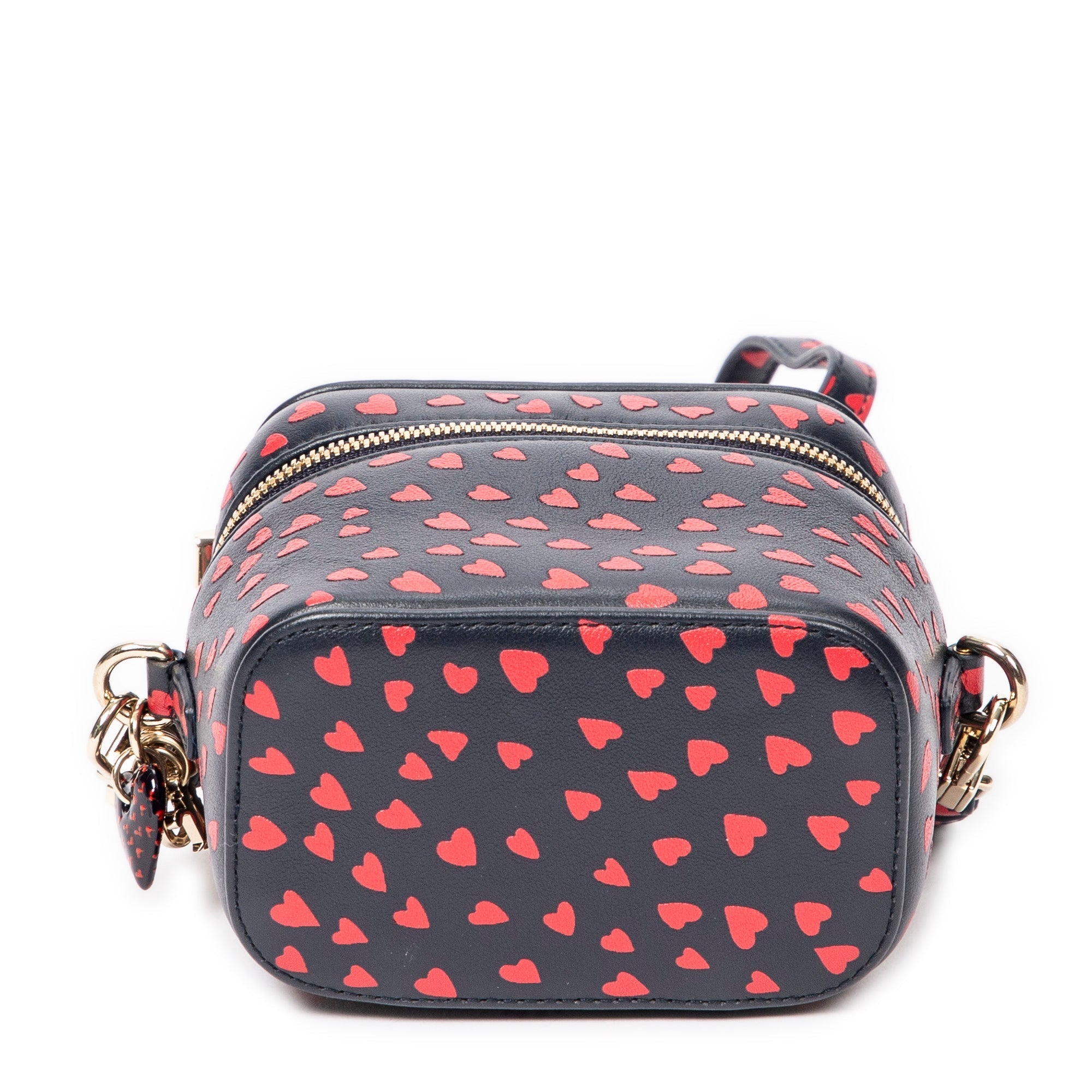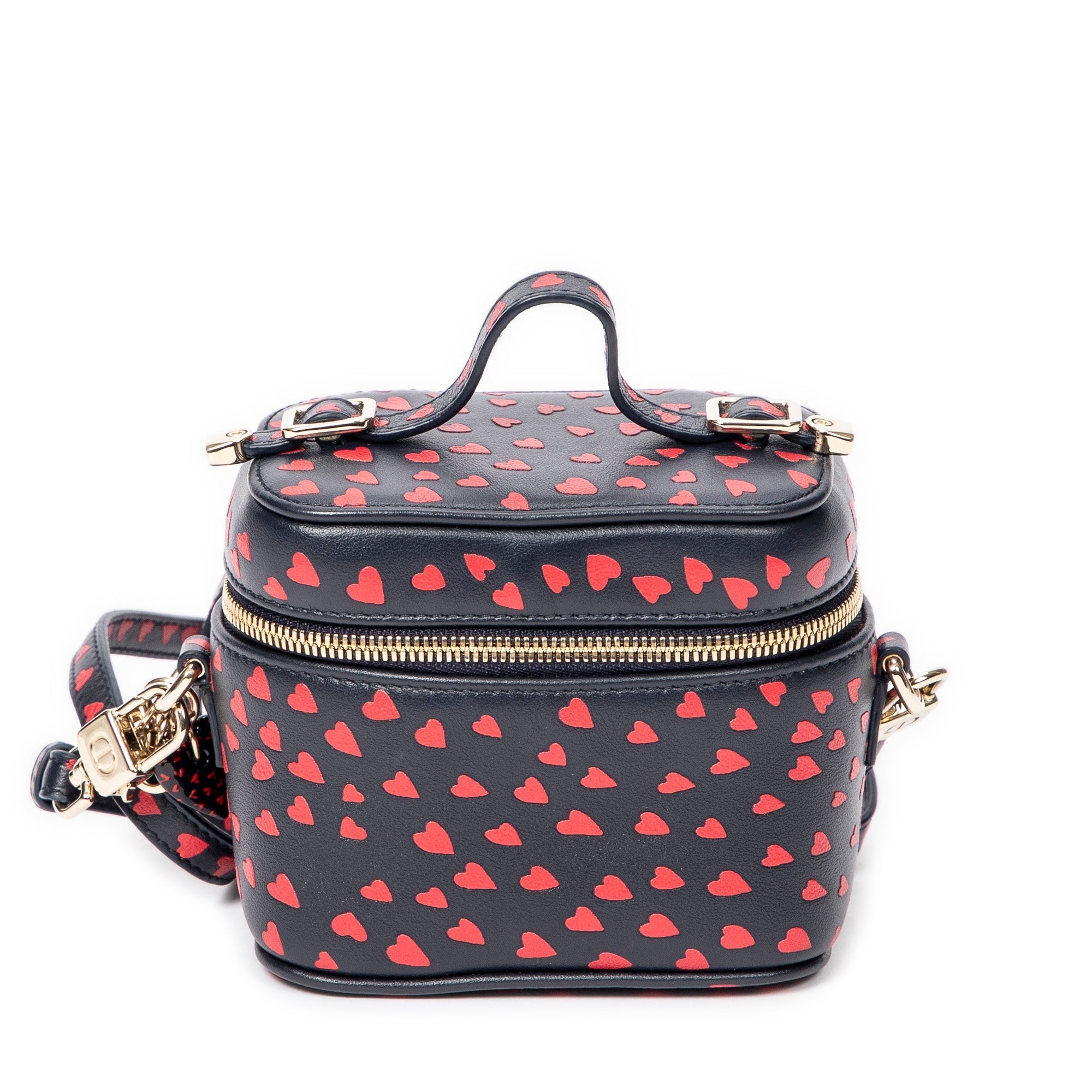Dior Shoulder Bag in Navy/Red Heart Printed Leather and Gold hardware. Dimensions - 11*10*7cm. Serial number - 40-MA-0231. Inclusions - Strap, Dustbag, Charms.