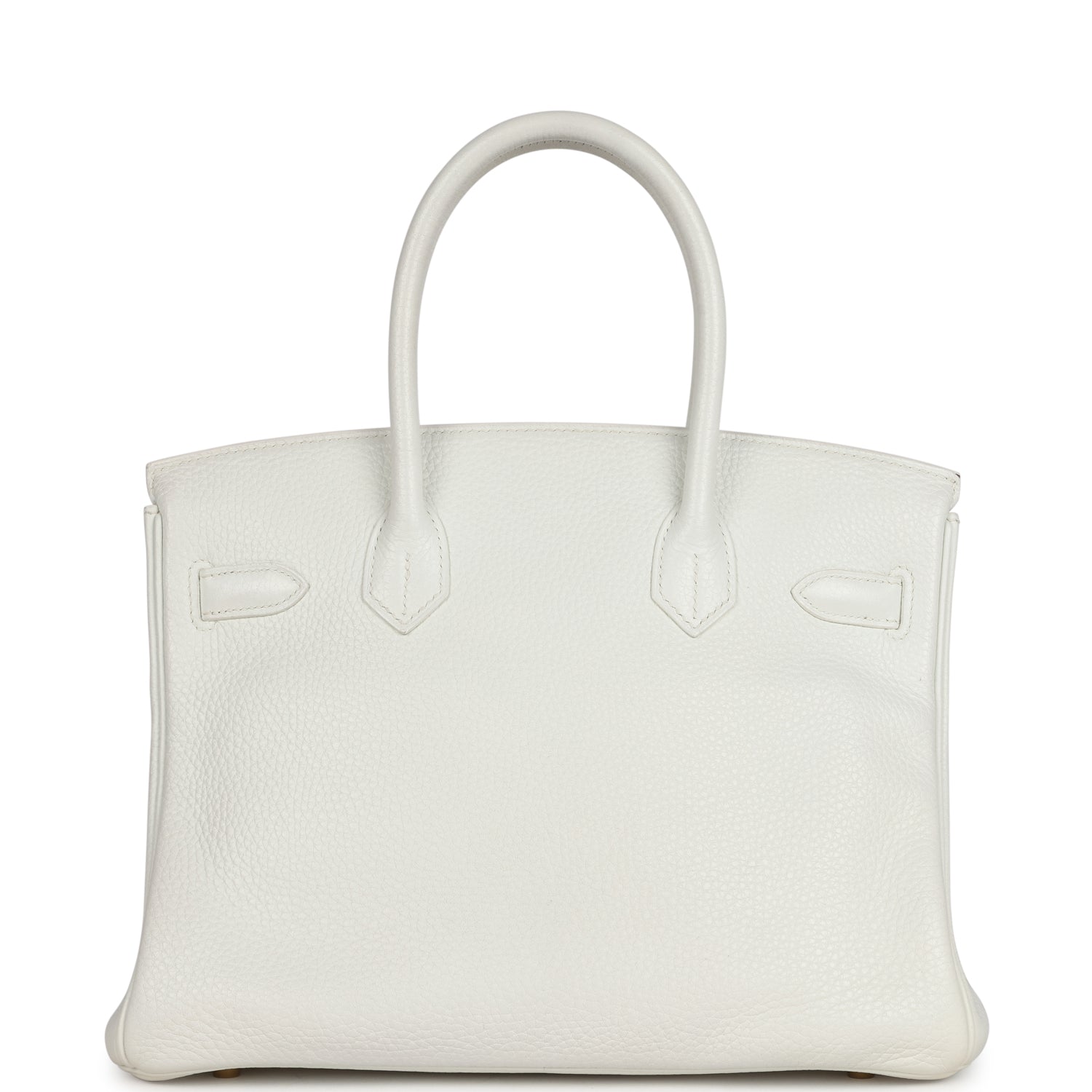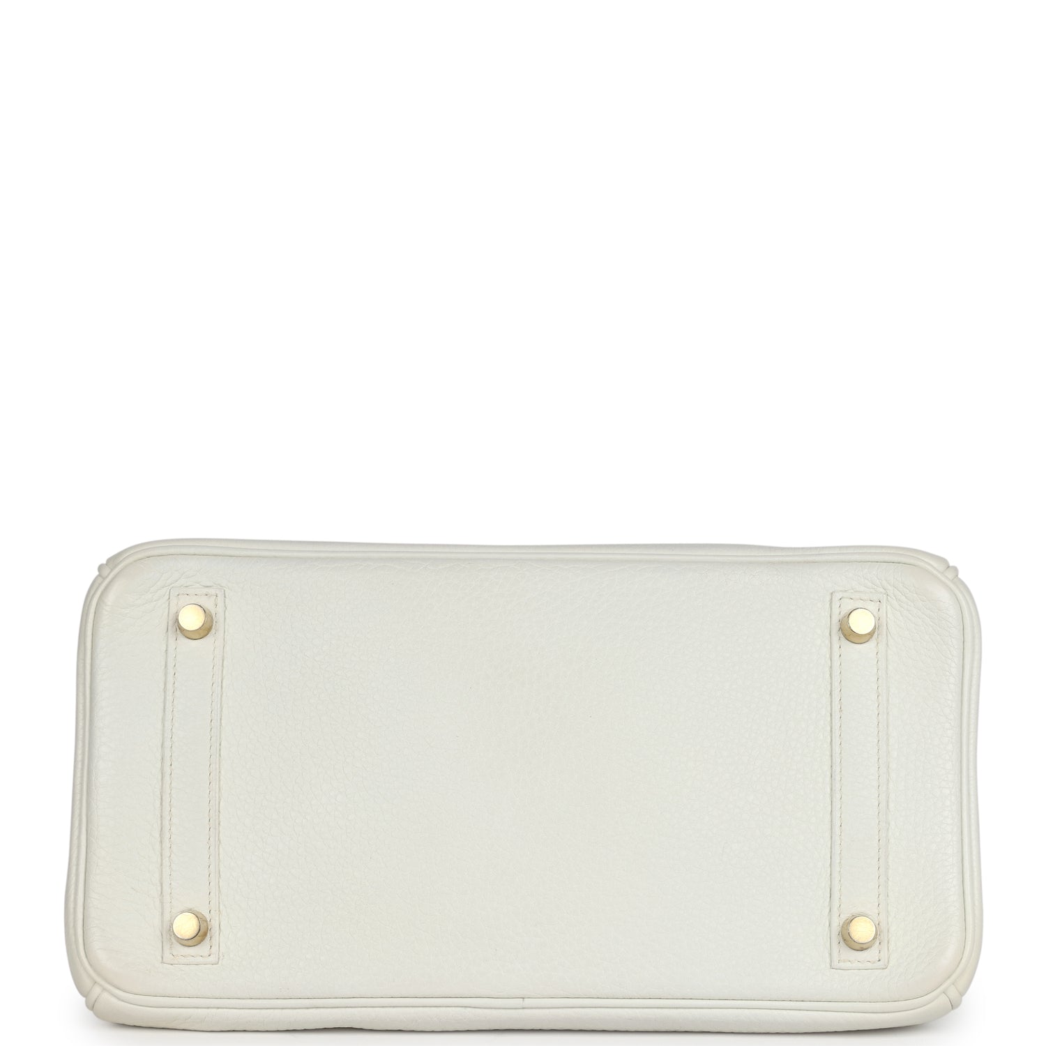 This Birkin is in White clemence leather with gold hardware and has tonal stitching, two straps with front toggle closure, clochette with lock and two keys and double rolled handles.