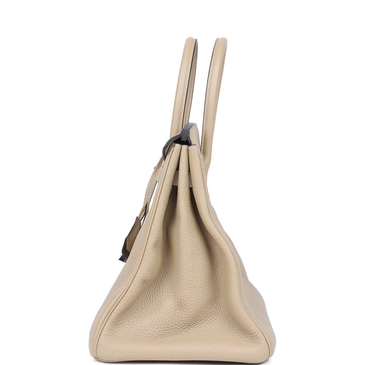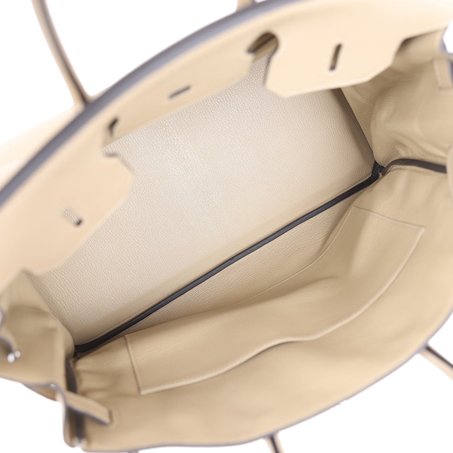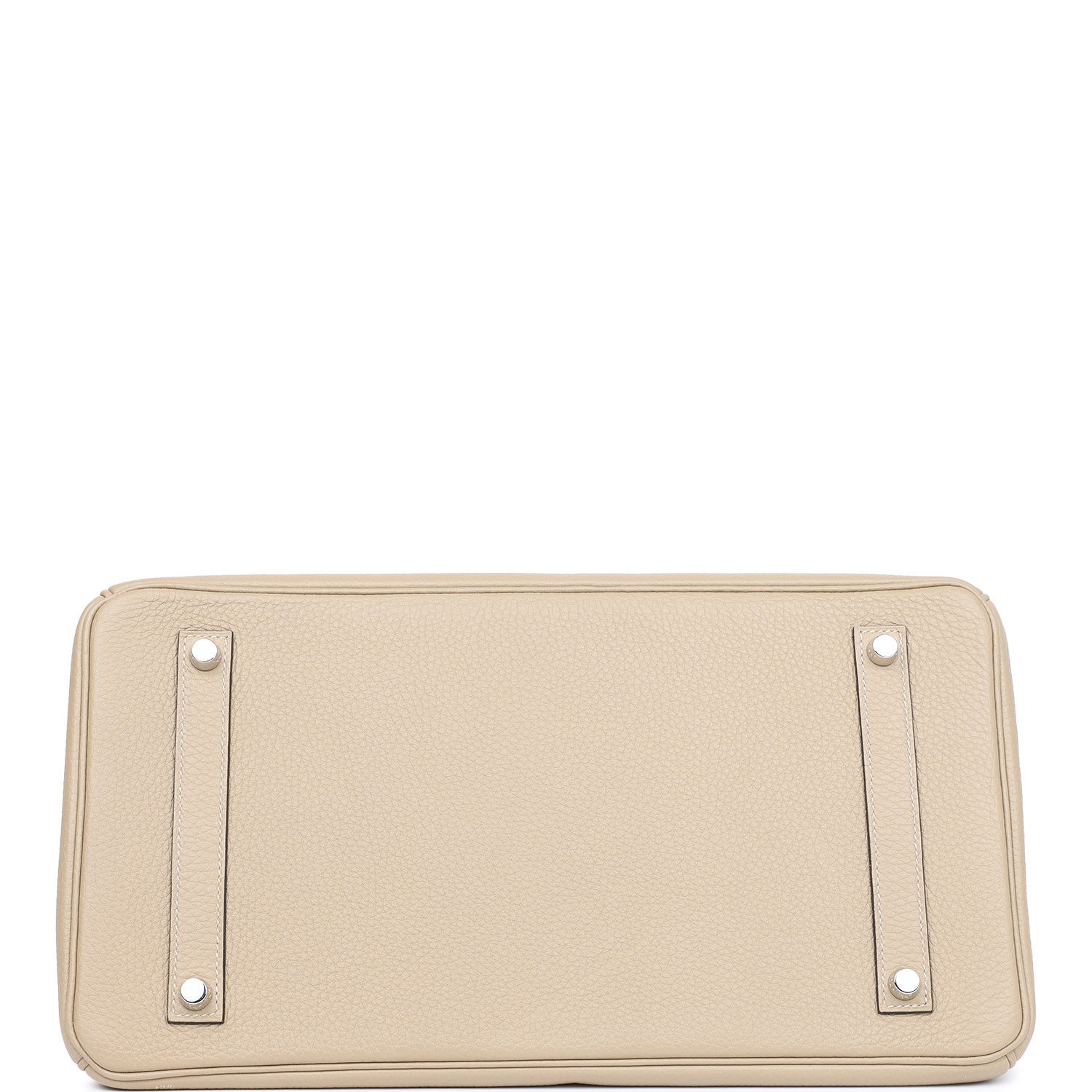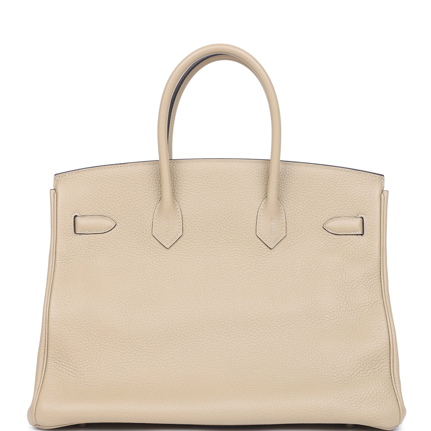 This Birkin is in Trench togo leather with palladium hardware and has tonal stitching, front flap, two straps with center toggle closure, clochette with lock and two keys, and double rolled handles.