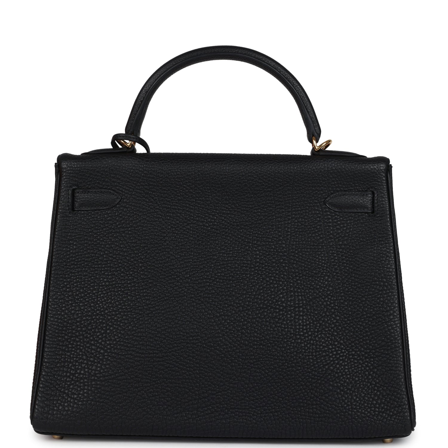 This New Kelly, in the Retourne style, is of Black Fjord leather with gold hardware and has tonal stitching, a front toggle closure, a clochette with lock and two keys and a single rolled handle and a removable shoulder strap.
