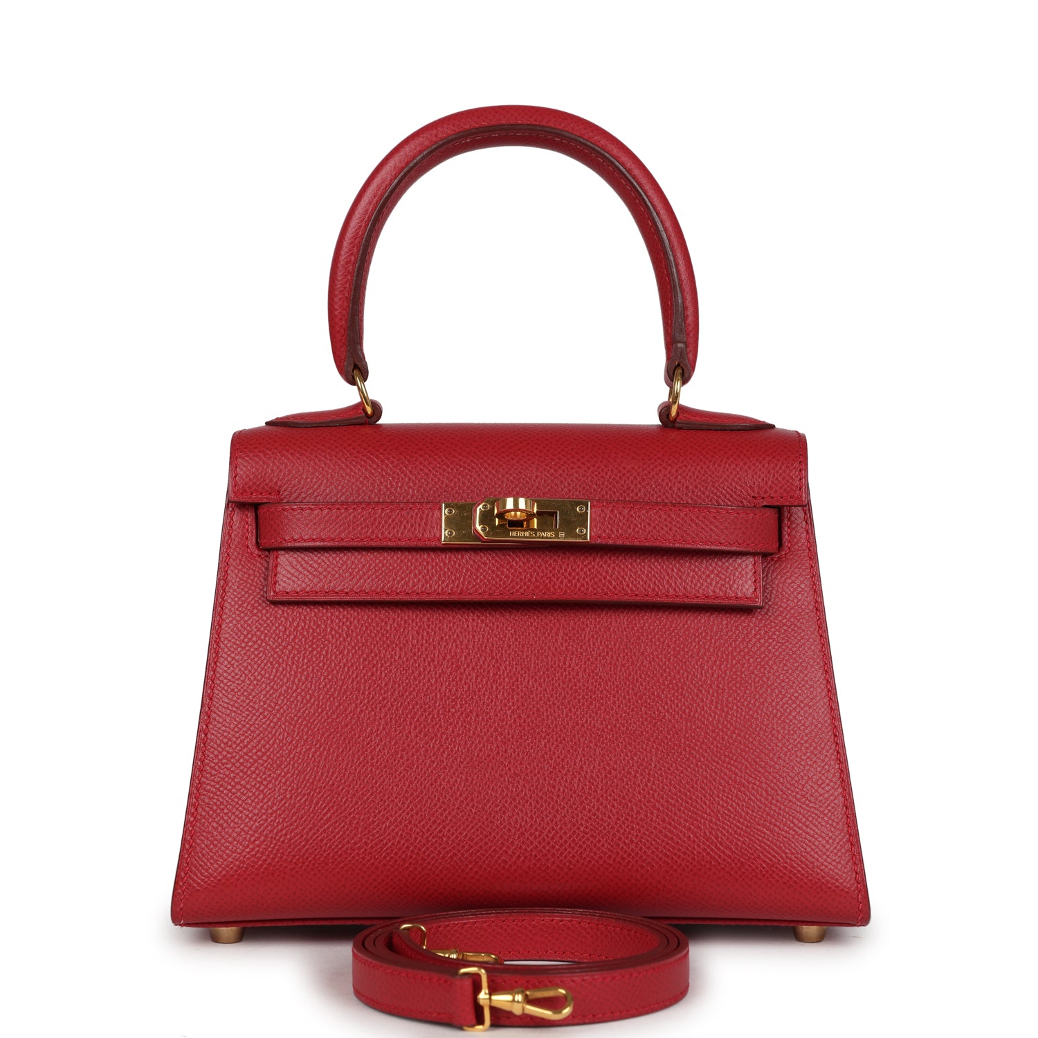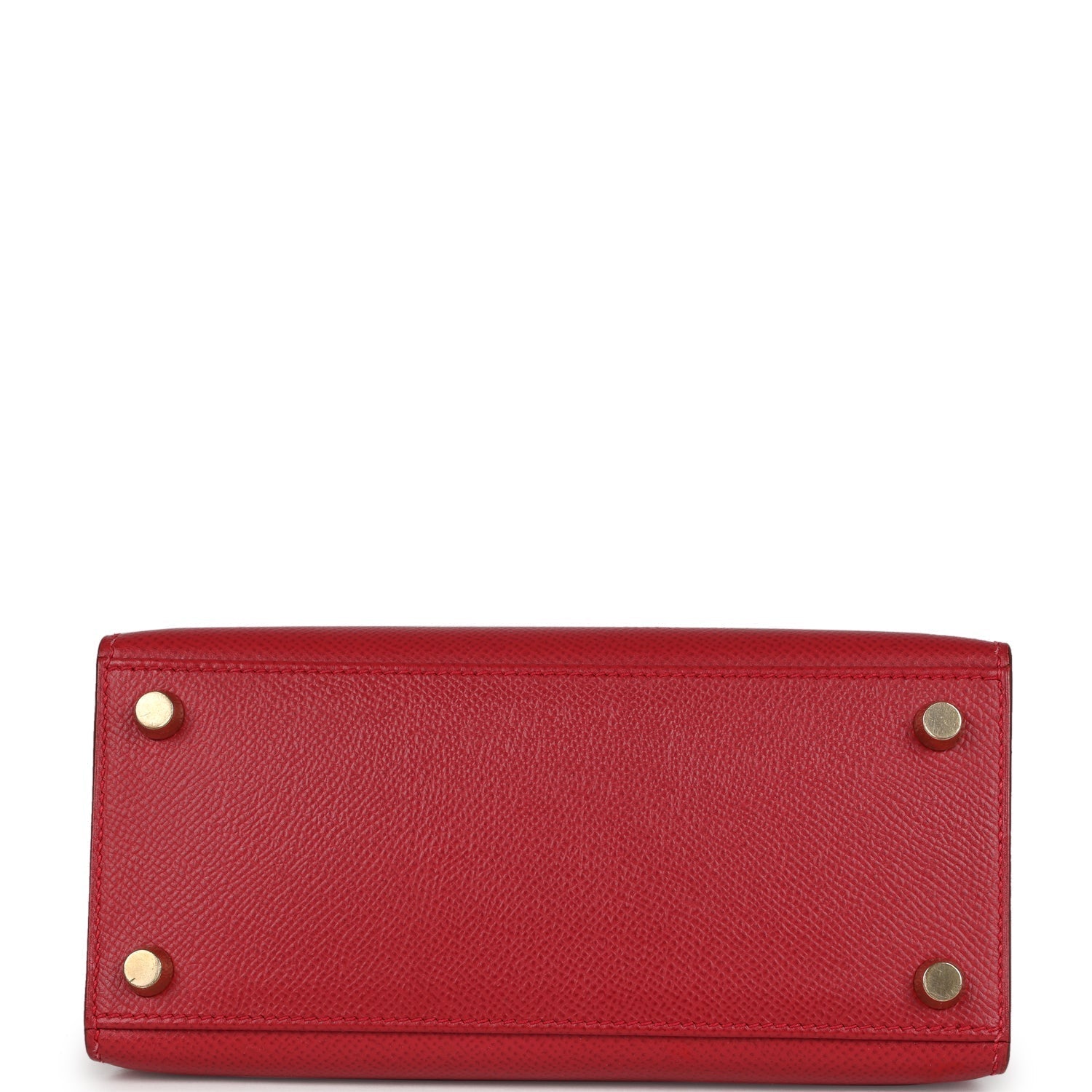 This New Kelly, in the Sellier style, is in Rouge Vif Courchevel leather with gold hardware and has tonal stitching, two front straps with front toggle closure, single rolled handle and removable shoulder strap.