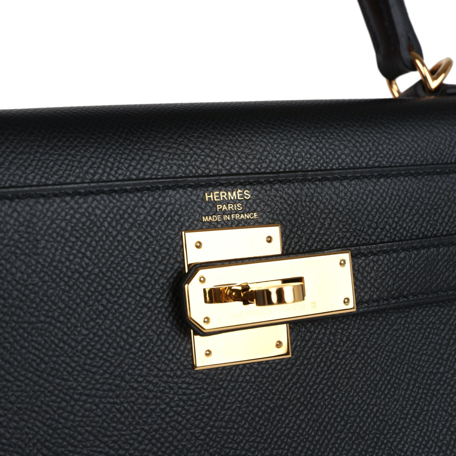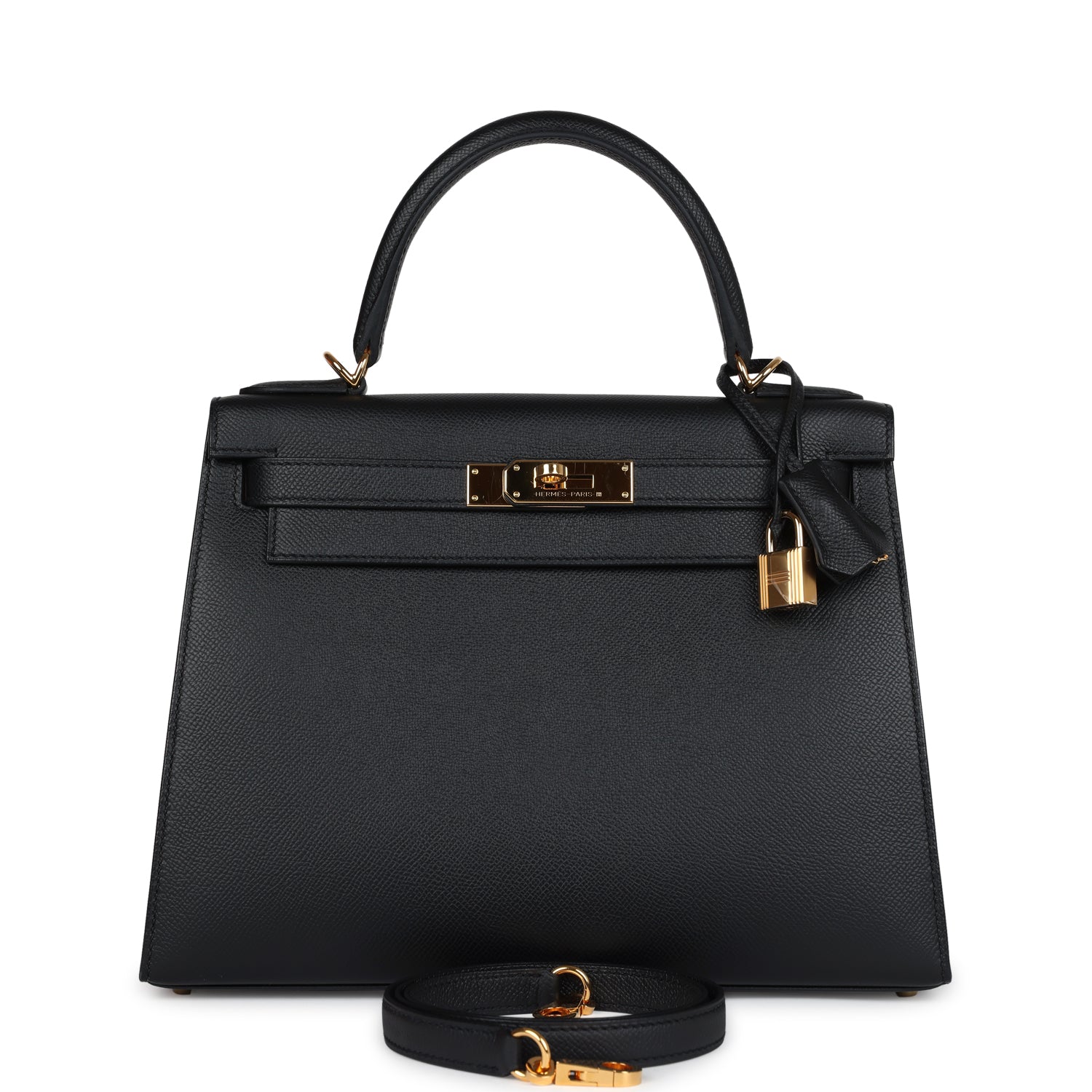This Kelly Sellier is in Black epsom leather with gold hardware and has tonal stitching, a front toggle closure, a clochette with lock and two keys, a single rolled handle and an optional shoulder strap.