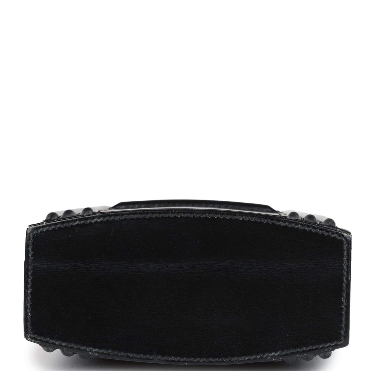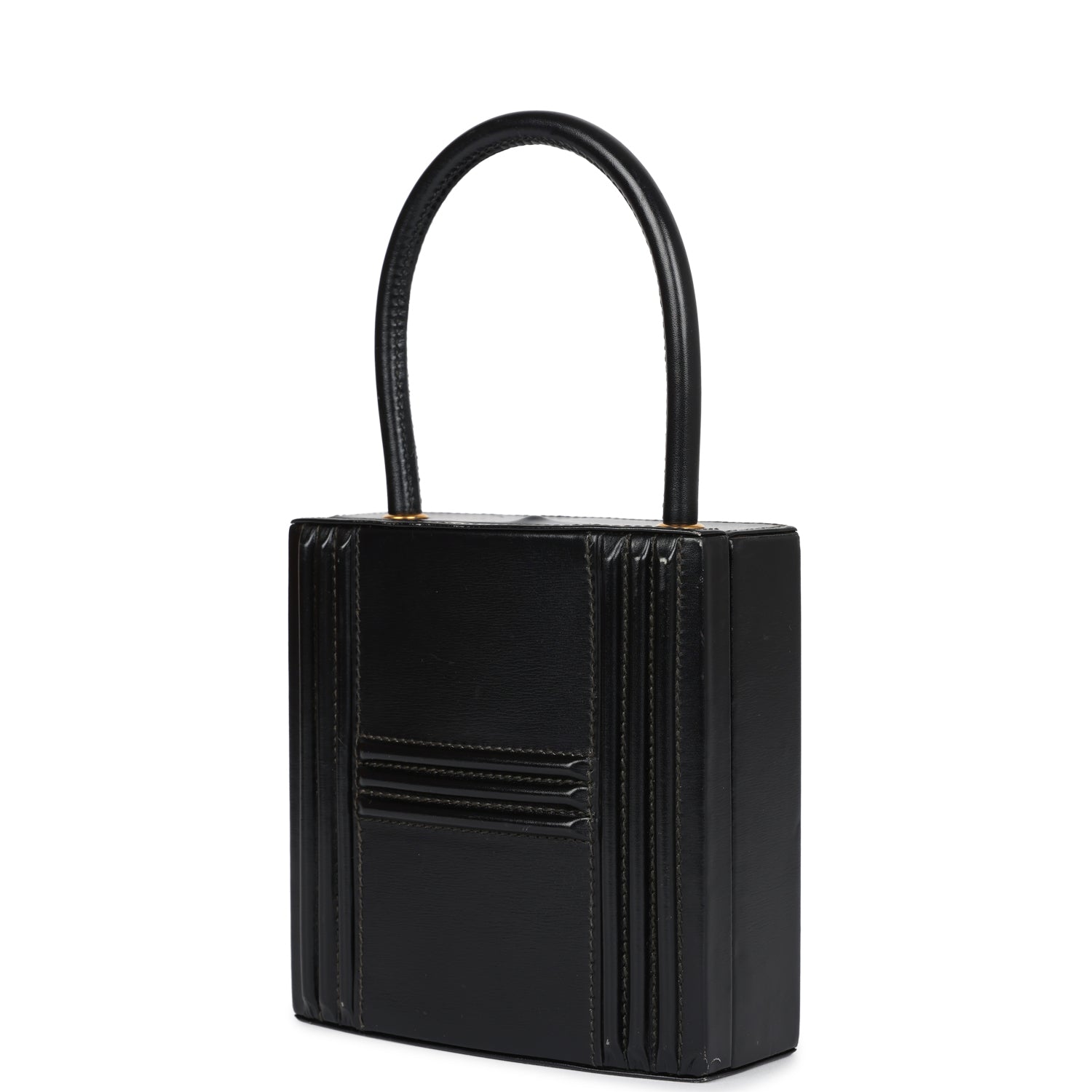 This New Hermes Mini Cadena Lock Bag is of Black box calf leather with gold hardware, featuring tonal stitching, with the signature Hermes padlock detailing, a hidden push & snap lock closure and a single rolled top handle.