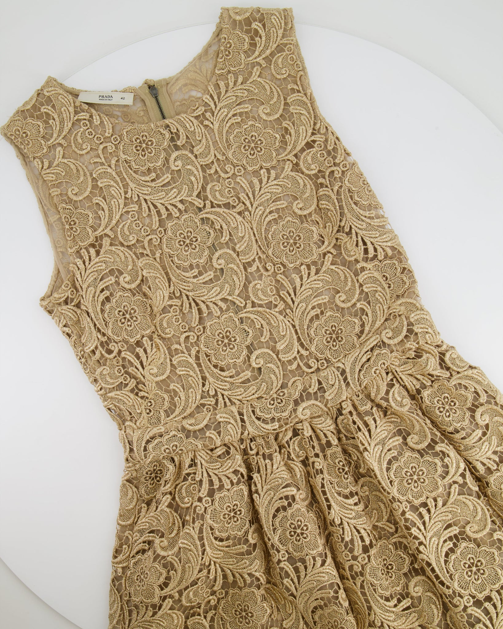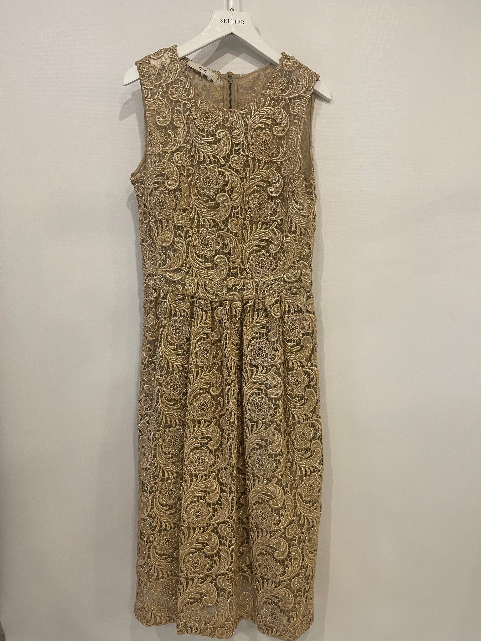 Prada Metallic Gold Sleeveless Floral Crochet Midi Dress Size IT 42 (UK 10)