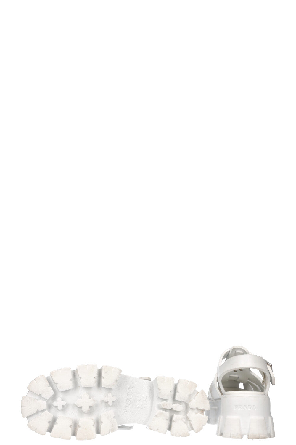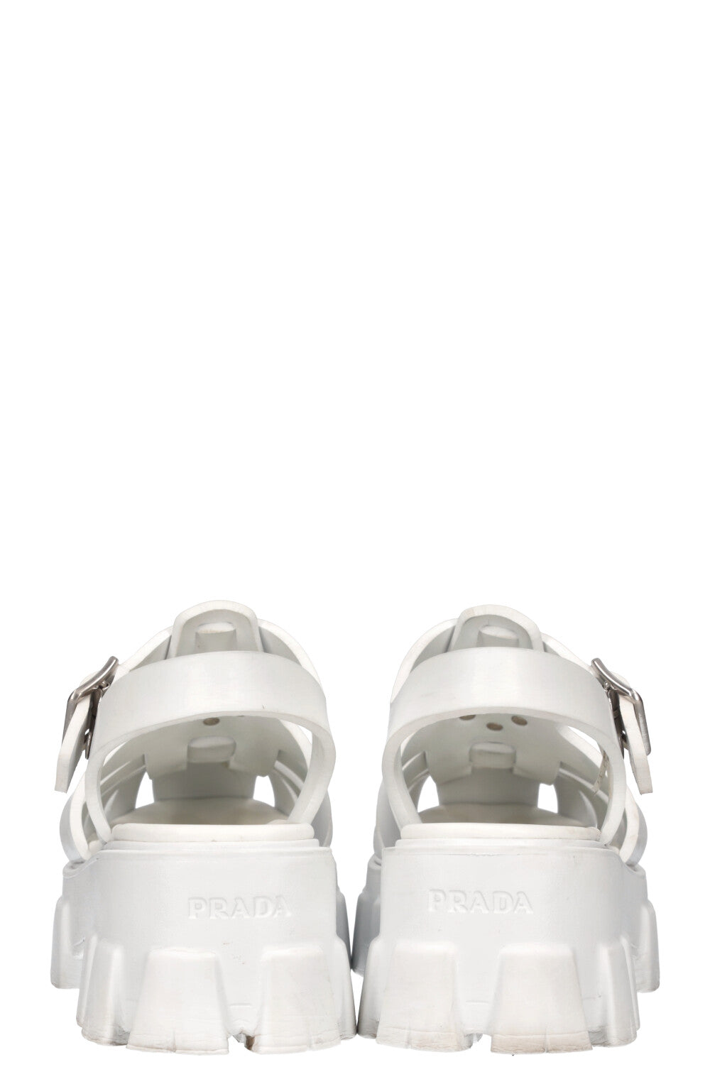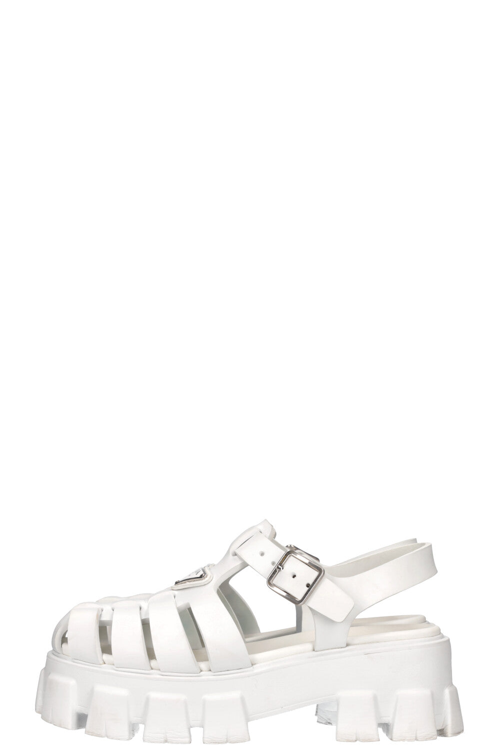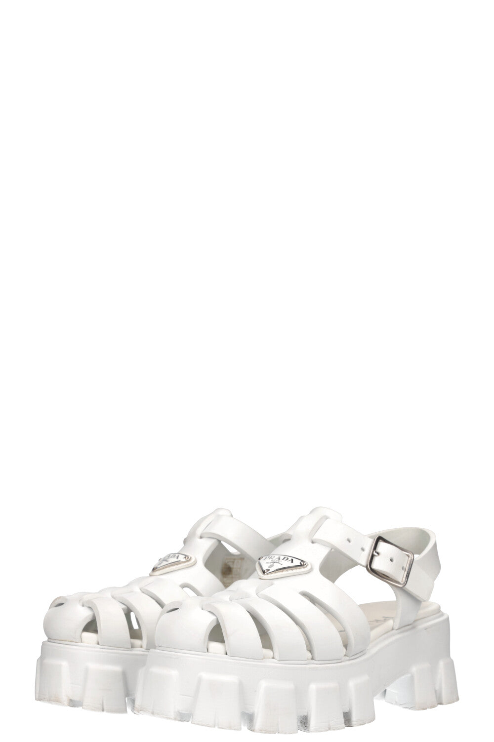 We love: Markante Sandalen von Prada. Mit ikonischer Plakette an der Vorderseite