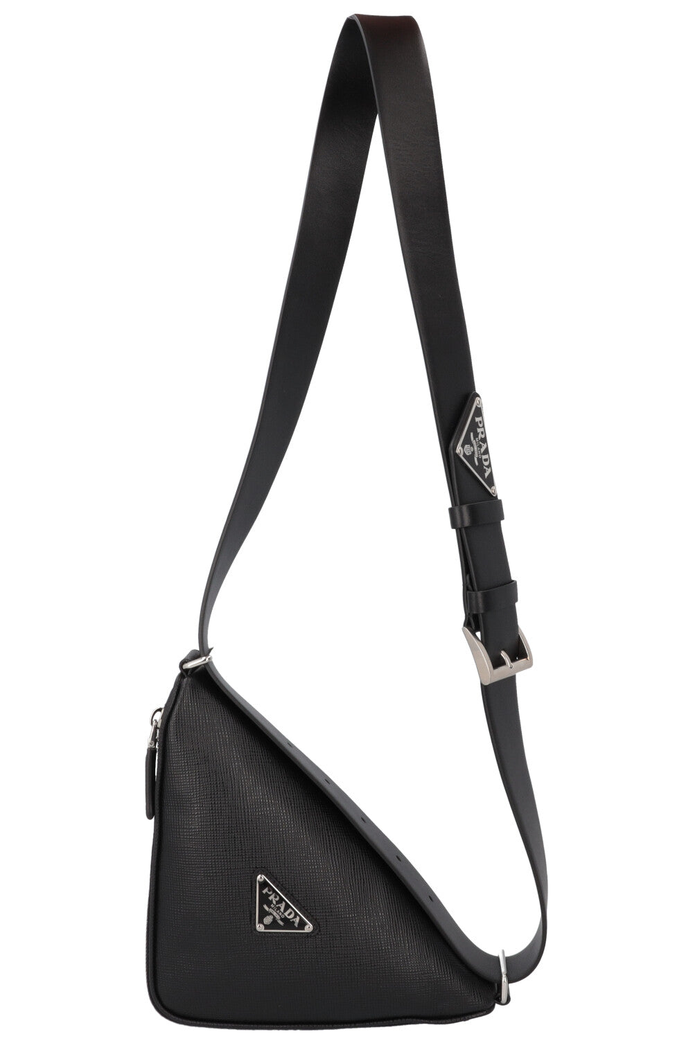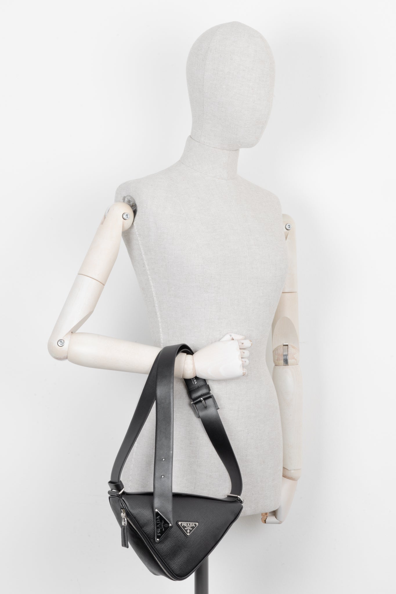 We Love: Das Prada-Dreieck, das erstmals auf Koffern von Mario Prada eingeführt wurde, symbolisiert Einzigartigkeit und Modernität mit seiner minimalistischen und universellen Silhouette. Jede Saison wird es auf unterschiedliche Weise neu interpretiert. Diese Mini-Tasche wurde von der geometrischen Form des Dreiecks inspiriert und verfügt über ein modernes und modulares Design. Dadurch kann sie auf vielfältige Weise getragen werden: Die beiden Dreiecke, bestehend aus Leder und Stoff, können voneinander getrennt und als separate Handtaschen oder, wenn die Griffe entfernt werden, als Clutches genutzt werden. Diese Vielseitigkeit ermöglicht es, den Look je nach Bedarf anzupassen und verschiedene Stilrichtungen zu erkunden.