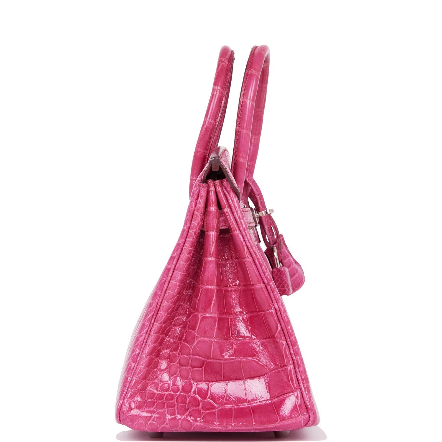 This Birkin is in Fuchsia shiny Mississippiensis alligator with palladium hardware and has tonal stitching, front strap, two straps with center toggle closure, clochette with lock and two keys and double rolled handles.