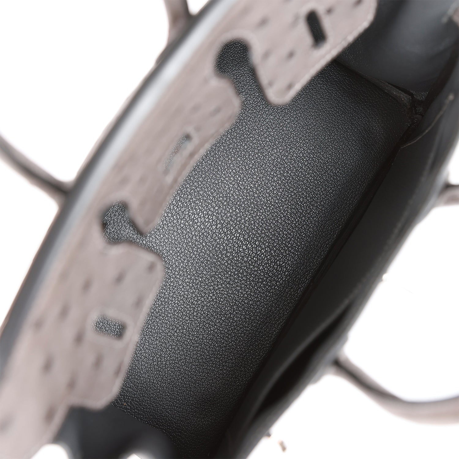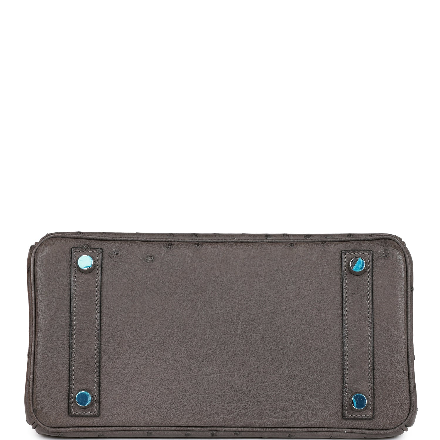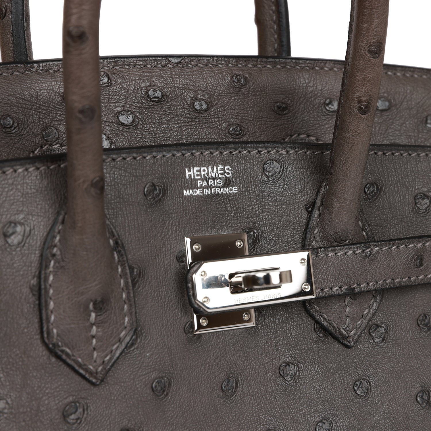 This Birkin is in Graphite ostrich with palladium hardware and features tonal stitching, front flap, two straps with center toggle closure, clochette with lock and two keys, and double rolled handles.
