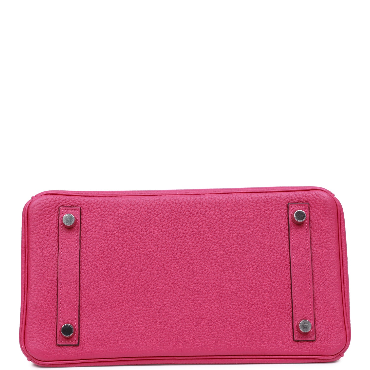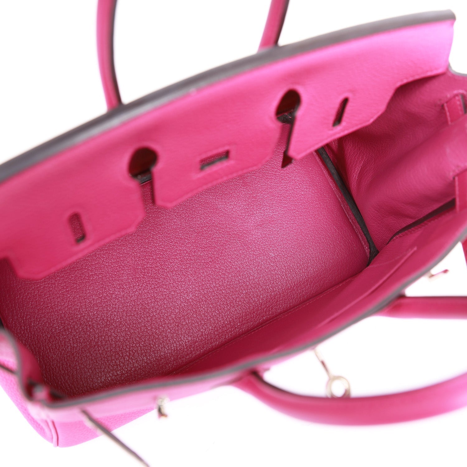 This Birkin is in Rose Pourpre togo leather with palladium hardware and has tonal stitching, front flap, two straps with center toggle closure, clochette with lock and two keys, and double rolled handles.