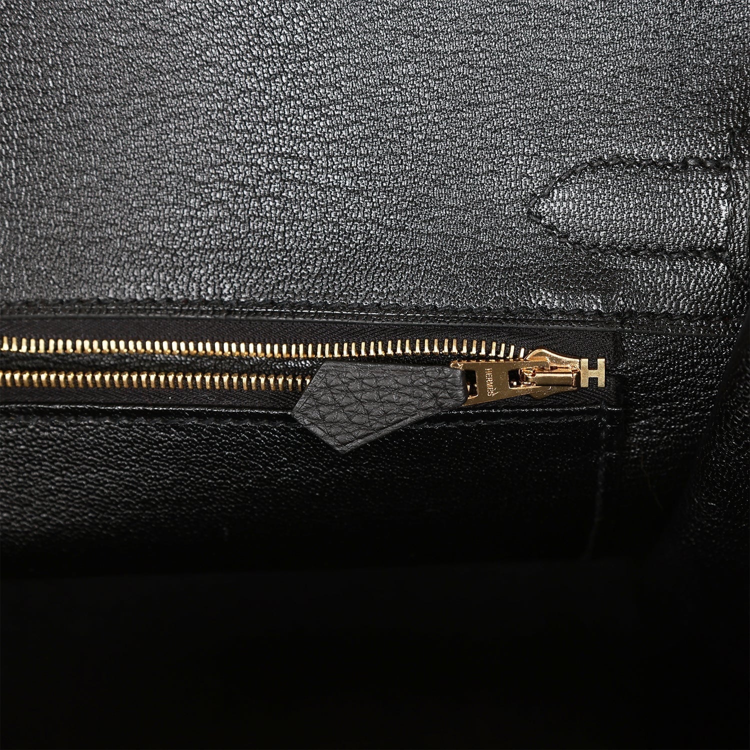 This Birkin is in Black togo leather with rose gold hardware and has tonal stitching, front flap, two straps with center toggle closure, clochette with lock and two keys, and double rolled handles.