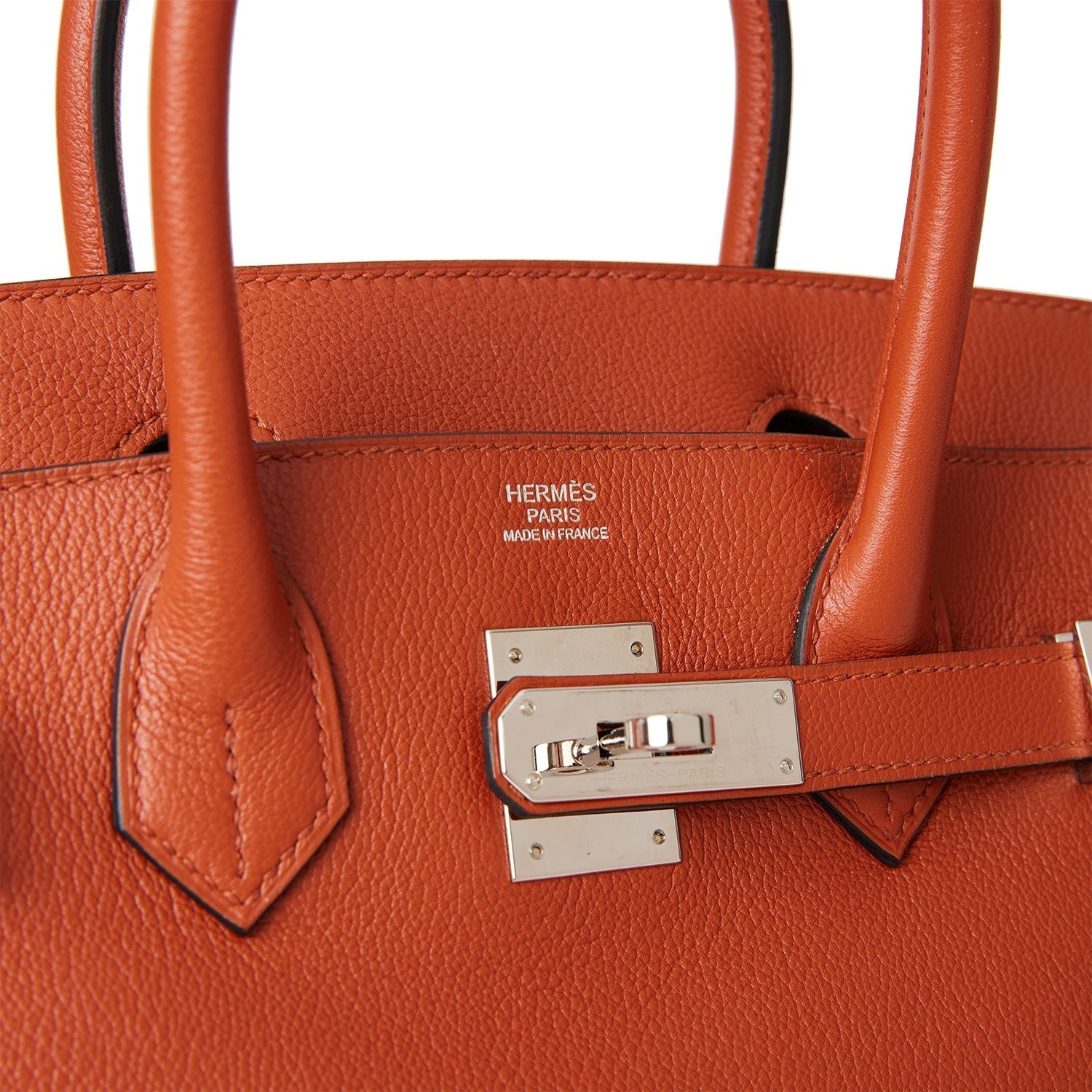 This Birkin is in Cuivre Novillo leather with palladium hardware and has tonal stitching, a front toggle closure, a clochette with lock and two keys, and double rolled handles.