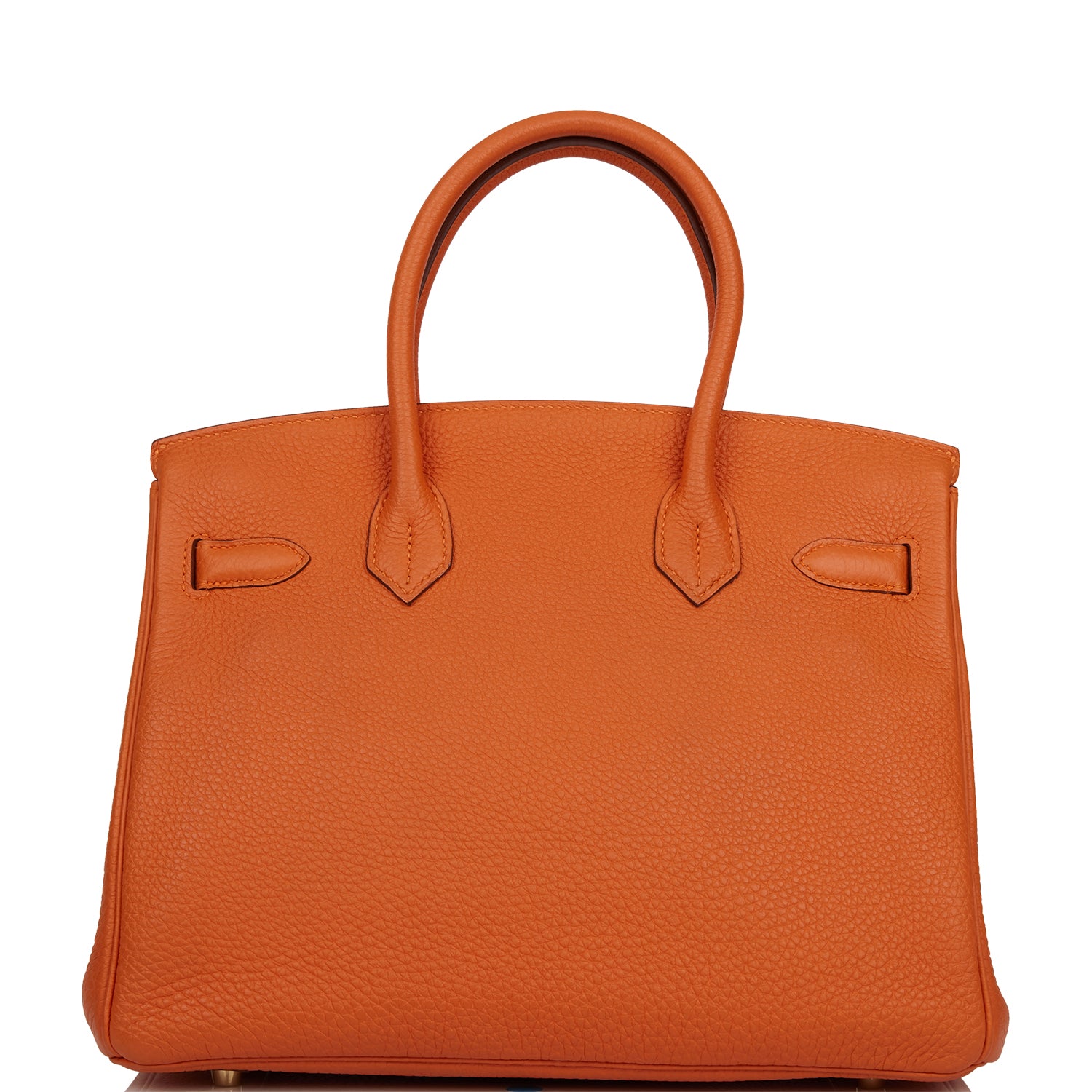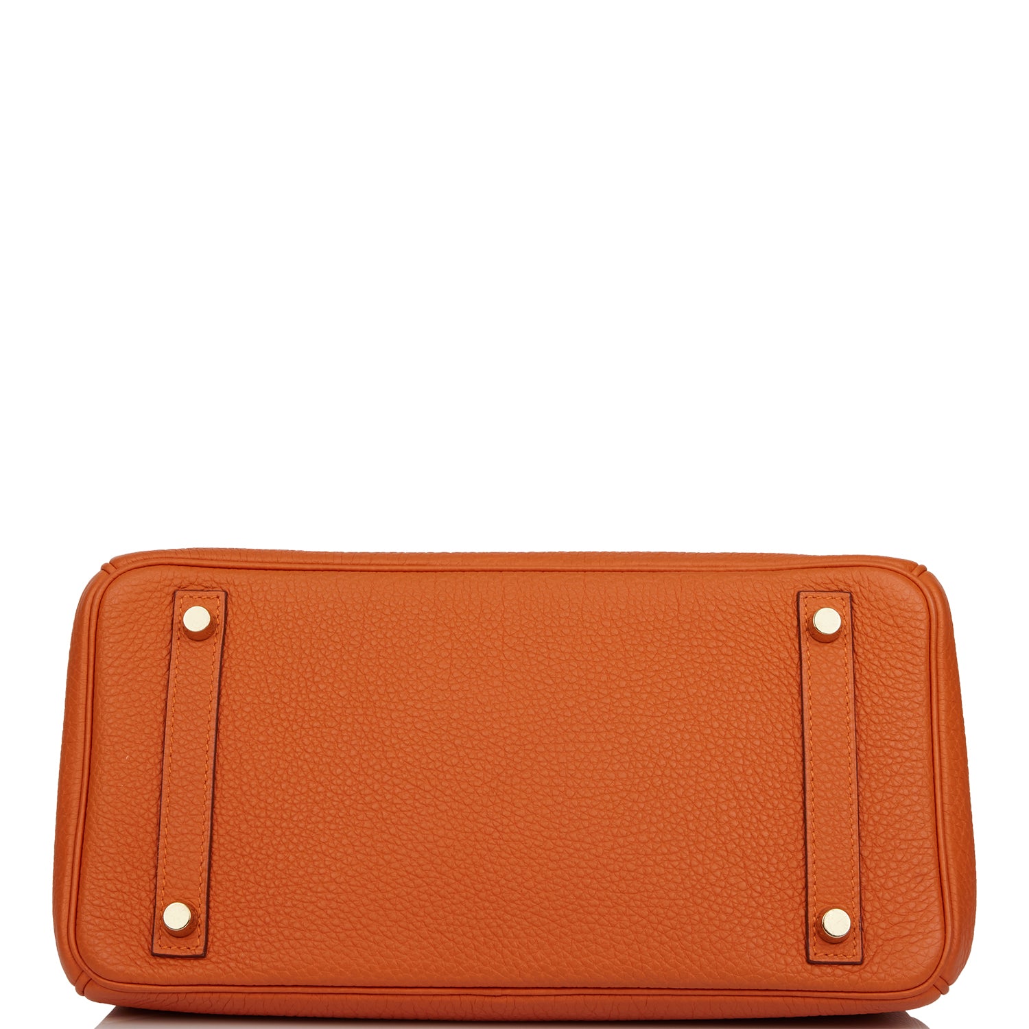 This Birkin is in Orange clemence leather with gold hardware and has tonal stitching, front flap, two straps with center toggle closure, clochette with lock and two keys, and double rolled handles.