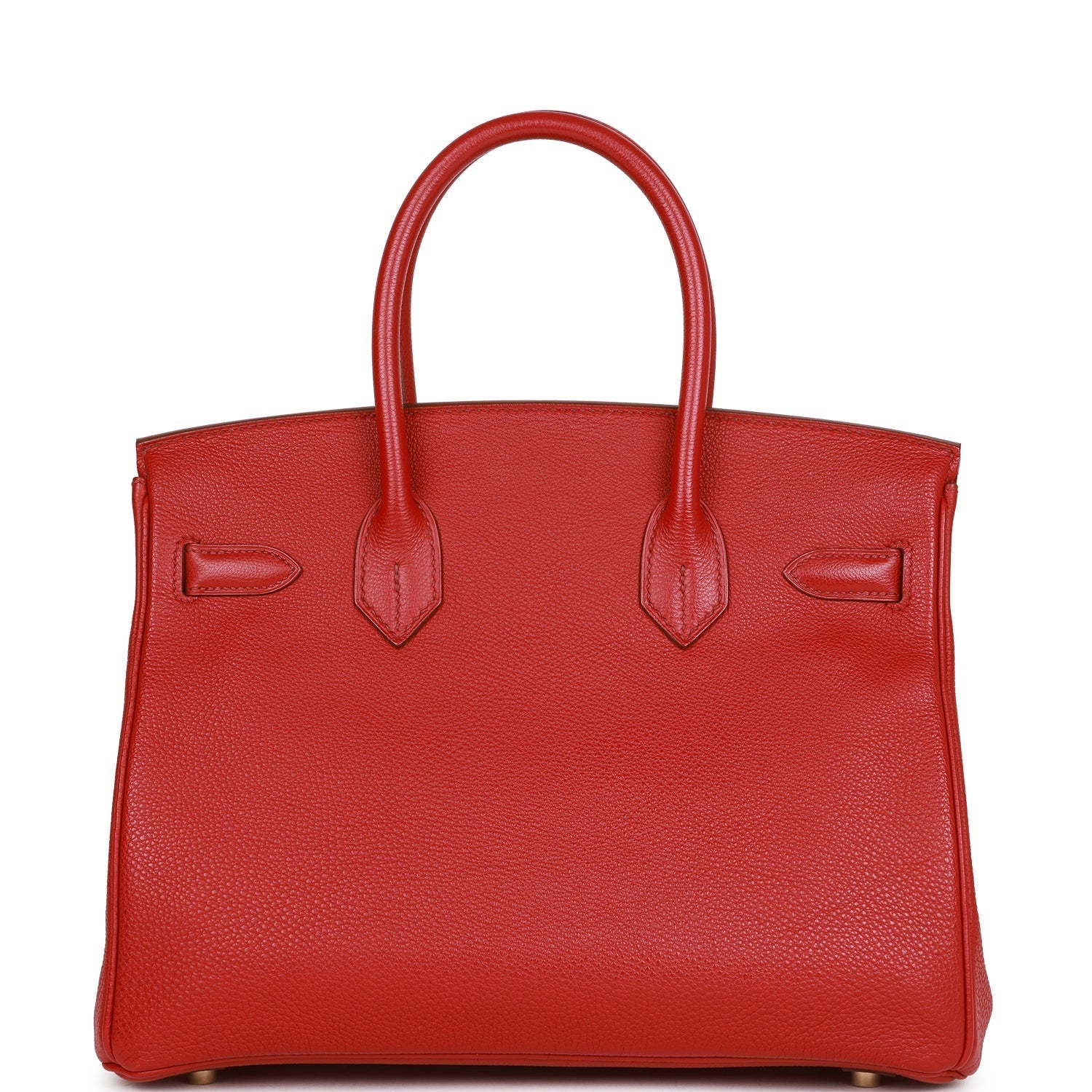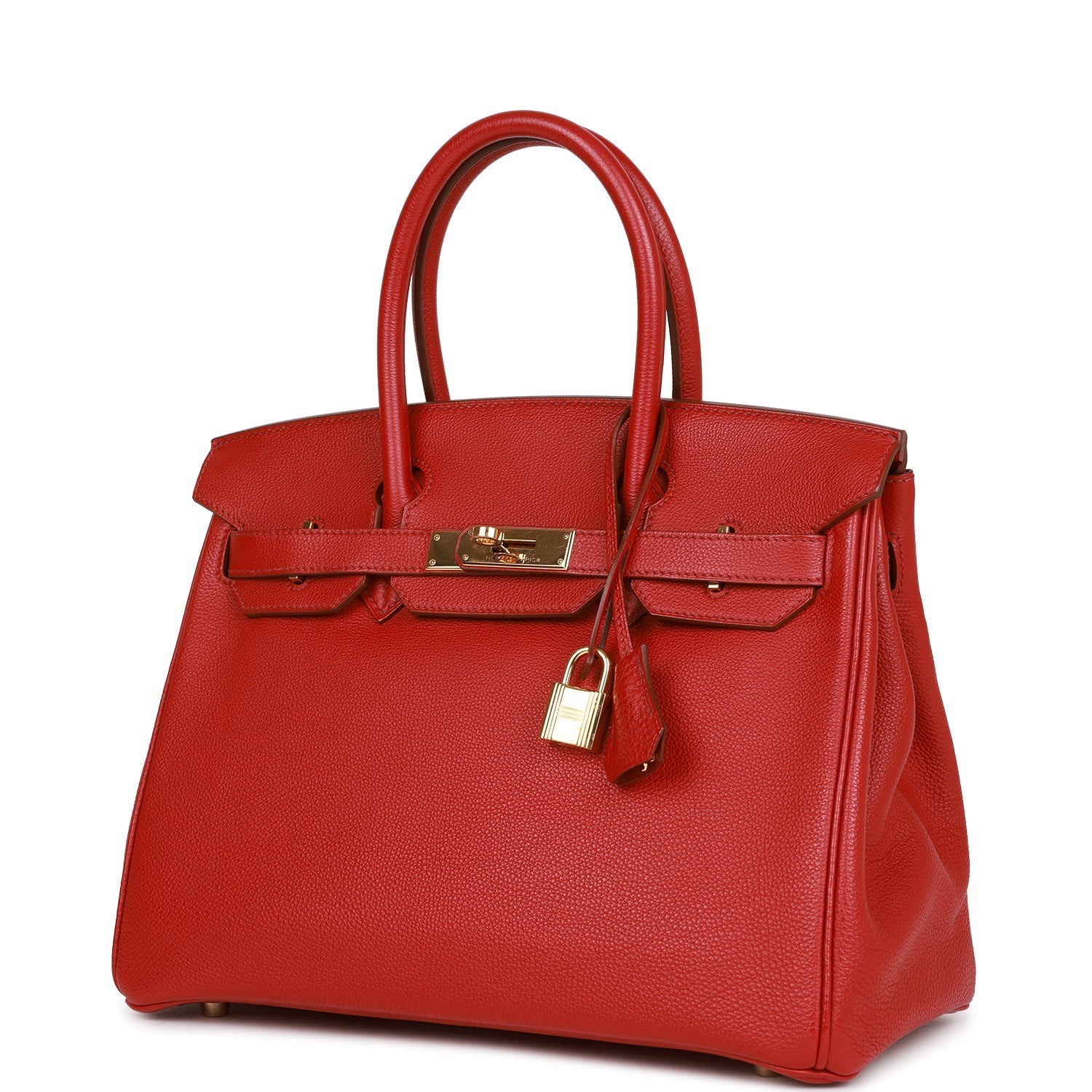 This Birkin is in Rouge Garance togo leather with gold hardware and has tonal stitching, front flap, two straps with center toggle closure, clochette with lock and two keys, and double rolled handles.