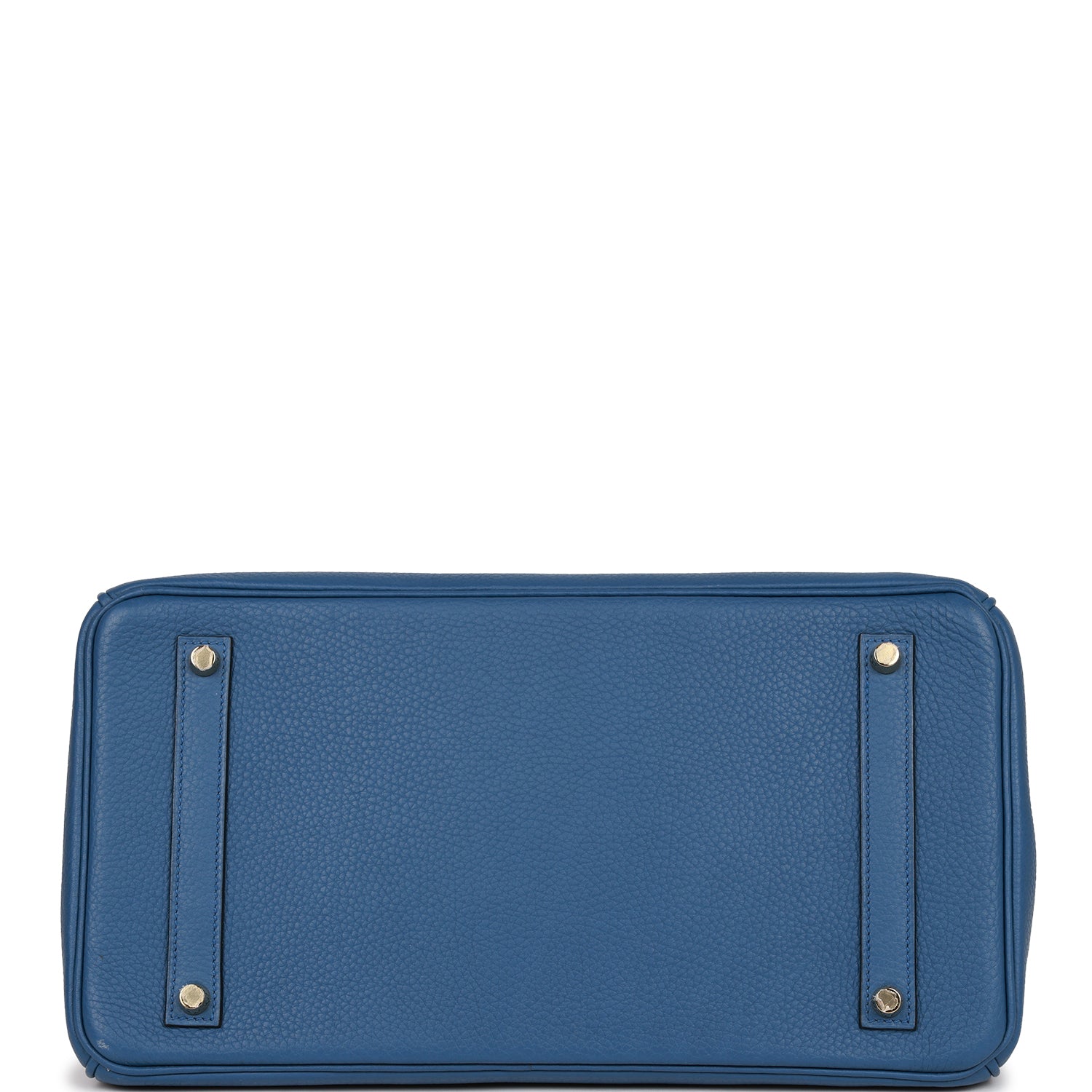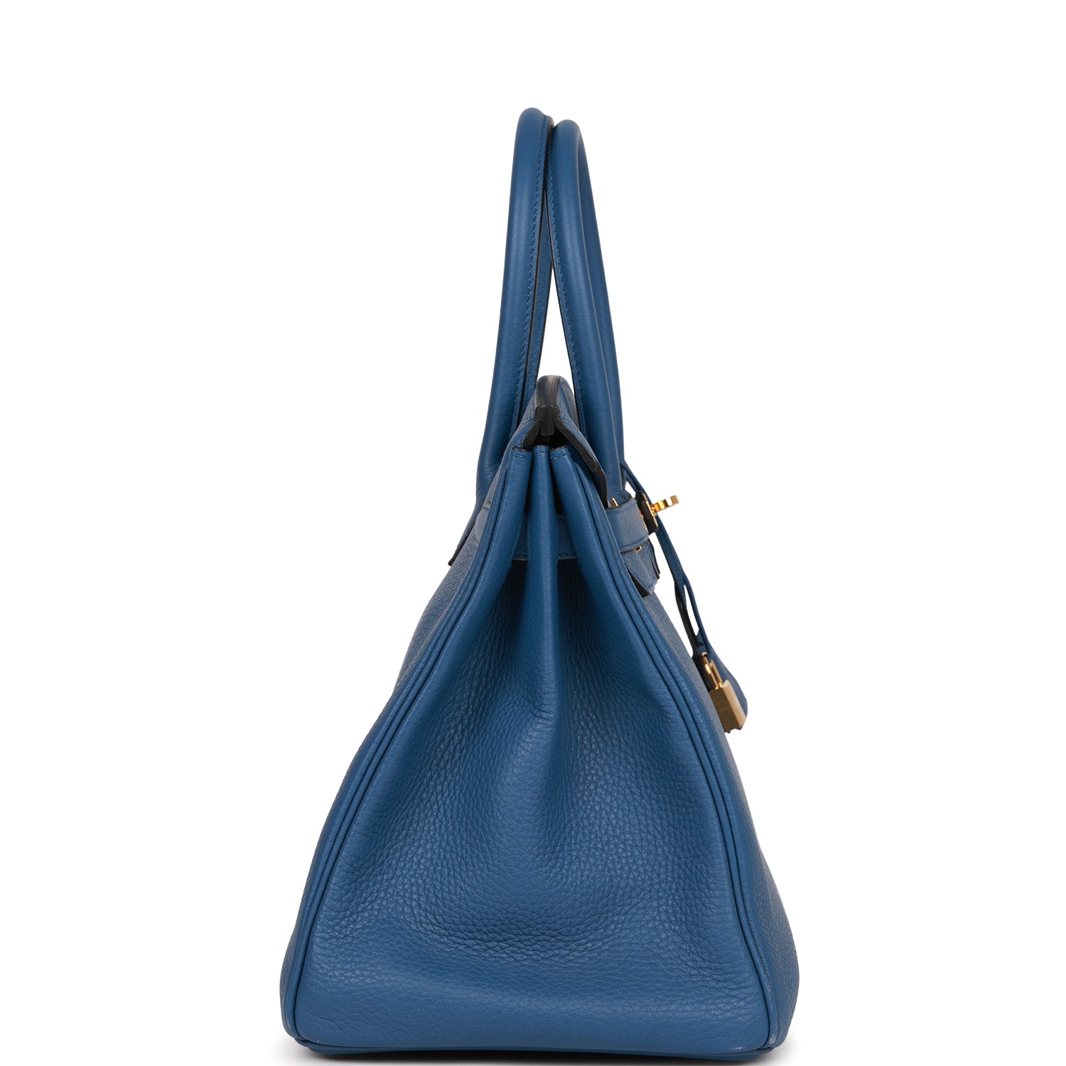 This Birkin is in Bleu Agate togo leather with gold hardware and has tonal stitching, front flap, two straps with center toggle closure, clochette with lock and two keys, and double rolled handles.
