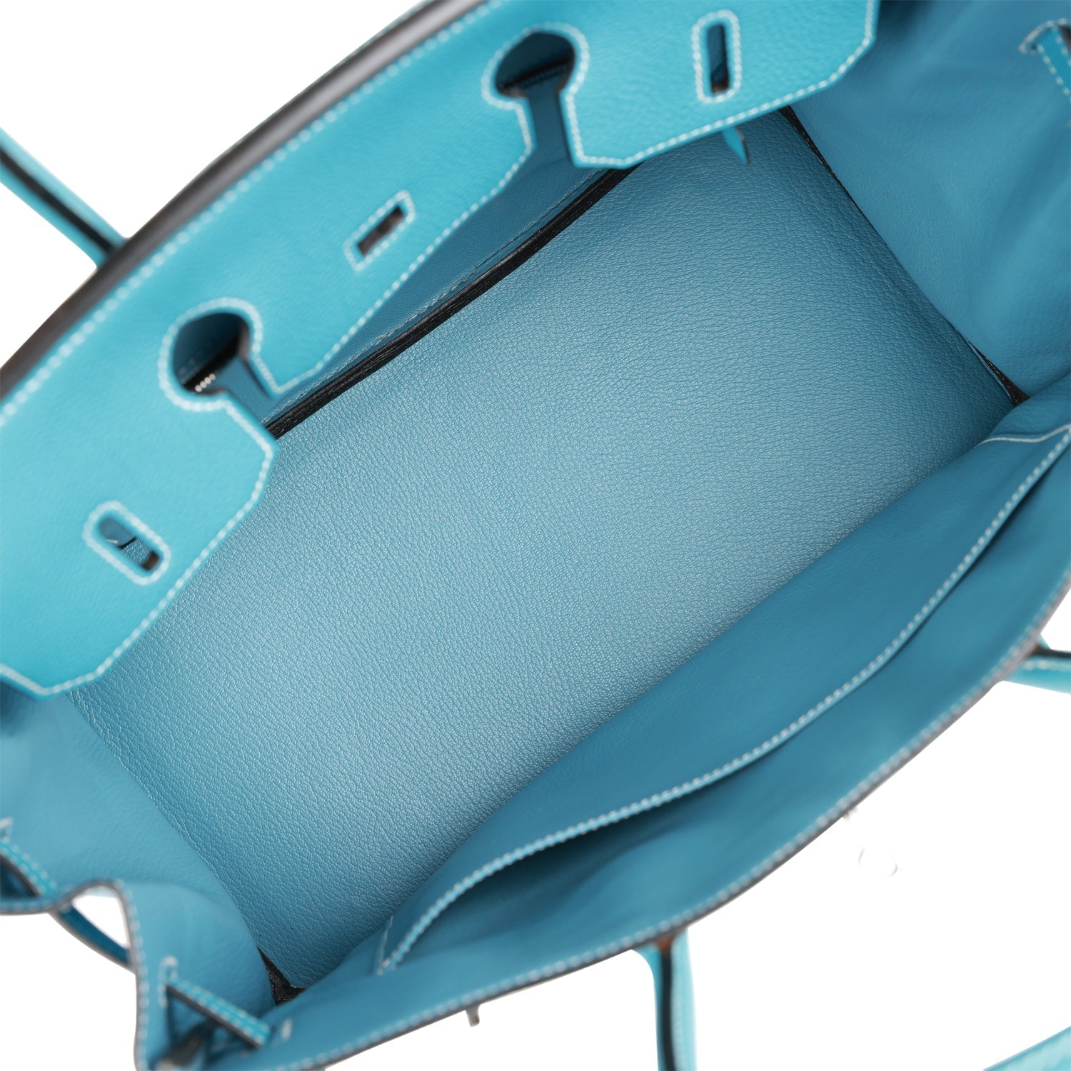 This Birkin is in Bleu Jean togo leather with palladium hardware and has white contrast stitching, front flap, two straps with center toggle closure, clochette with lock and two keys, and double rolled handles.