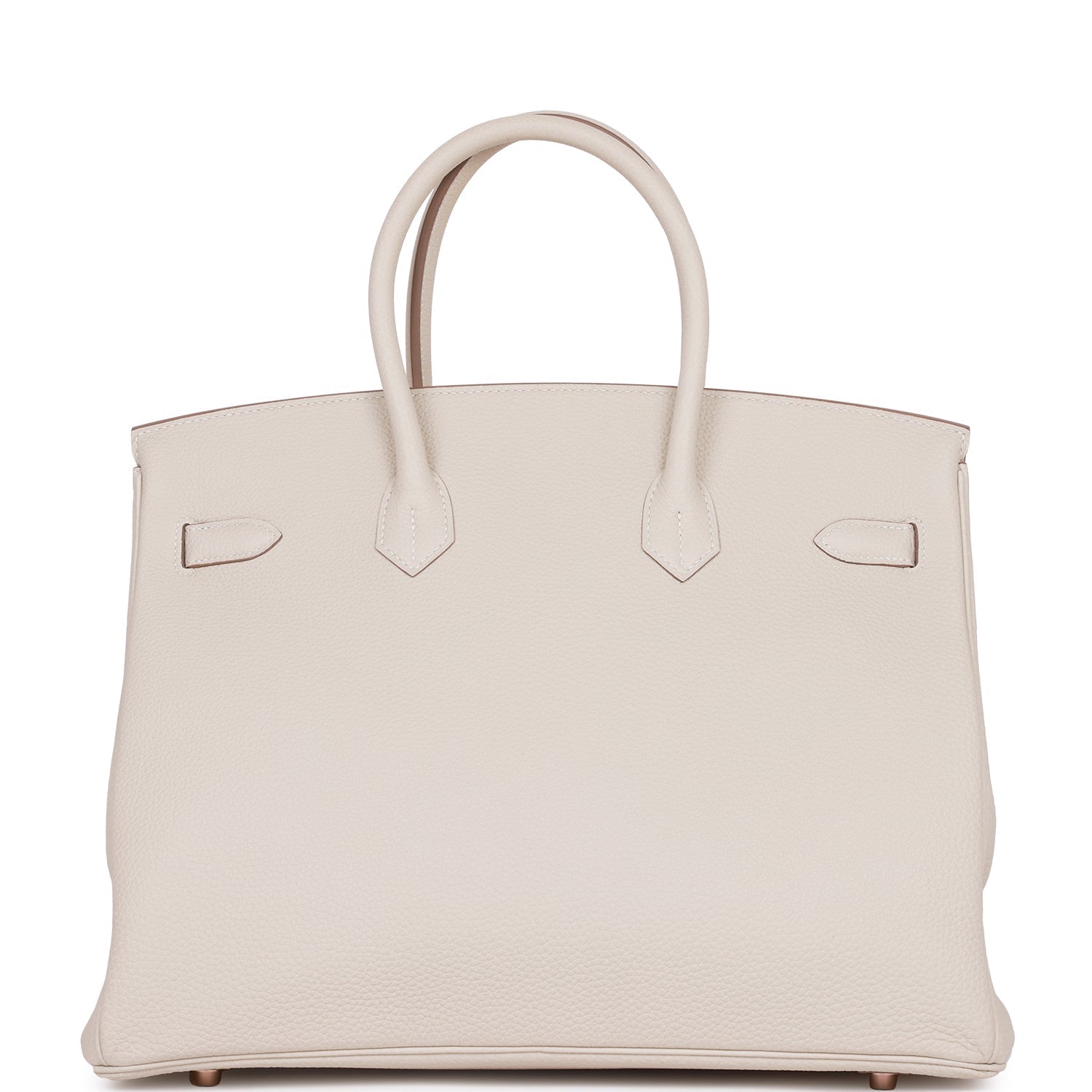 This Birkin is in Craie togo leather with rose gold hardware and has tonal stitching, front flap, two straps with center toggle closure, clochette with lock and two keys, and double rolled handles.