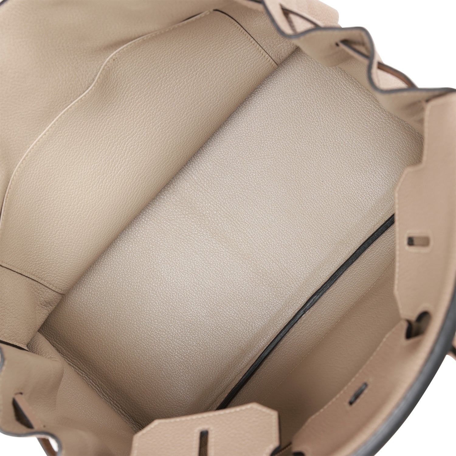 This Birkin is in Gris Tourterelle togo leather with palladium hardware and has tonal stitching, front flap, two straps with center toggle closure, clochette with lock and two keys, and double rolled handles.