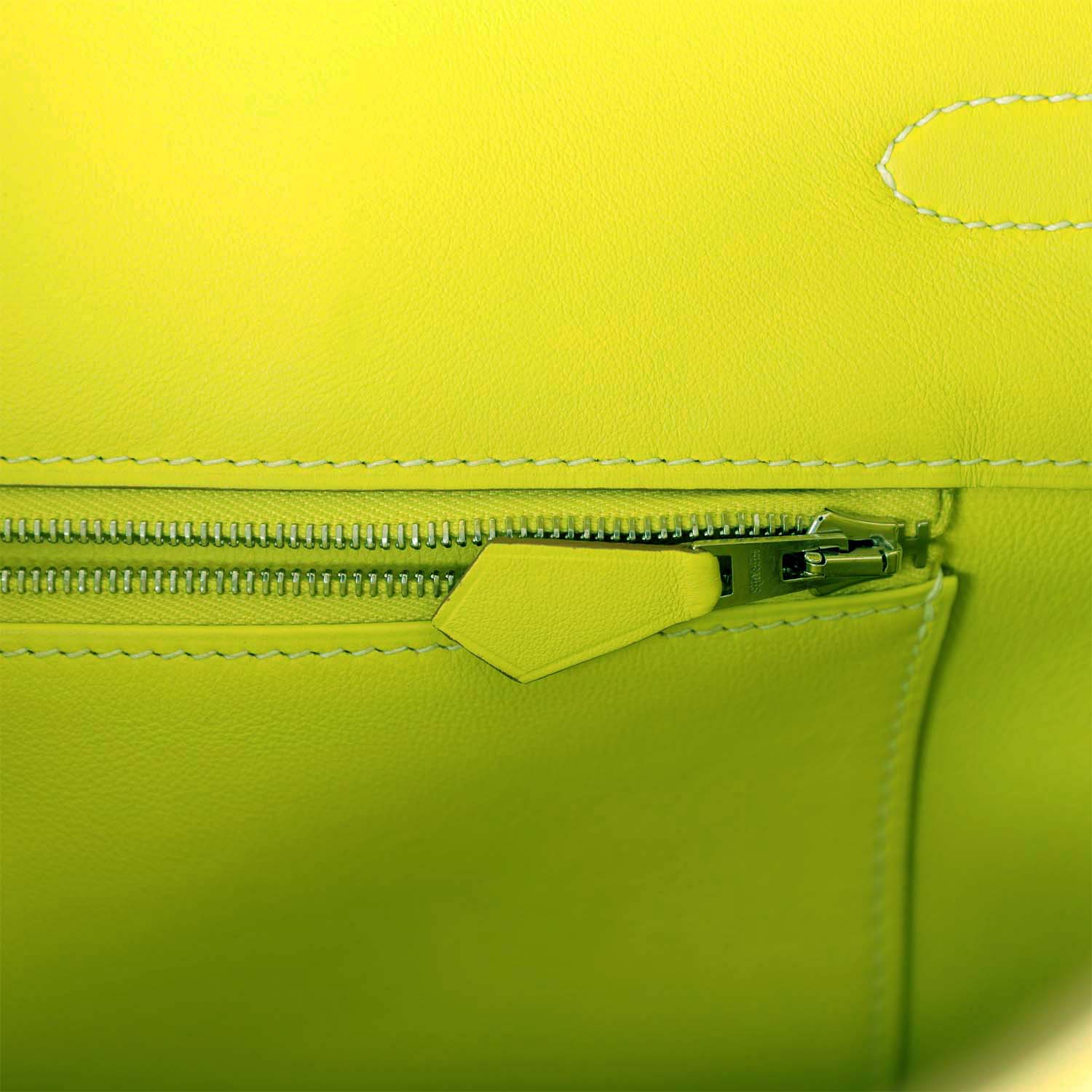 This Birkin is in Kiwi swift leather with palladium hardware and has contrast stitching, a front toggle closure, a clochette with lock and two keys, and double rolled handles.